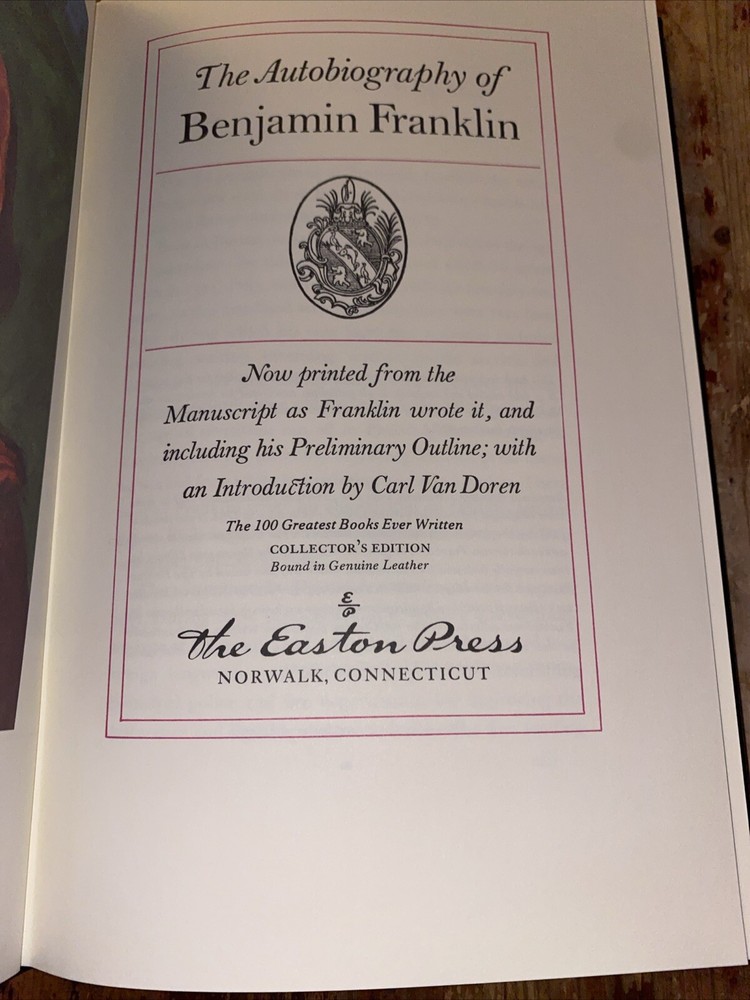 Discover the fascinating life of one of America's most iconic figures with "The Autobiography of Benjamin Franklin" by Easton Press. This collector's edition hardcover chronicle boasts a leather-bound design and features illustrations that bring the story of Franklin's life to life. Readers will be captivated by the nonfiction narrative that explores the topic of autobiography and the historical significance of Franklin's life. This vintage book, published in 1976, is a must-have for adults interested in biographies and true stories. With its original English language and absence of an inscription or personalization, this book is perfect for any bookshelf. Please ask questions as I prefer not to deal with refunds or returns.