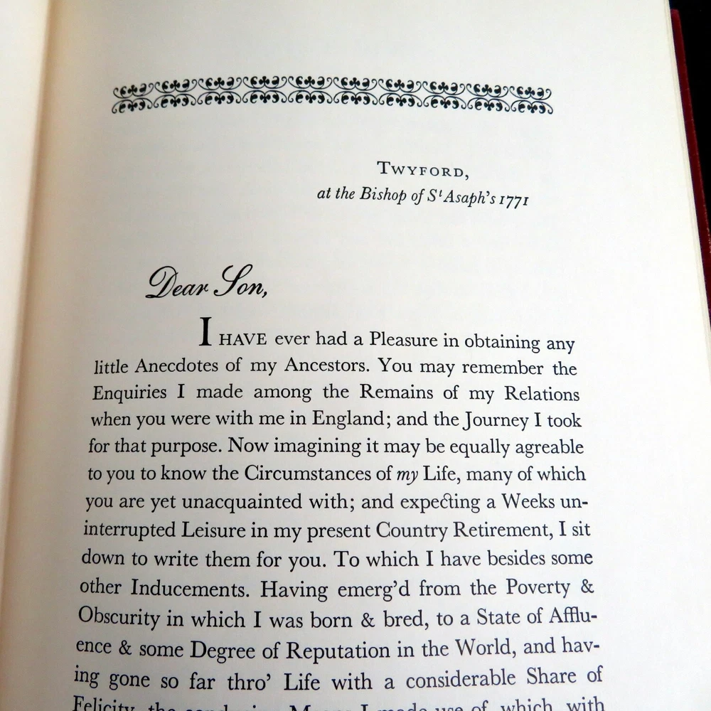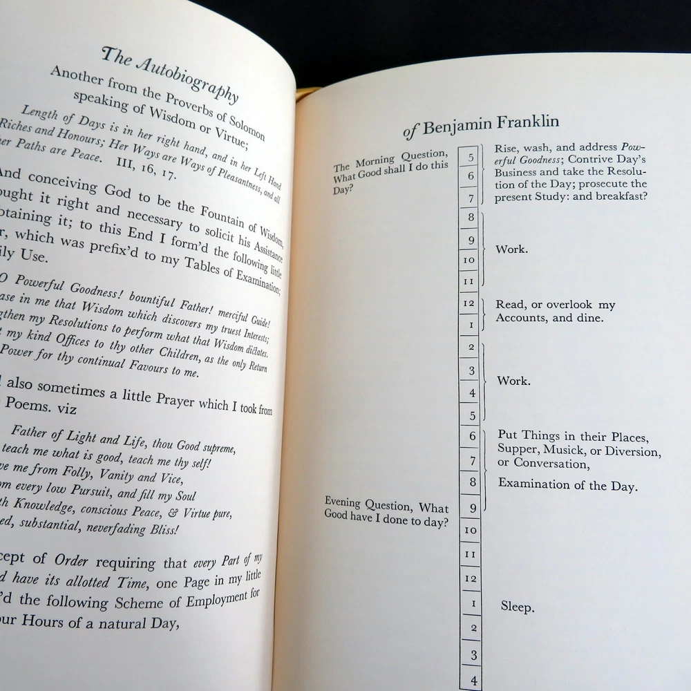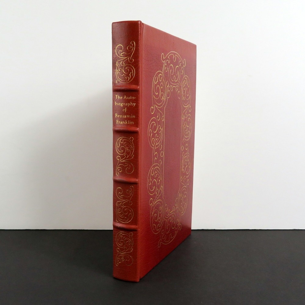 Title: The Autobiography of Benjamin Franklin Author: (as taken from the original manuscript) Illustrations: William Sharp Published: 1976, Easton Press - 100 Greatest Books Ever Written Hardcover book. Maroon leather over boards with giltstamp decorative front, back, and spine. All edges gilt. Silk moire endpapers. Bound in ribbon marker. Condition notes: Light sunfading to top front and side edges extending over spine. About: "The Autobiography of Benjamin Franklin" provides a firsthand account of the life and times of one of America's Founding Fathers. Franklin chronicles his rise from humble beginnings to his work as a printer, scientist, inventor, and statesman. This insightful work offers a glimpse into colonial America and Franklin's contributions to its development. Dimensions: 10 x 7" Pages: 233 Shipping weight: 4 lbs. SKU: 6582 Powered by SixBit's eCommerce Solution
