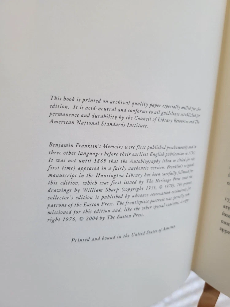 This is a hard cover leather collector's edition of The Autobiography of Benjamin Franklin, published by Easton Press in 2004, as one of 100 greatest books ever written collection.