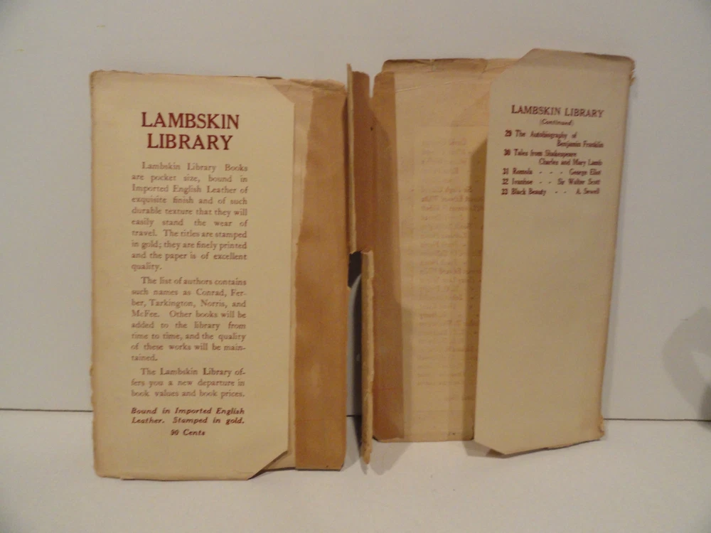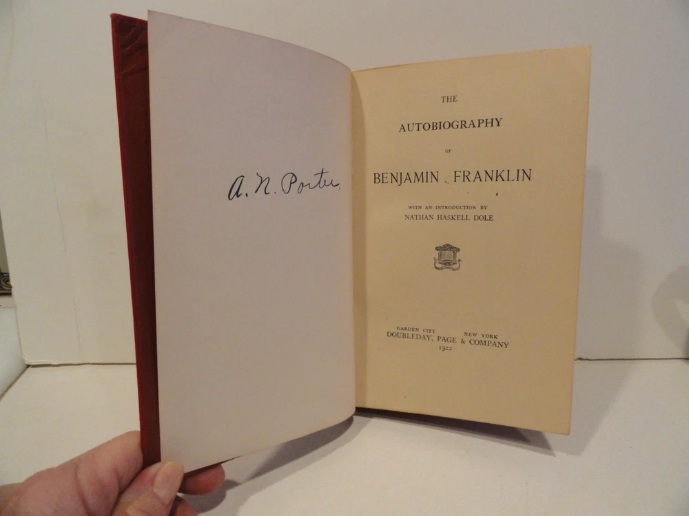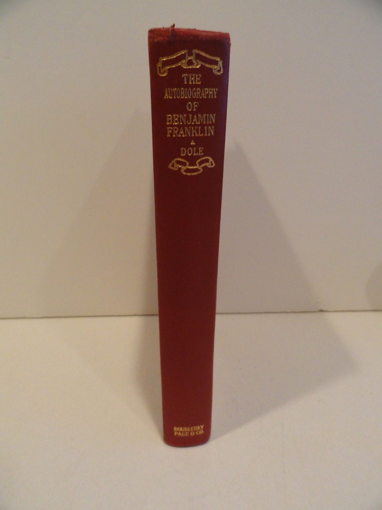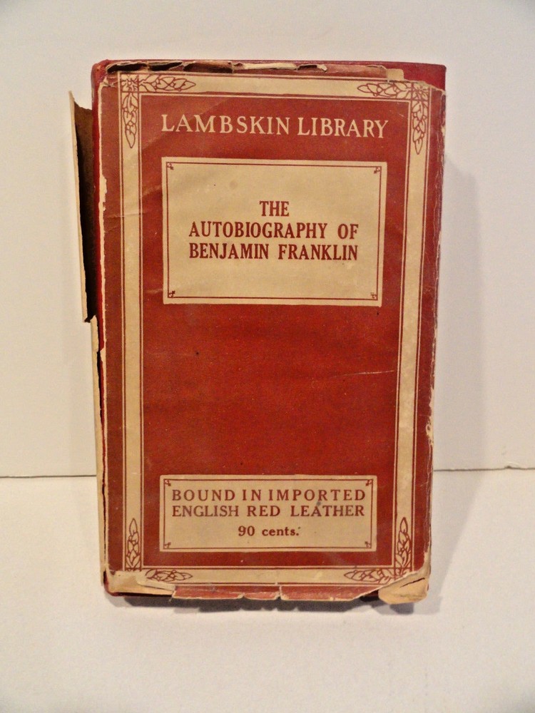 <div style="text-align:center"><img src="http://ti2.auctiva.com/sw/java.gif" border="0"><br><table align="center"><tr><td><a style="text-decoration:none" href="http://emporium.auctiva.com/shg111" target="_blank"><img src="http://ti2.auctiva.com/sw/images.gif" border="0"></a></td><td height="27px" valign="middle" align="center"><font face="arial" size="2"><b><a href="http://emporium.auctiva.com/shg111" target="_blank">shg111</a> Store</b></font></td></tr></table></div> THE AUTOBIOGRAPHY OF BENJAMIN FRANKLIN Garden City: Doubleday, Page & Company, 1922. Leather bound in Red Leather Number 29 in the Lambskin Library. Owner signed in ink, small corners missing on four pages, see pics. Dust-jacket has chips, tears, repairs, see pics.--otherwise a nice copy.