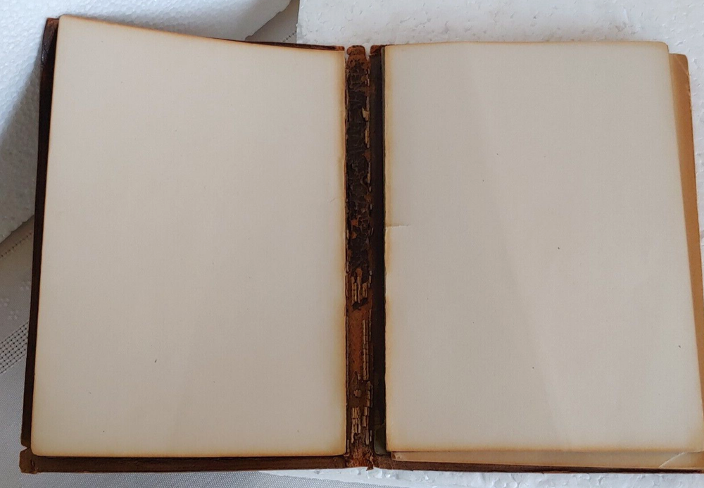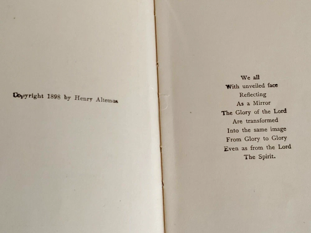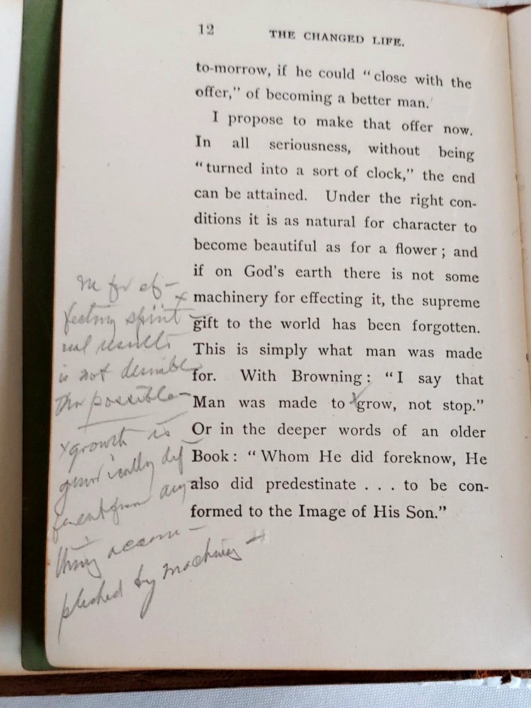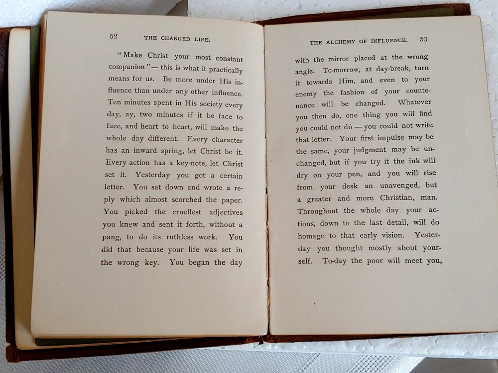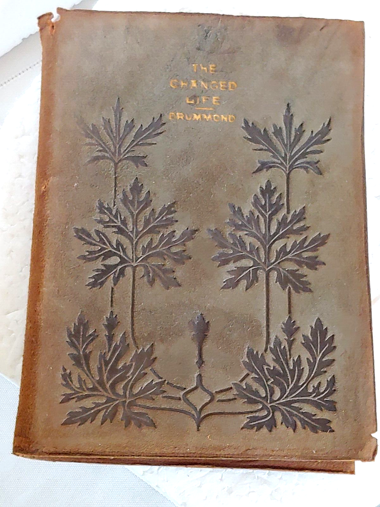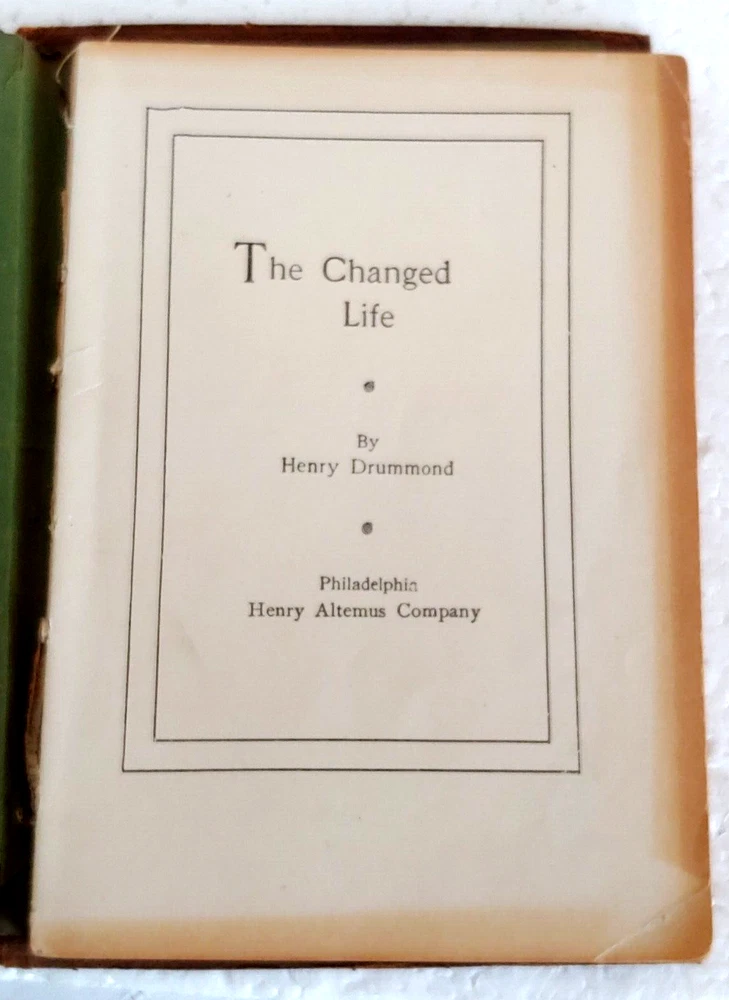 The Changed Life 1898 Henry Drummond - Antique Book 6 1/4" tall by 4 1/2" wide by 3/8" wide. Book was gifted in 1907 as a Christmas present and contains an inscription. This book is in fair to decent overall condition. There is wear to the cover, with color fade, a loose spine and deterioration in the cover corners. The pages show foxing and are brittle. A couple pages in the beginning of the book are loose and a couple pages have comment entries in pencil. The pages are in pretty decent overall condition. Please see the photos to get an idea of the overall condition of the book.
