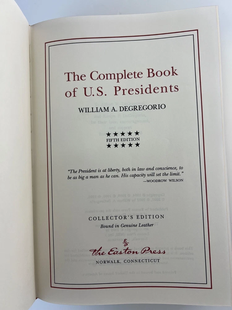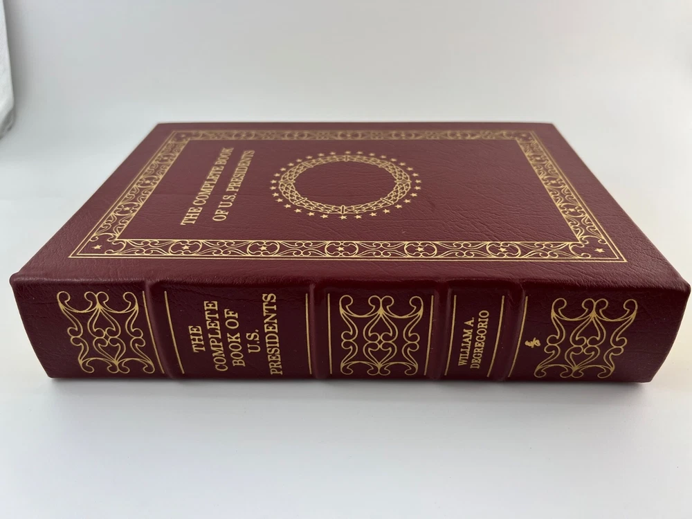 The Complete Book of U.S. Presidents - by William Degregorio - The Easton Press - Leather bound HC Pre-owned. Has some wear from previous use. Back of front cover has a name written on (shown in photo). This will make a very nice addition to your home library! Get this now at a great price! Please check all photos carefully to make sure the condition and contents meet your expectations. Please feel free to ask further questions. Thank you. Item will ship USPS Media Mail. Please allow up to 7 days for delivery.