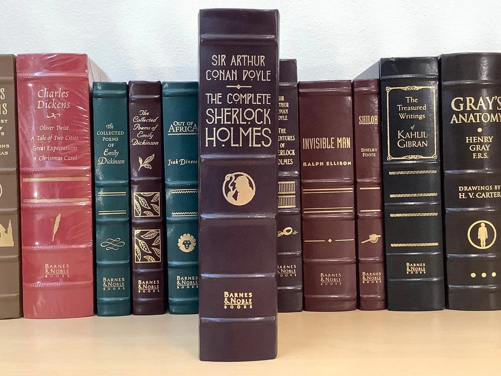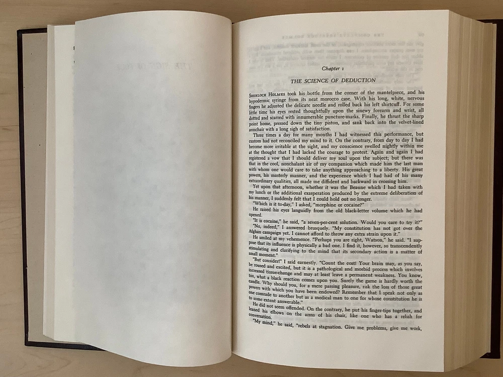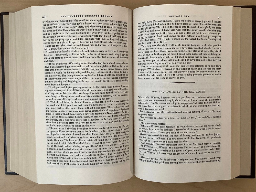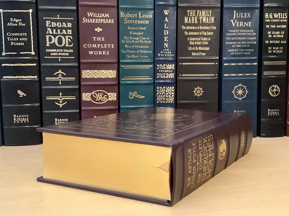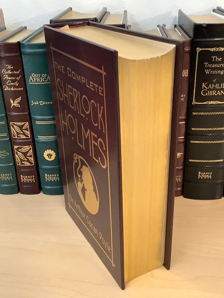The Complete Sherlock Holmes by Sir Arthur Conan Doyle bound in leather, with gilt edged pages and a ribbon marker contents A Study In Scarlet The Sign Of Four Adventures Of Sherlock Holmes Memoirs Of Sherlock Holmes The Return Of Sherlock Holmes The Hound Of The Baskervilles The Valley Of Fear His Last Bow The Case Book Of Sherlock Holmes Item Condition: This is a leatherbound hardcover in Very Good condition. There are no names, bookplates or stamps of previous owners inside. The binding is tight with a slight sag to the printblock (see photo #8), and the pages are clean. The gilt page edging is bright and shiny with some minor wear to it. The leather is in very nice condition and the gilt accents are bright. Dimensions are approx: 9.5” x 6.25" x 2" This book will ship in a box with bubble wrap. Photos are of the actual book that will be shipped.