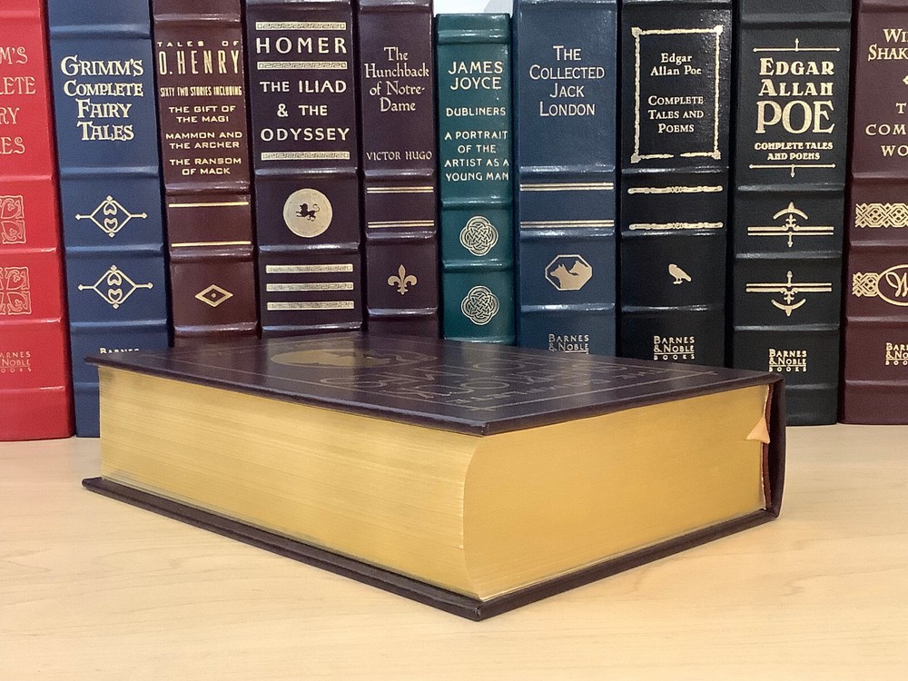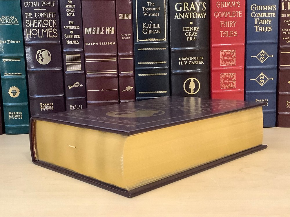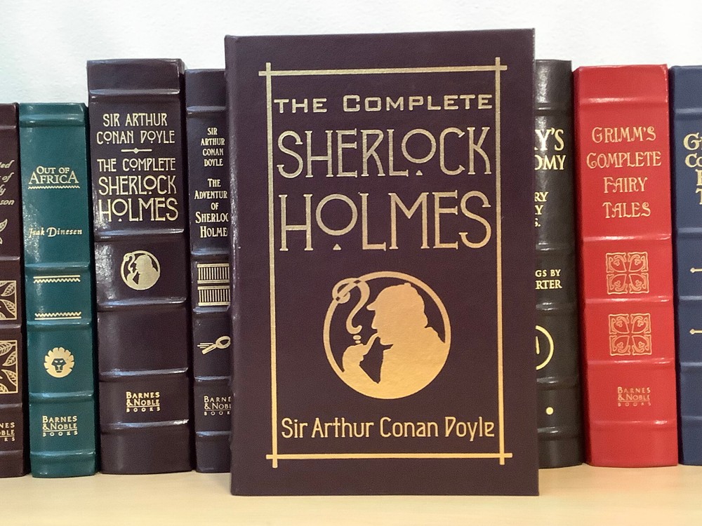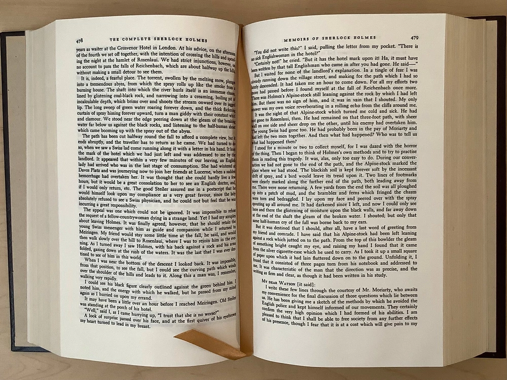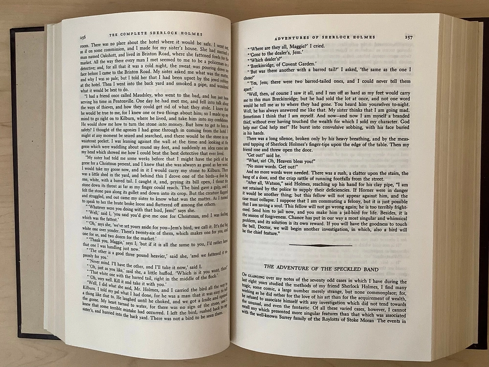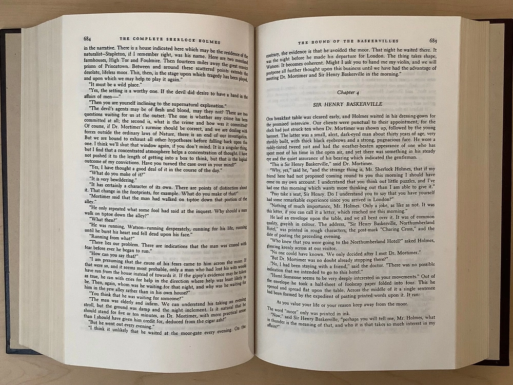The Complete Sherlock Holmes by Sir Arthur Conan Doyle bound in leather, with gilt edged pages and a ribbon marker contents A Study In Scarlet The Sign Of Four Adventures Of Sherlock Holmes Memoirs Of Sherlock Holmes The Return Of Sherlock Holmes The Hound Of The Baskervilles The Valley Of Fear His Last Bow The Case Book Of Sherlock Holmes Item Condition: This is a leatherbound hardcover in Very Good condition. There are no names, bookplates or stamps of previous owners inside. The binding is tight with a slight sag to the printblock (see photo #8), and the pages are clean. The gilt page edging is bright and shiny with some minor wear to it. The leather is in very nice condition and the gilt accents are bright. Dimensions are approx: 9.5” x 6.25" x 2" This book will ship in a box with bubble wrap. Photos are of the actual book that will be shipped.
