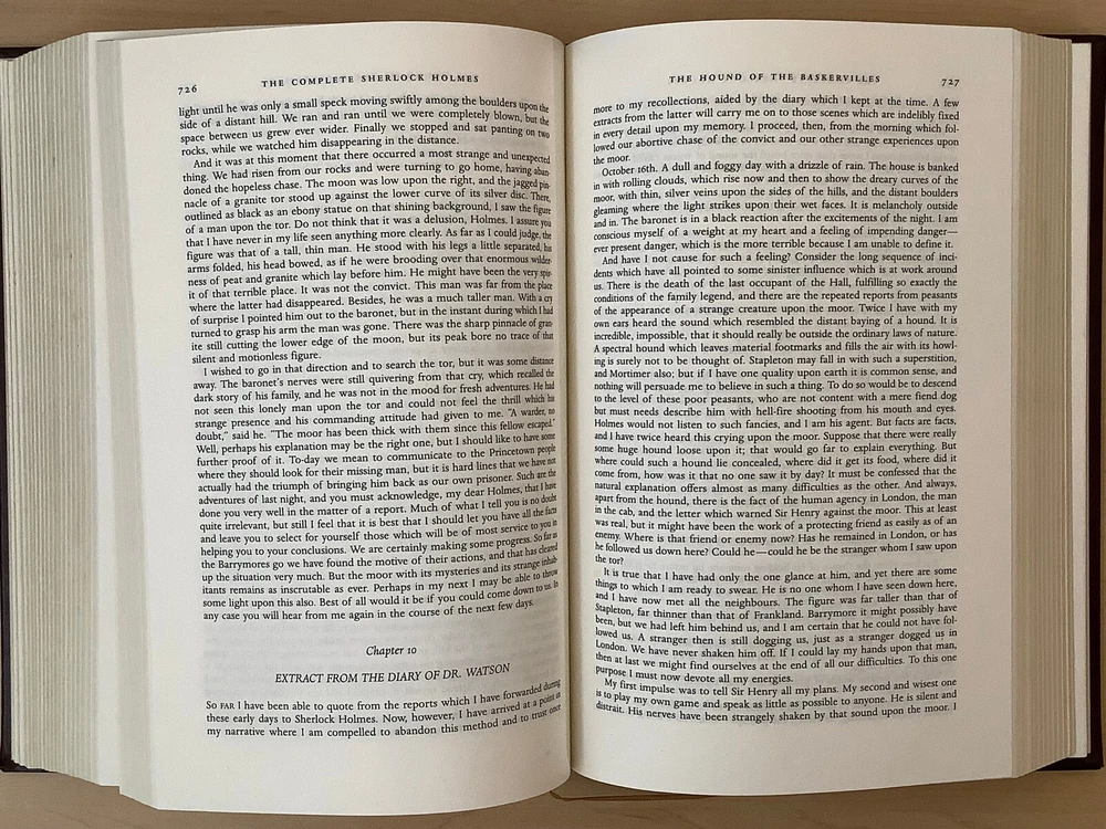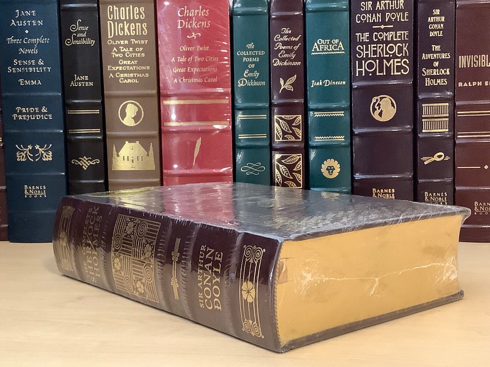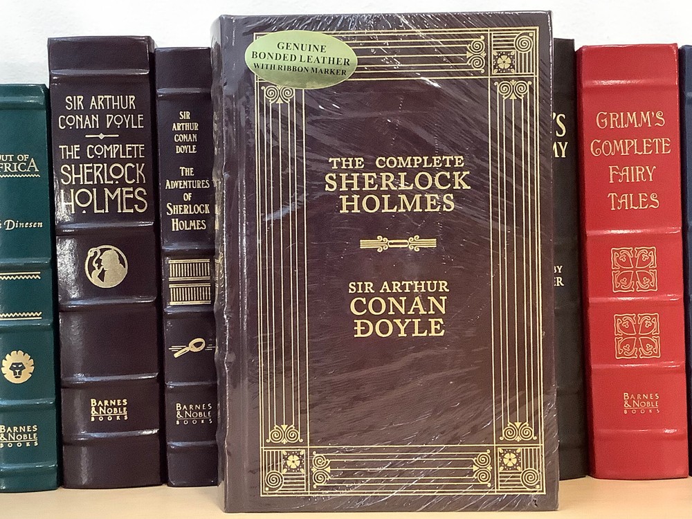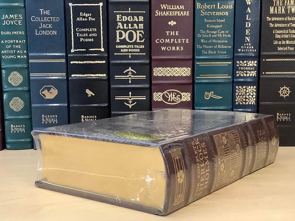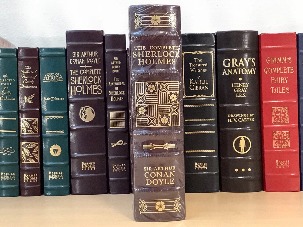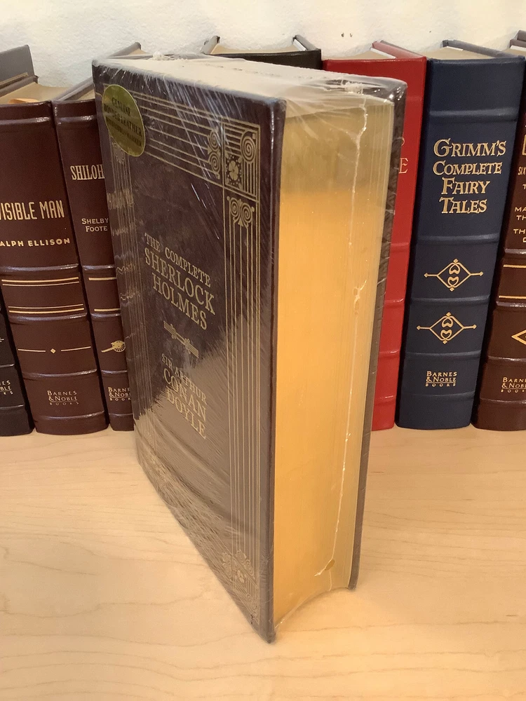 The Complete Sherlock Holmes by Sir Arthur Conan Doyle bound in leather, with gilt edged pages and a ribbon marker contents A Study in Scarlet The Sign Of Four Adventures of Sherlock Holmes Memoirs of Sherlock Holmes The Return of Sherlock Holmes The Hound Of The Baskervilles The Valley Of Fear His Last Bow The Case Book Of Sherlock Holmes Item Condition: This is a leatherbound hardcover sealed. The seal is beginning to open and there are some flaws / dings to the gilt page edging. The corners bumped, with some rubbing to them. Dimensions are approx: 9.5” x 6.25" x 2" This book will ship in a box with bubble wrap. Photos 1-8 are of the actual book that will be shipped, the rest are examples of the interior from an open copy.