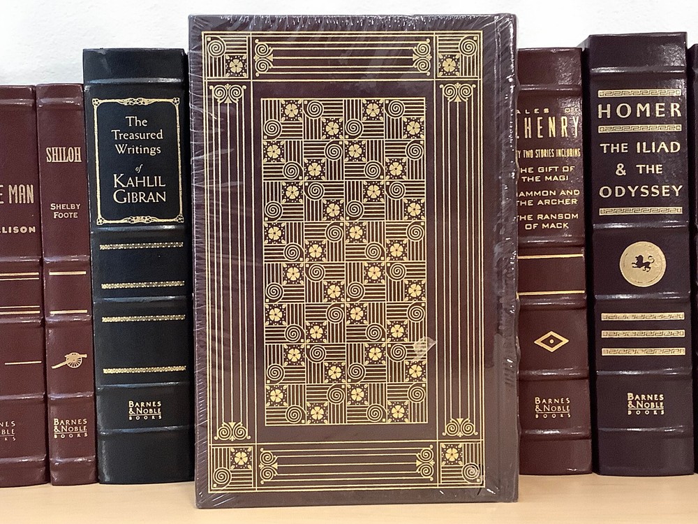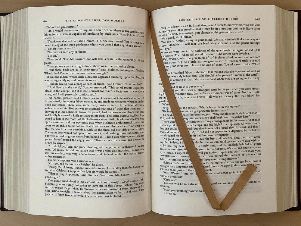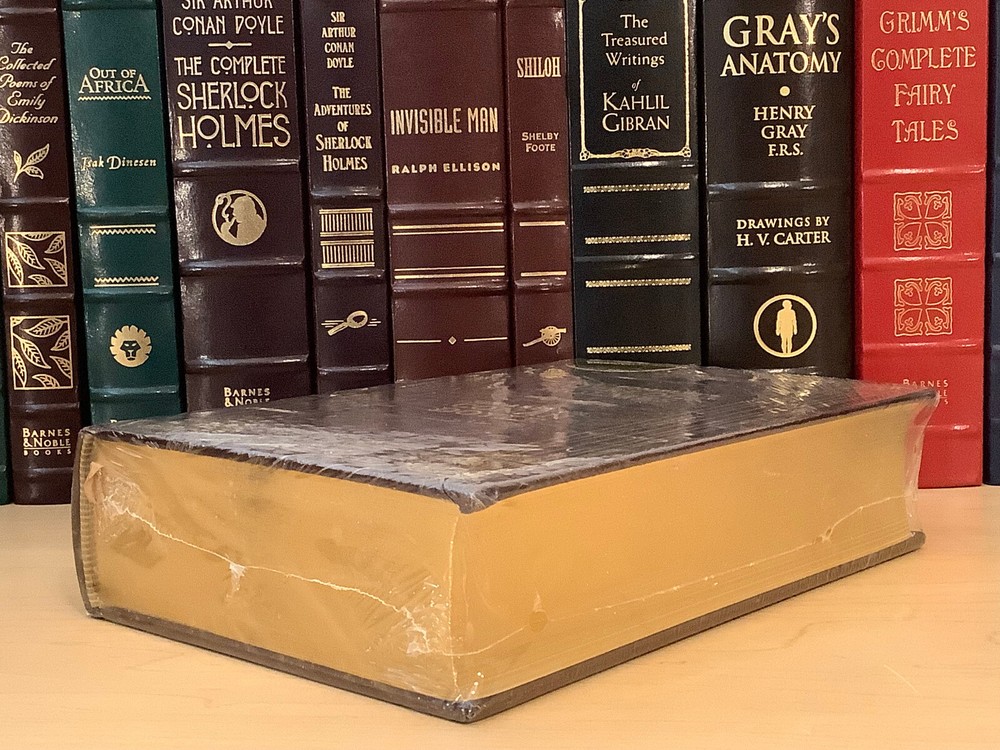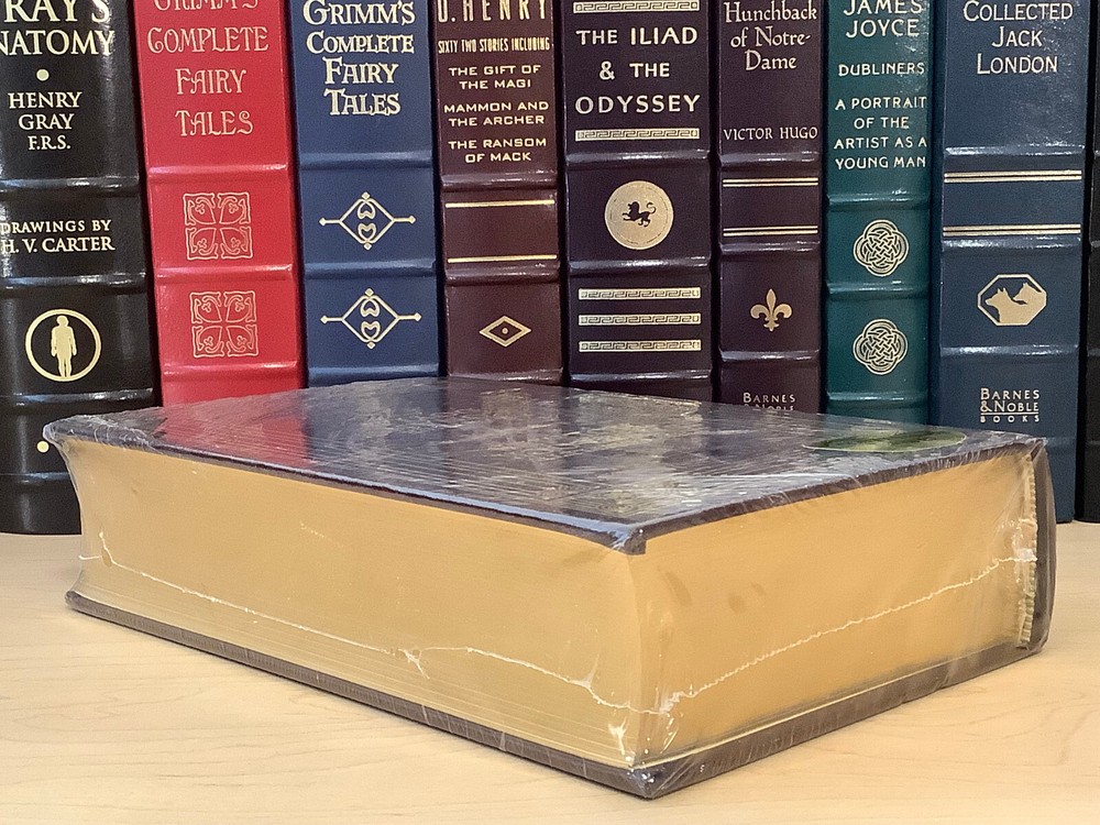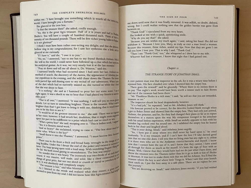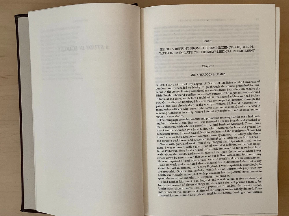 The Complete Sherlock Holmes by Sir Arthur Conan Doyle bound in leather, with gilt edged pages and a ribbon marker contents A Study in Scarlet The Sign Of Four Adventures of Sherlock Holmes Memoirs of Sherlock Holmes The Return of Sherlock Holmes The Hound Of The Baskervilles The Valley Of Fear His Last Bow The Case Book Of Sherlock Holmes Item Condition: This is a leatherbound hardcover sealed. The seal is beginning to open and there are some flaws / dings to the gilt page edging. The corners bumped, with some rubbing to them. Dimensions are approx: 9.5” x 6.25" x 2" This book will ship in a box with bubble wrap. Photos 1-8 are of the actual book that will be shipped, the rest are examples of the interior from an open copy.