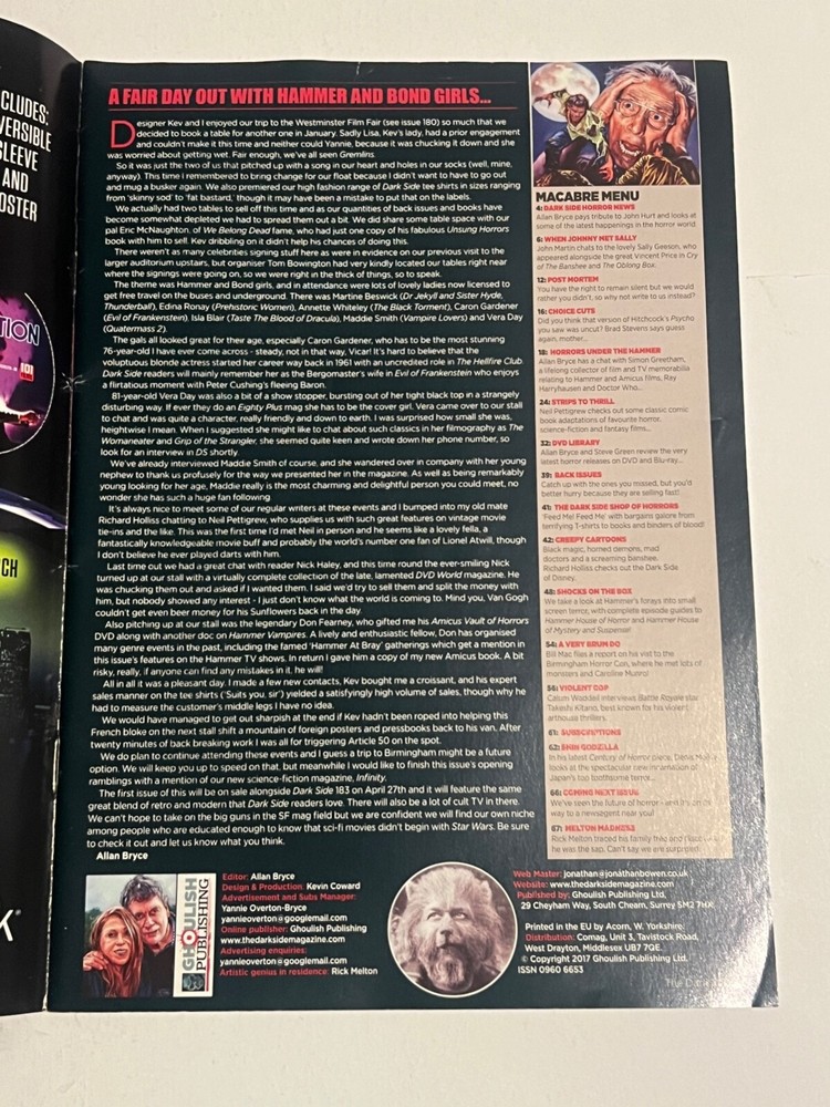 Delve into the world of horror and the macabre with issue #182 of The Dark Side Magazine, a cherished publication for aficionados of the genre. Published in 2017 by Goulish Publishing, this edition is a treasure trove of articles, interviews, and features that cater to fans of horror and monster themes. With its roots in the United Kingdom, this English-language magazine offers a deep dive into the latest in horror comics and film, including exclusive coverage of 'Godzilla Returns' and 'Darkest Disney'. It's a must-have for collectors and enthusiasts seeking a comprehensive look at the horror landscape without the commitment of a subscription. Magazine are stored in a clean, smoke and pet free area. My personal collection for many years. Photos included are of the actual Magazine(s) Purchases ship via USPS Ground Advantage, Combined shipping is available for multiple purchases. I ship to all 50 US States if you have any questions, please ask prior to bidding. check out other exciting Comics, Books and Magazines for sale on this eBay page Thank You....