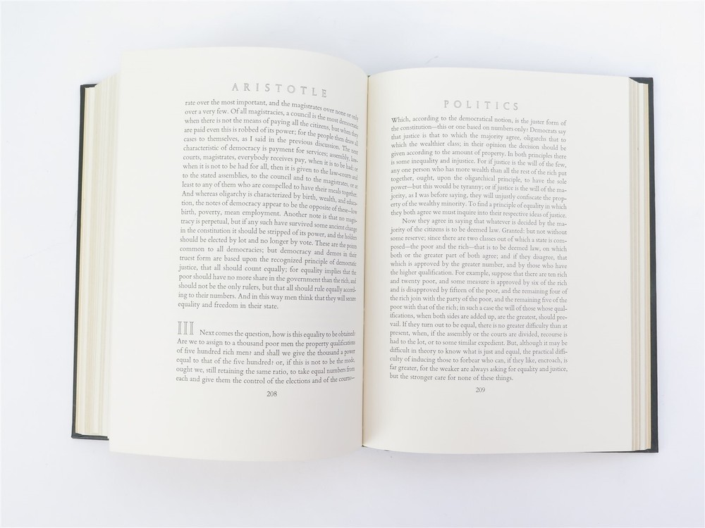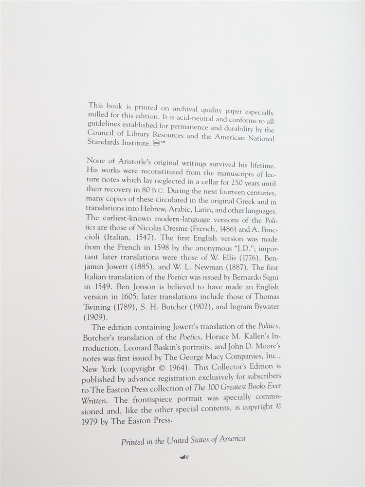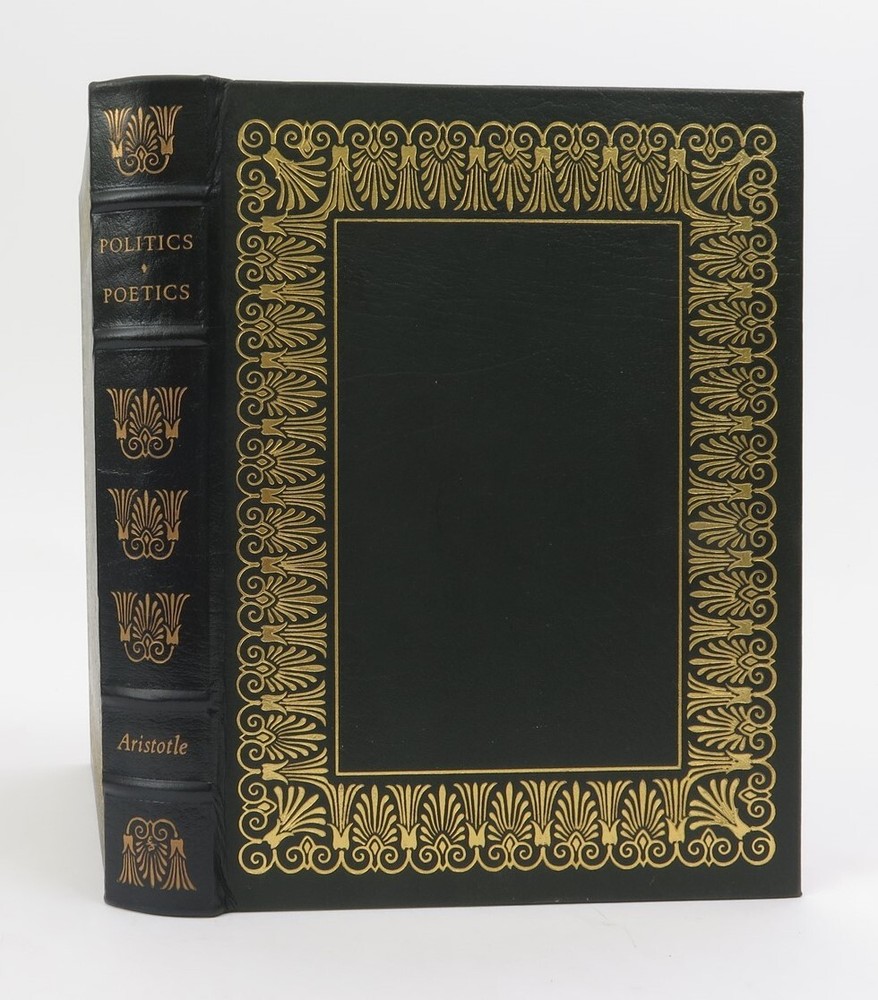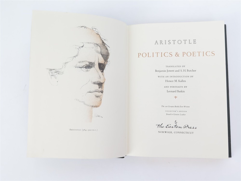 Politics and Poetics by Aristotle Illustrated by Leonard Baskin The Easton Press Leather Bound 1979 Condition: VG+ and seemingly unread with gold gilt edges. Clean edges and no major markings. Please see the detailed listing images for the overall condition.