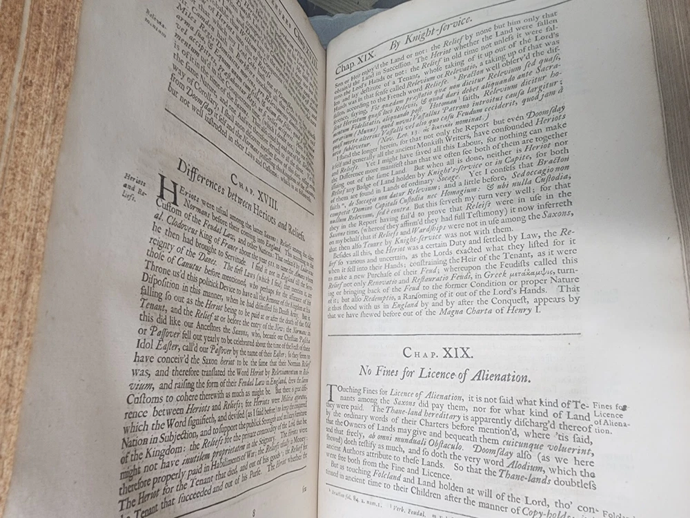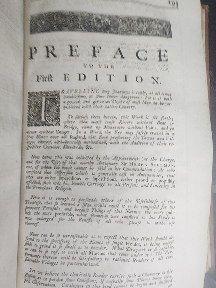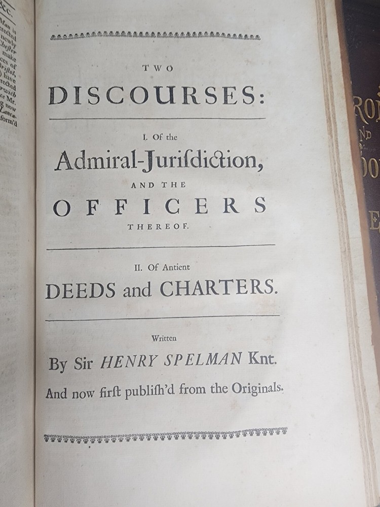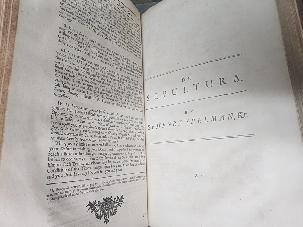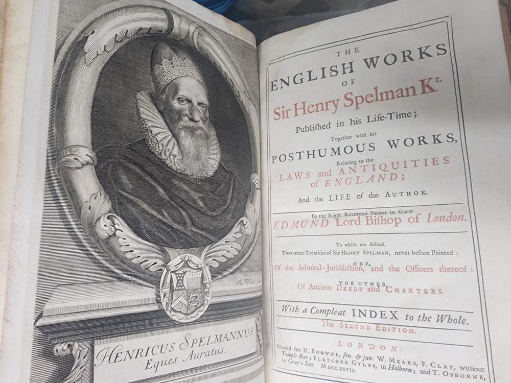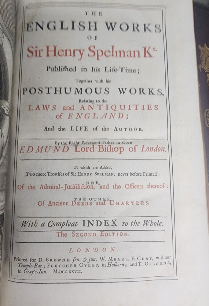 Full Tooled Leather Over Boards. Hinges Split And Tender."The English Works Of Sir Henry Spelman K. Published In His Life-Time: Together With His Posthumous Works, Relating To The Laws And Antiquities Of England: And The Life Of The Author." By The Right Reverend Father In God Edmund Lord Bishop Of London. To Which Are Added, Two More Treaties Of Sir Henry Spelman, Never Before Printed: One Of The Admiral-Jurifdiction, And The Officers Thereof: The Other Of Ancient Deeds And Charters. With A Compleat Index To The Whole. The Second Edition. London: Printed For D. Browne, Fen. & Jun. W. Mears, F. Clay, Without Temple-Bar, Fletcher Gyles, In Holborn, And T. Osborne, In Gray's-Inn. M.Dcc.Xxvii. Tooled Leather Over Boards, Raised Bands With 7 Compartments Raised And With Extra Gilt. On Spine With Title In Gilt. Folio. Evidence For Inclusion In Wythe's Library Wythe Referred To Spelman's Works In His Case Report For Field V. Harrison, "Sir H. Spelman Somewhere Condemns The Common Lawyers Of His Own Time, For The Small Acquaintance They Had With The Principles And Rationale Of Their Profession."[6] Brown's Bibliography[7] Includes The First (1723) Edition Of The English Works Of Sir Henry Spelman As The Work Intended By Wythe's Reference. He Bases The Selection Of This Title And Edition In Part On The Copy Thomas Jefferson Sold To The Library Of Congress In 1815.[8] The Wolf Law Library Followed Brown's Suggestion And Purchased A Copy Of The Same Edition.