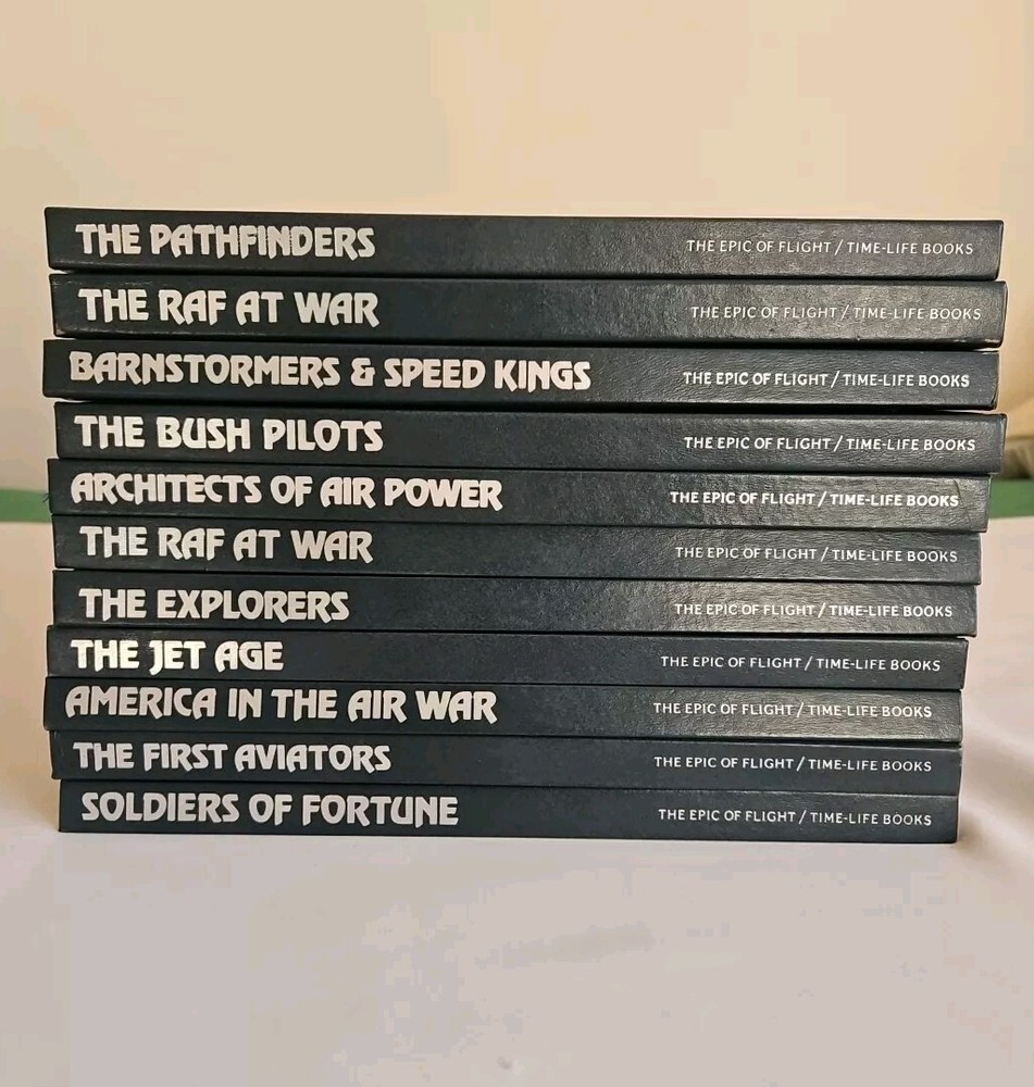 Take to the skies with this amazing set of 11 hardback books from Time Life Books titled "The Epic of Flight". This limited edition set covers the history of aviation and features stunning illustrations by Attilio Micheluzzi. The books are in English and vary in size, with the largest measuring 11 inches in length and 9 inches in width. The set includes books on topics such as airplanes, history, and aircraft, making it perfect for young adults, ages 9-12, and adults alike. The books are faux leather bound and feature an ex libris, adding to their vintage charm. This first edition set was published in 1981 and is a must-have for any aviation enthusiast or collector. Pre-owned Excellent condition Please see last 4 pics...all books are in Excellent condition except for The Raf At War. There's some damage on the cover.