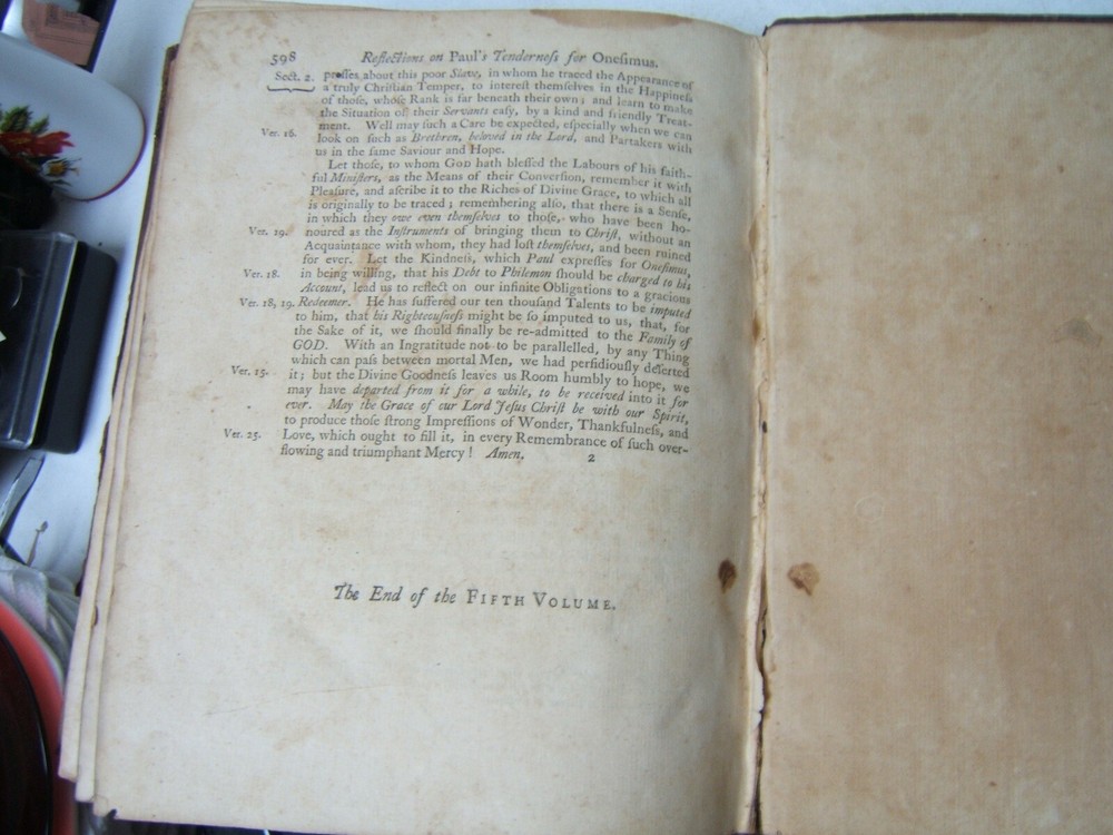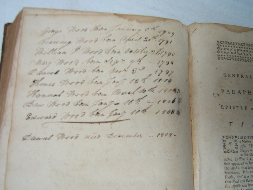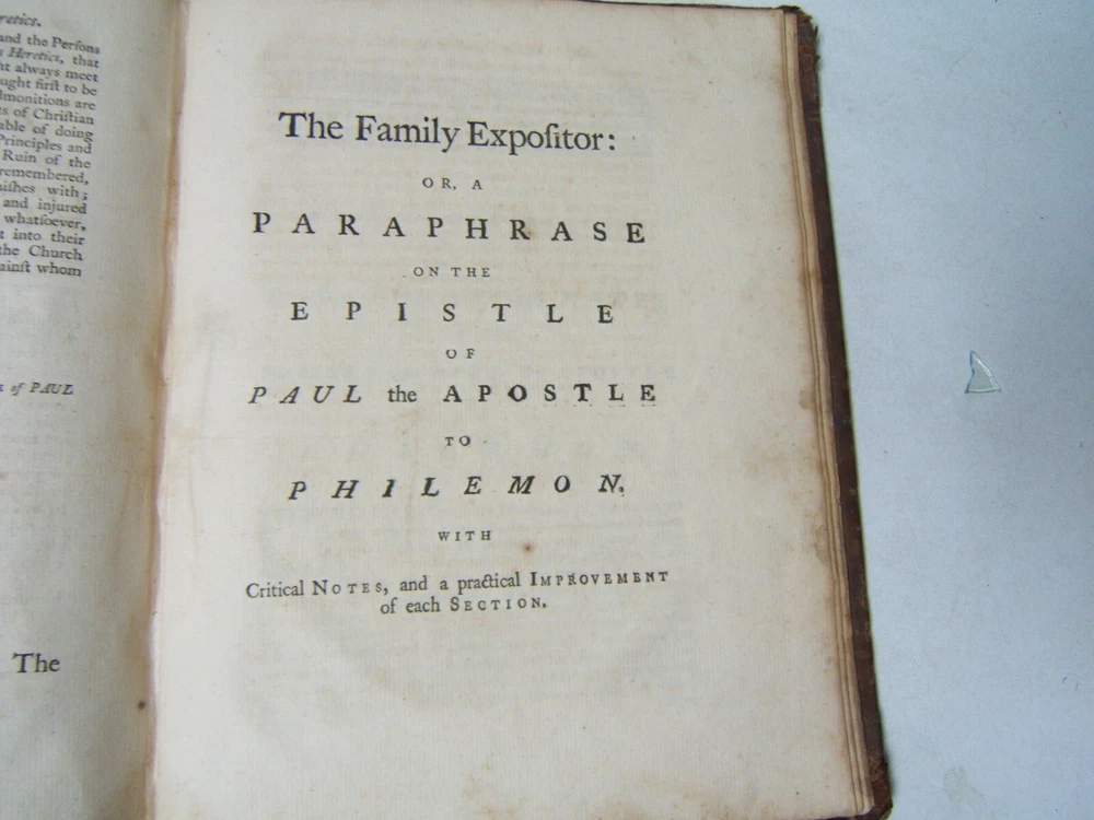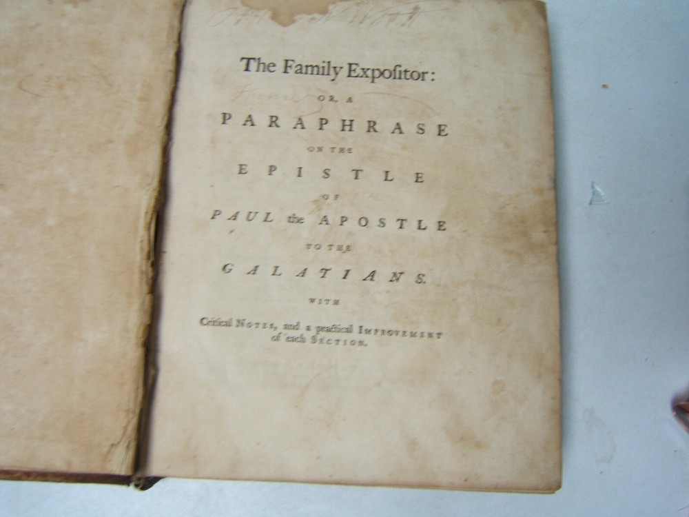 The Family Expositor or Paraphrase of New Testament Vol. V Leather circa 1760 The Family Expositor or Paraphrase of New Testament Vol. V Leather circa 1760 Click images to enlarge Description ? The Family Expositor or a paraphrase and version of the New Testament Volume V - Paul's Letter to the Galatians to Paul's Letter to Philemon Missing the title page so publisher and edition not available. Appears to date to the second half of the 18th Century. Leather bound. Spine has been chipped and nibbled. Covers are attached but hinges are weak. Pages do not have writing. There is foxing throughout. Family history of the births of members of the Wood family on a blank page in the middle of the volume. First listing is a birth of George Wood, born in 1789. Other family members listed are Reading, William, Mary, Daniel, Thomas, Hanna, Ann (?) and Edward. Housed with religion books Payment Paypal Shipping Domestic shipping: Weight based Shipping Charges. Domestic Carriers are: Usps Book Rate International shipping: Weight based Shipping Charges. International Carriers are: Usps Priority Intl I will ship to: United States, Worldwide Weight: 4 lbs. 8 oz. Shipping and Handling: Please check eBay's Shipping & Payment tab Thank you for visiting the Juniata General Store. We are located in the heart of Central Pennsylvania just up the road from the beautiful Juniata River. We offer a wide variety of merchandise, both new and vintage. Most of our inventory is one of a kind items and we add new items constantly so check back often. Vendio Images: More than just a pretty image. 250+ Mobile Responsive & Active Content Free Listing Templates with Vendio Sales Manager. Vendio provides powerful selling automation for sellers of all sizes. Get business information that counts! - Vendio Counters are active content free.