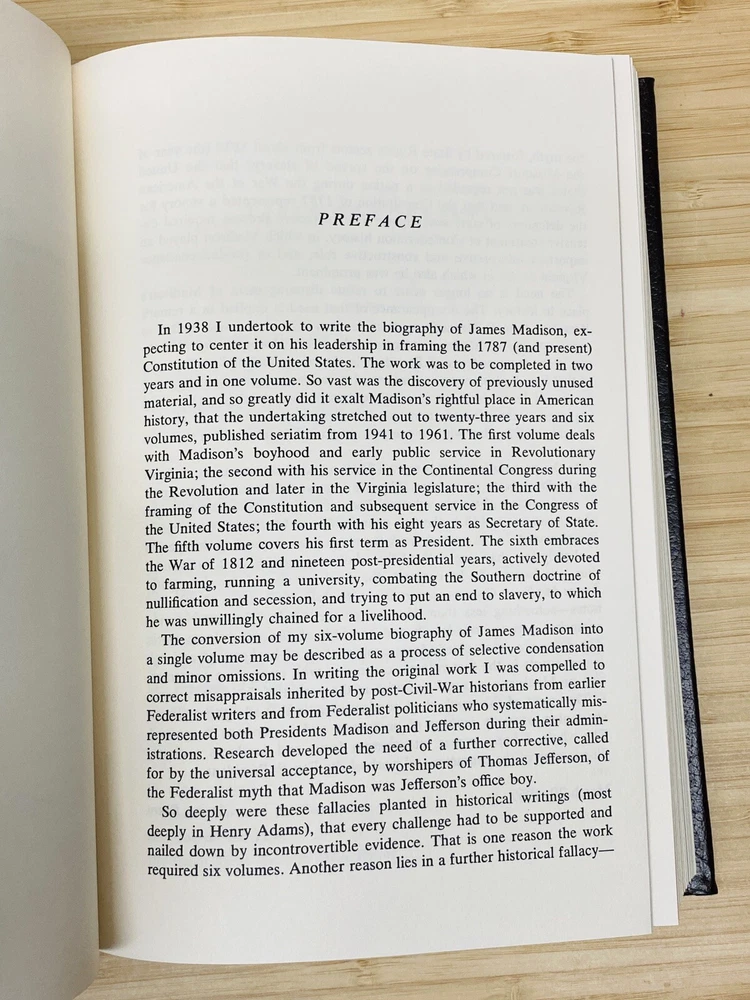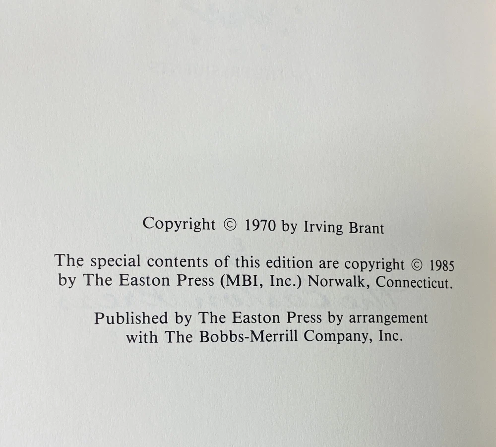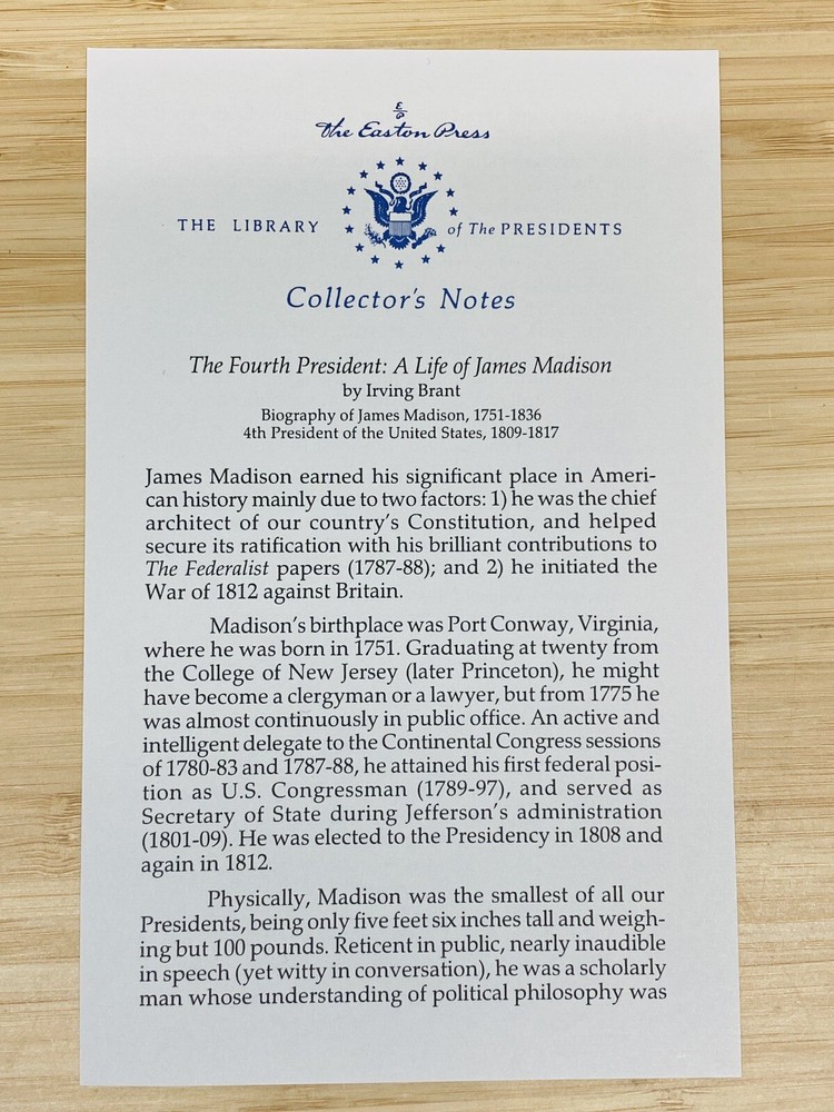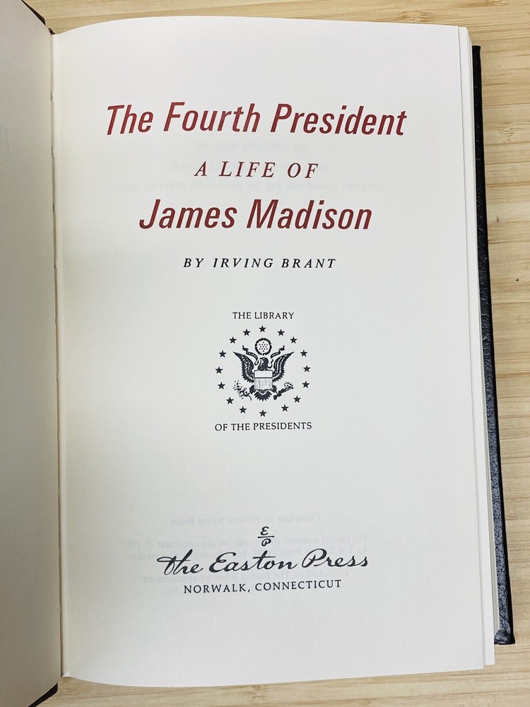 This is a must-have for any collector of rare books. The Fourth President: A Life of James Madison, by Irving Brant, is a beautifully bound leather collector's edition published by Easton Press. This book is a biography and autobiography of James Madison, the fourth President of the United States. It is a treasure trove of historical information and is sure to impress any history buff. The binding is exquisite and the pages are in excellent condition. This book is a great addition to any library and is sure to be a conversation starter. Book is in excellent conditon, a previous owners bookplate is affixed to inside of front cover but otherwise the book is in excellent condition.