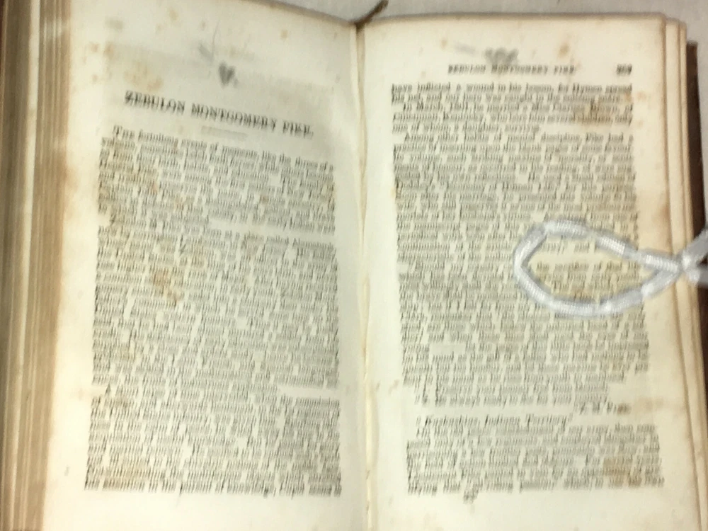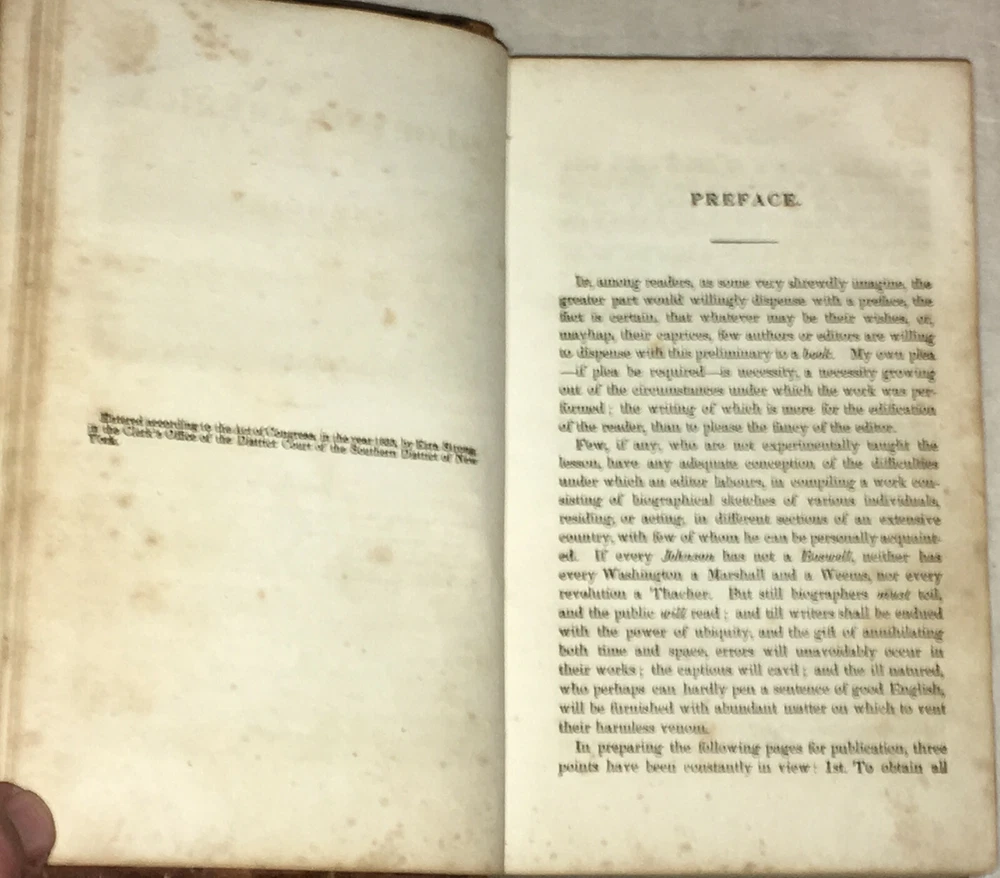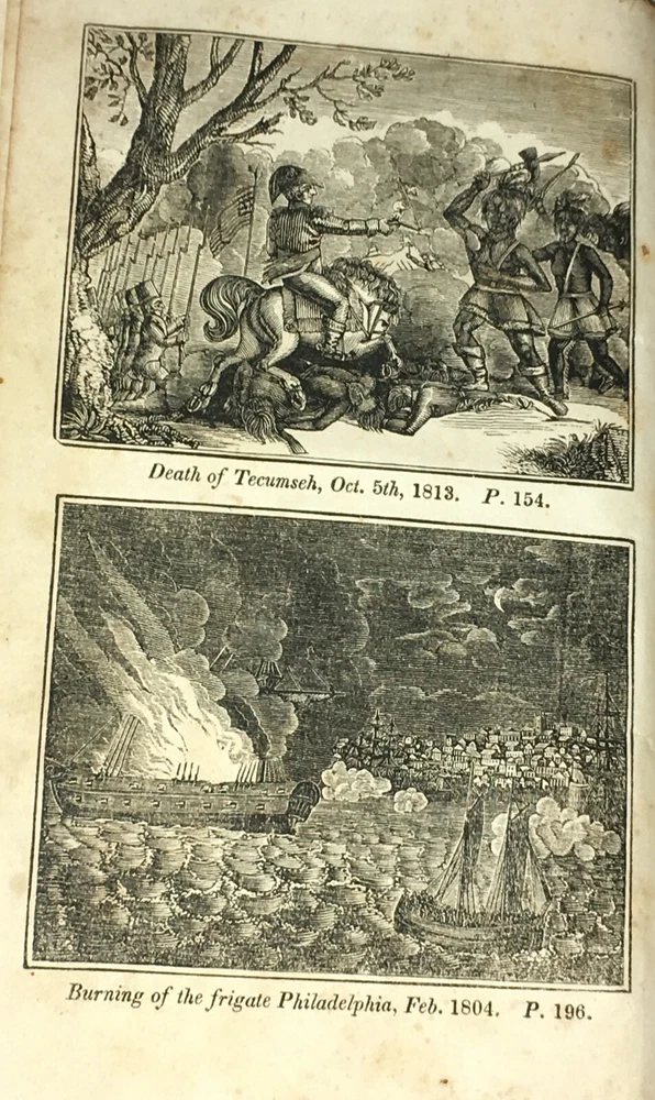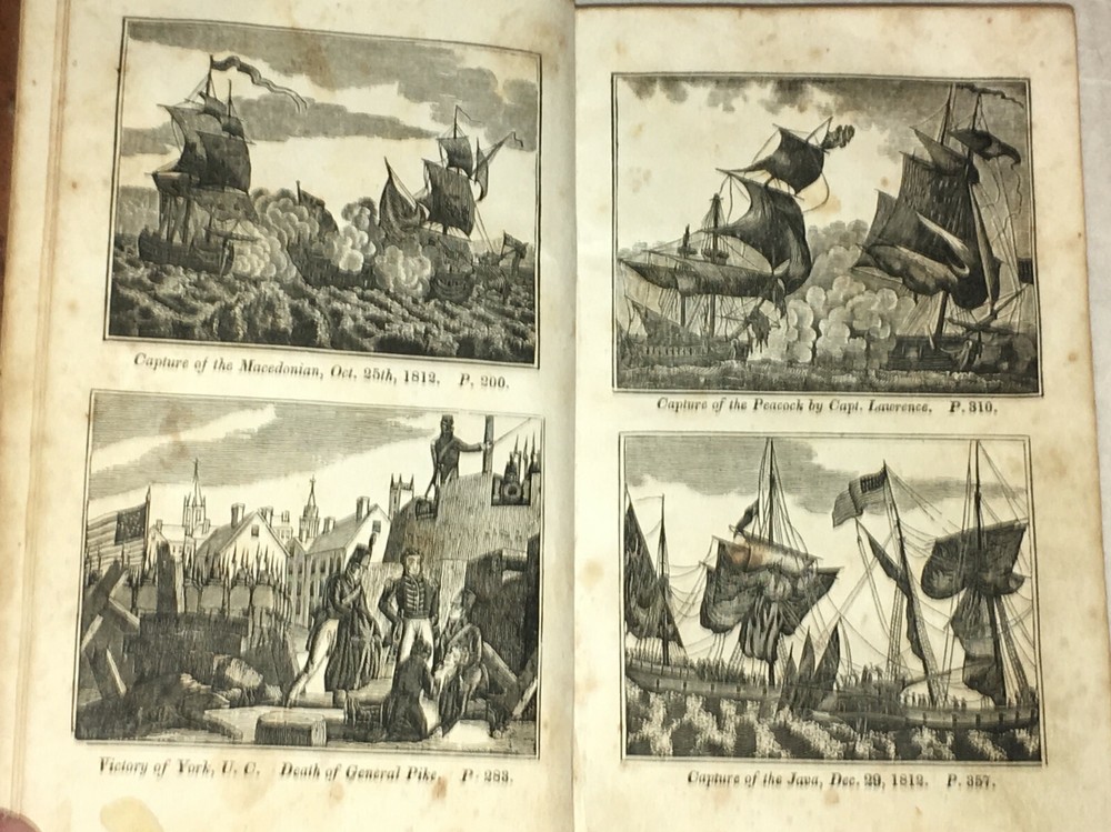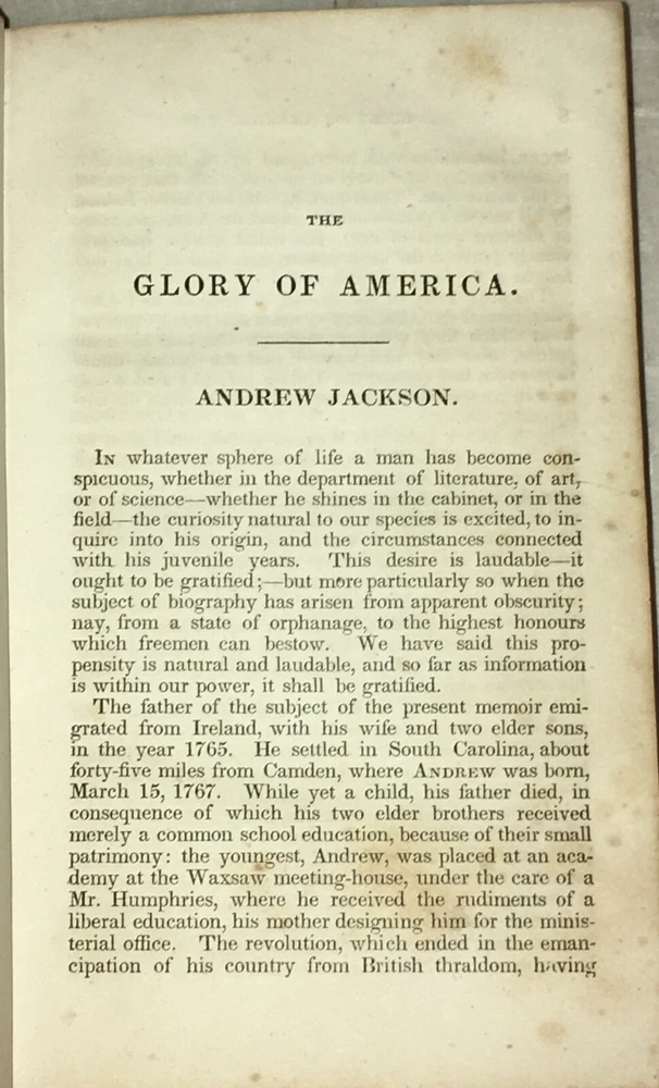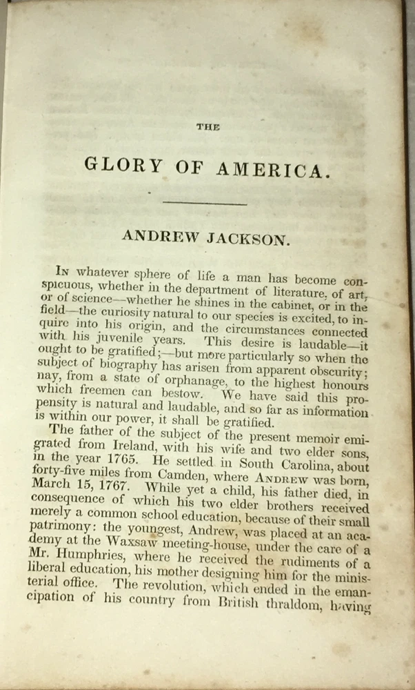 The Glory of America Memoirs of the Late War with Great Britain New York: 1834 Andrew Jackson, Zebulon Montgomery Pike, et al. R. Thomas. The Glory of America; comprising Memoirs of the Lives and Glorious Exploits of some of the Distinguished Officers engaged in the Late War with Great Britain, .... Embellished with plates from original designs. By R. Thomas. New York: Published by Ezra Strong, 1834. First edition. Twelvemo, signed in sixes (7.25 x 4.25 inches). Collates complete. 574 [1, Contents] pages. With six inserted engraved plates, with two engravings per plate, total of 12 engraved battle scenes of the War of 1812. Full contemporary mottled calf, rubbed and worn, especially around edges and corners, with some surface loss. A couple faint dampstains to edges. Joints and hinges cracking and tender, but holding. Evidence of an expert earlier reback. Sheets clean with moderate foxing that is heavier in places. Some spots of soiling, a couple slight edge tears noted. name on front free endpaper, slight tear to endpaper at bottom fore-edge. Altogether, a still very handsome copy in very good condition. An extremely rare book in this condition and complete.