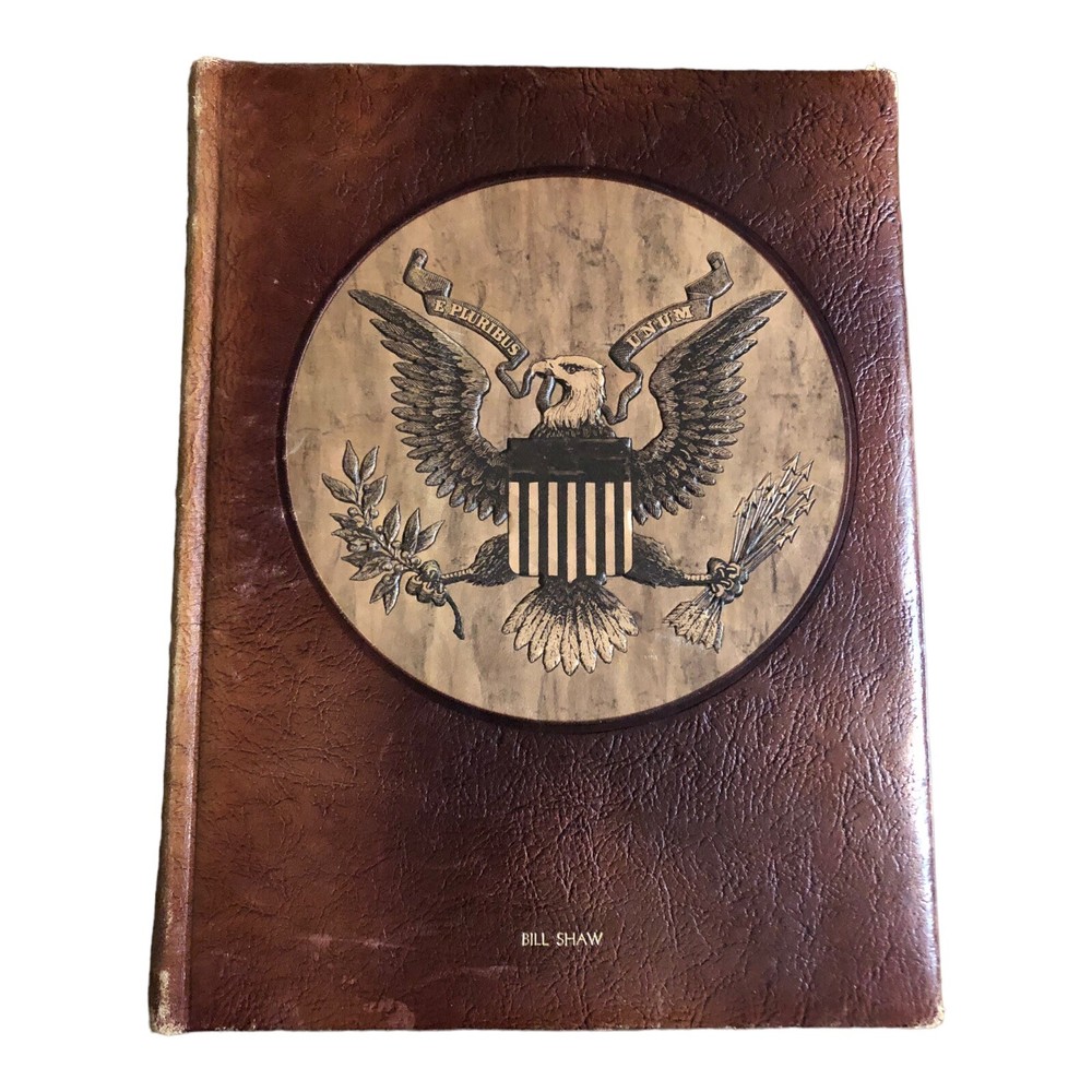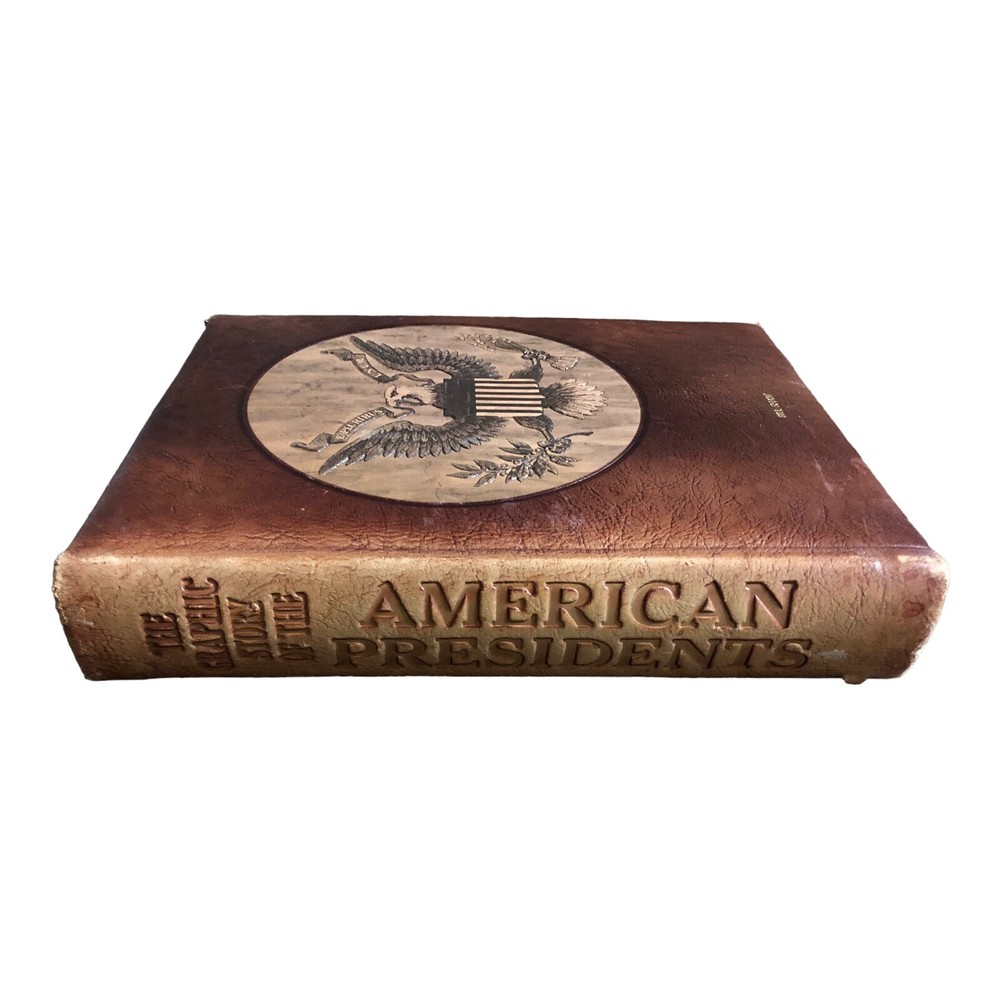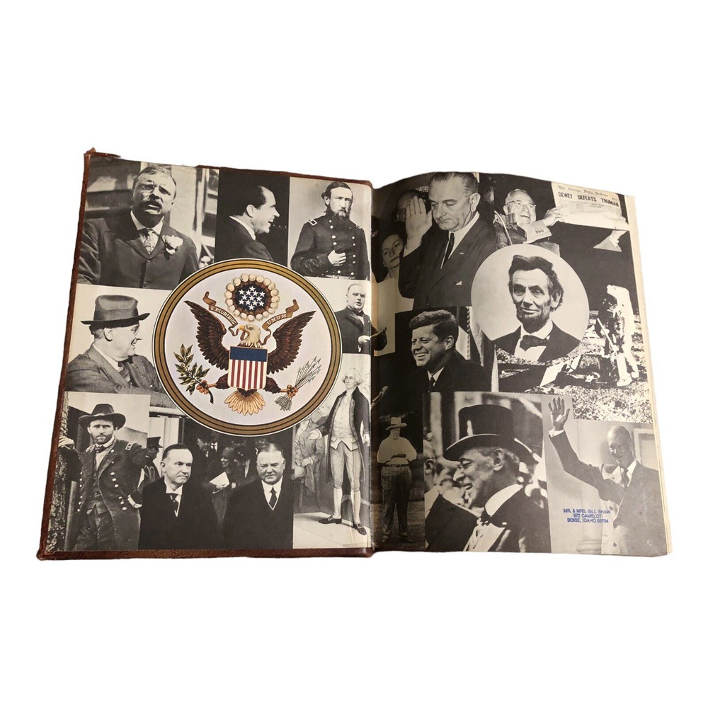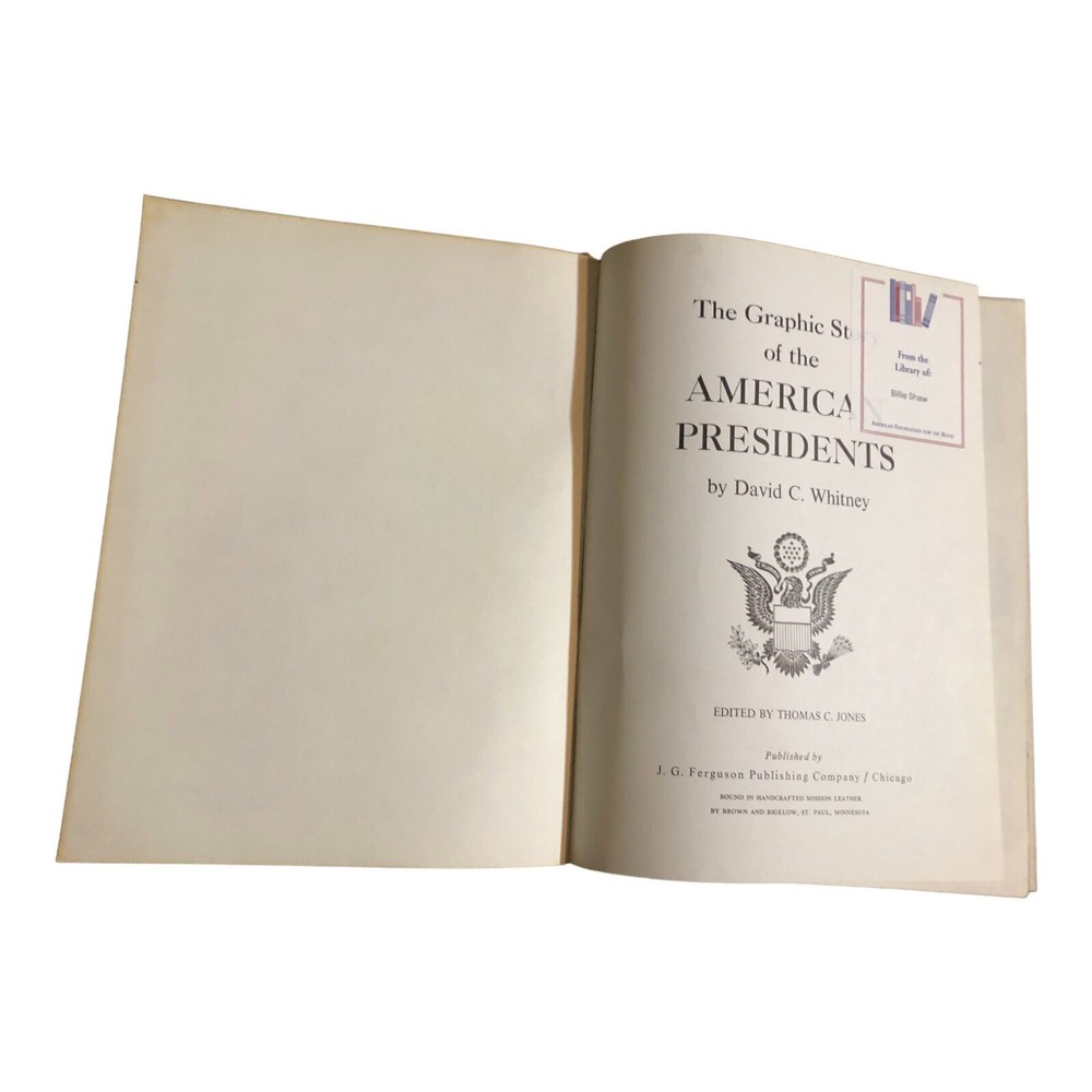 The Graphic Story of the American Presidents by David C. Whitney. Published by J. G. Ferguson Publishing Company, 1972. Bound in handcrafted mission leather. The leather has some scuffing and age wear around the corners and edges. This book was personalized to its previous owner. The front cover has a name embossed on the bottom, the first cover page has a name stamp, and the second cover page has a library sticker. No writing or markings anywhere else within the book. Overall in good clean condition