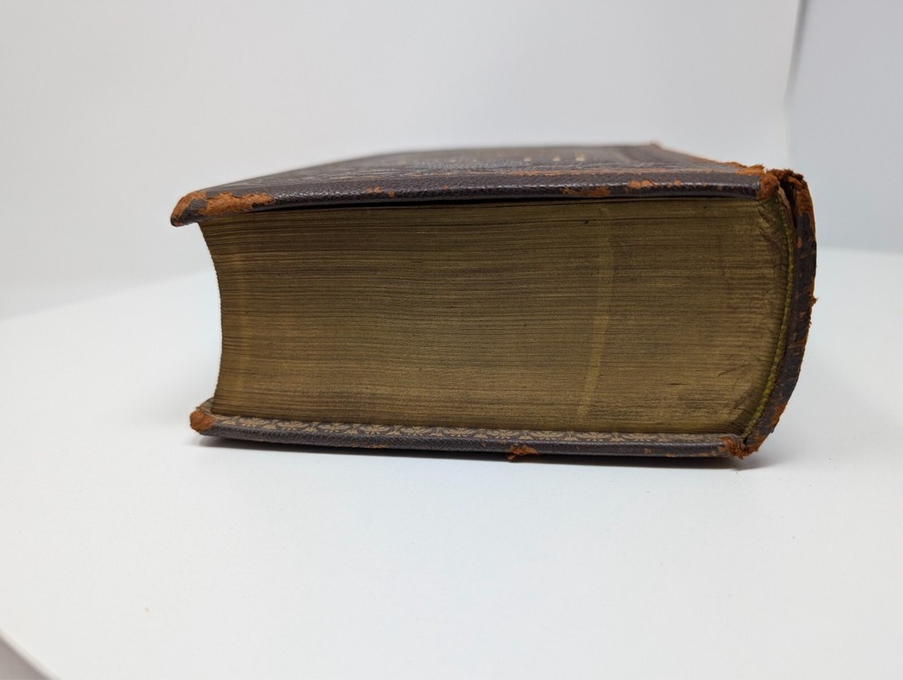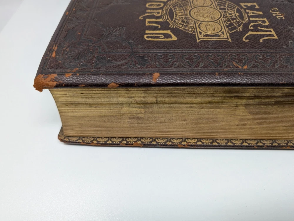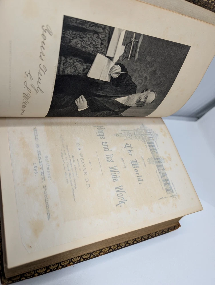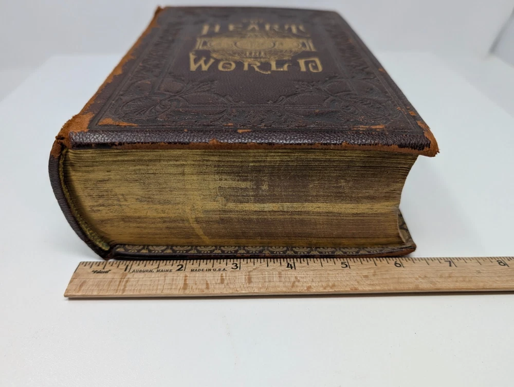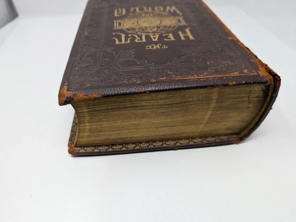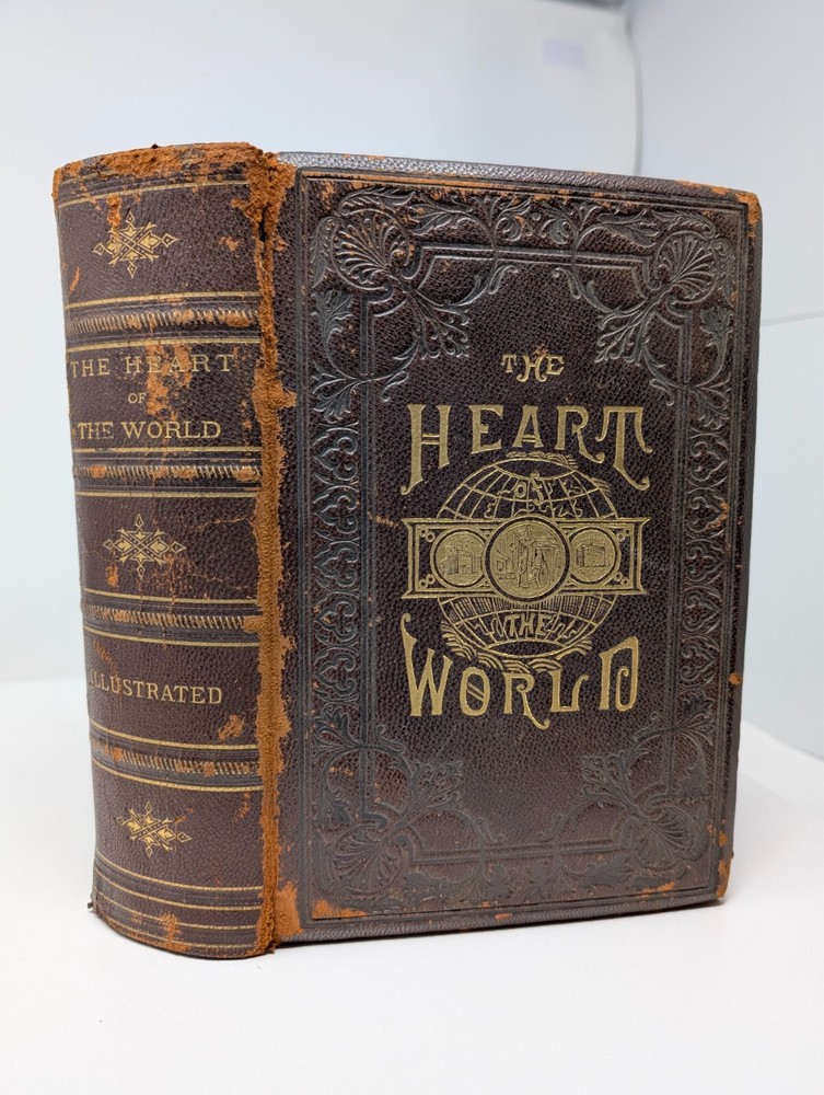The Heart of the World, Illustrated, G.S. Weaver, 1883, Decorative Full Leather Measures about 6 1/2" by 9", embossed and gilt designs on cover and spine, gilt page edges all-around. Fair to Good overall antique condition as shown, decent eye appeal and solidly bound page block but cover hinges are showing their age and beginning to crack so intervention likely needed. Hinges show some separation already at tops and bottoms. Some rubbing as well to cover surfaces with some loss of finish in places; back cover has a small round inclusion near bottom edge. Please refer to the provided photos for the best sense of condition as they are of the exact book available for sale. Let me know if you have any questions regarding condition or otherwise prior to purchase and thanks for visiting!