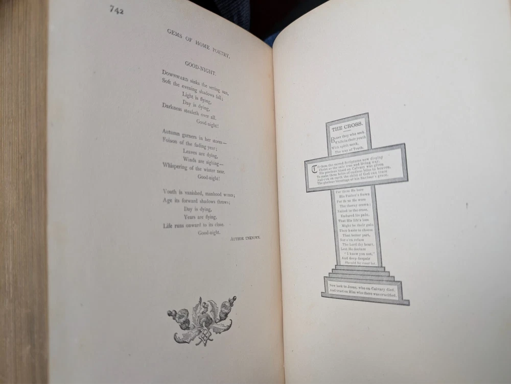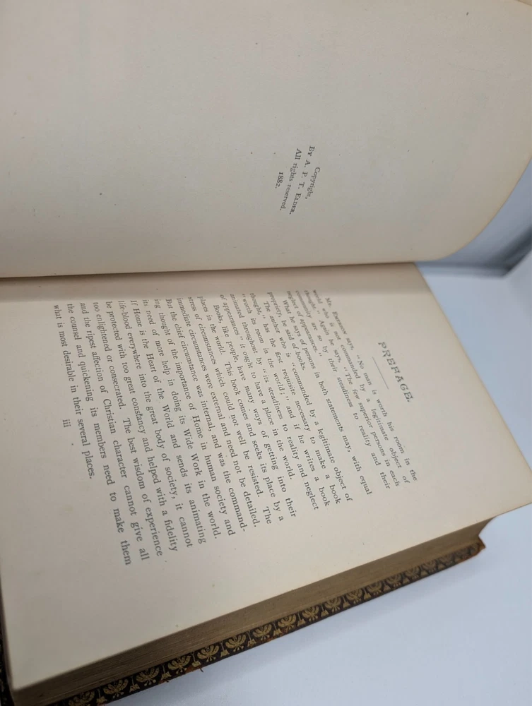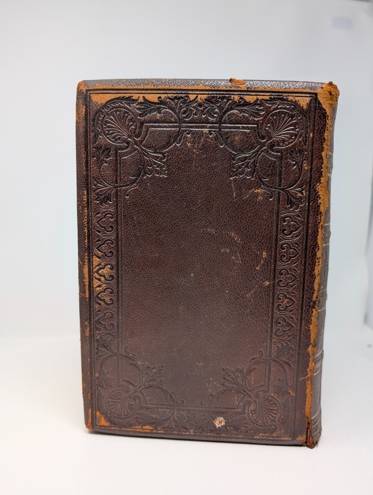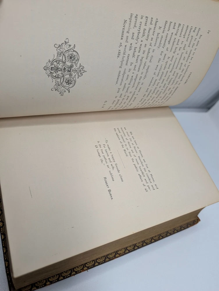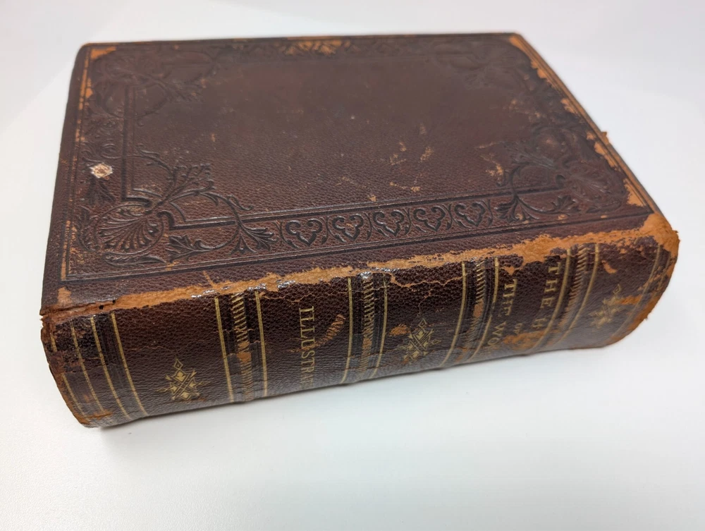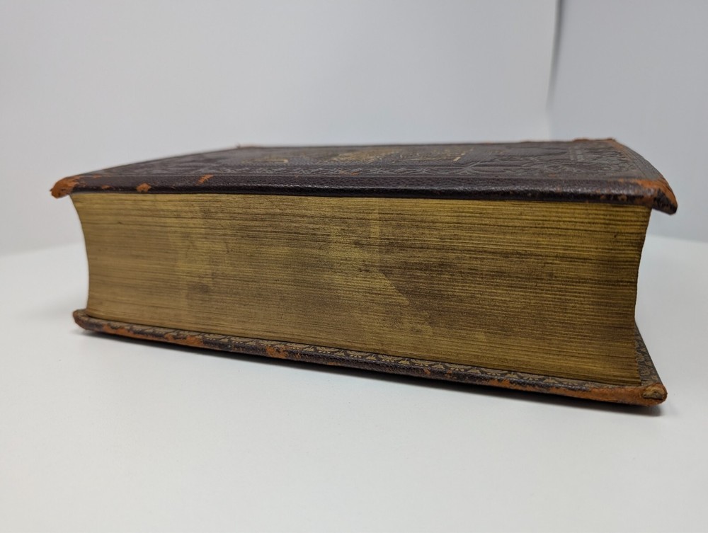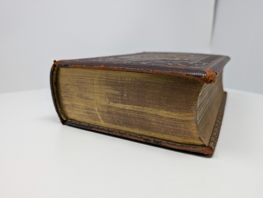 The Heart of the World, Illustrated, G.S. Weaver, 1883, Decorative Full Leather Measures about 6 1/2" by 9", embossed and gilt designs on cover and spine, gilt page edges all-around. Fair to Good overall antique condition as shown, decent eye appeal and solidly bound page block but cover hinges are showing their age and beginning to crack so intervention likely needed. Hinges show some separation already at tops and bottoms. Some rubbing as well to cover surfaces with some loss of finish in places; back cover has a small round inclusion near bottom edge. Please refer to the provided photos for the best sense of condition as they are of the exact book available for sale. Let me know if you have any questions regarding condition or otherwise prior to purchase and thanks for visiting!