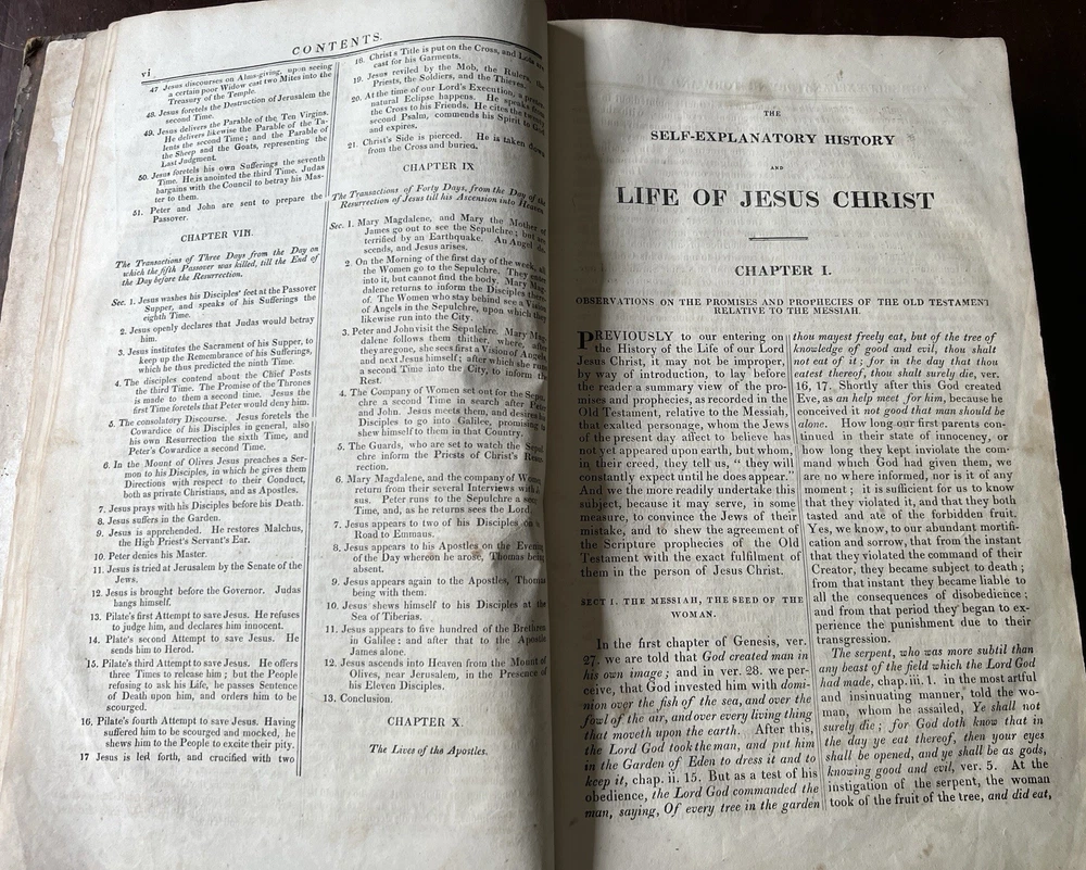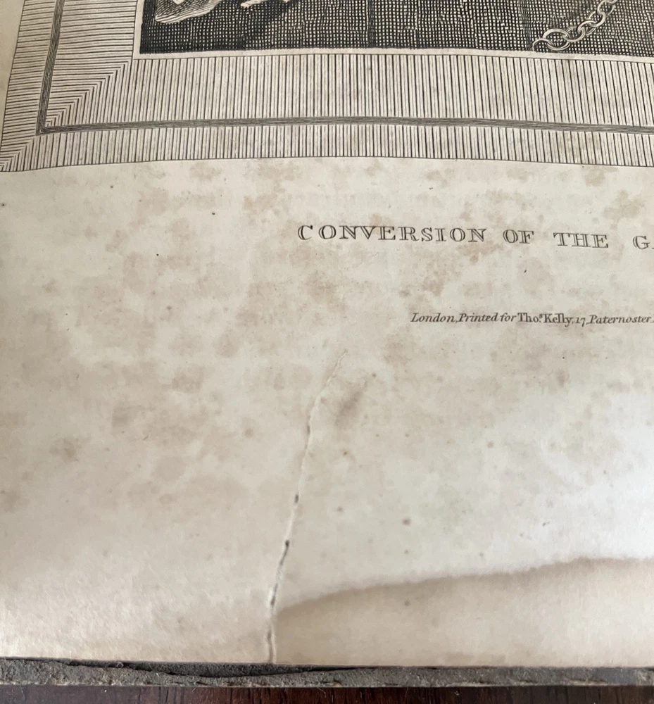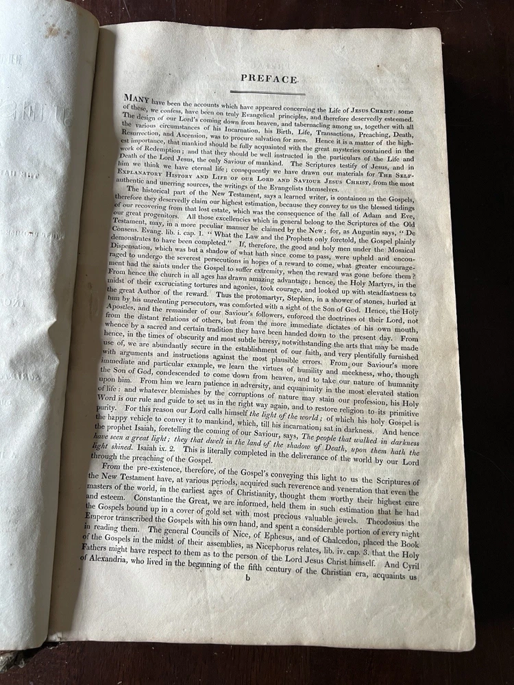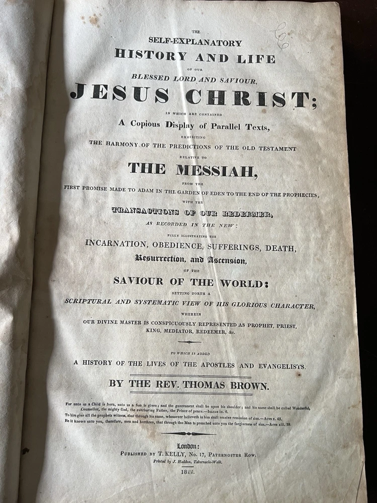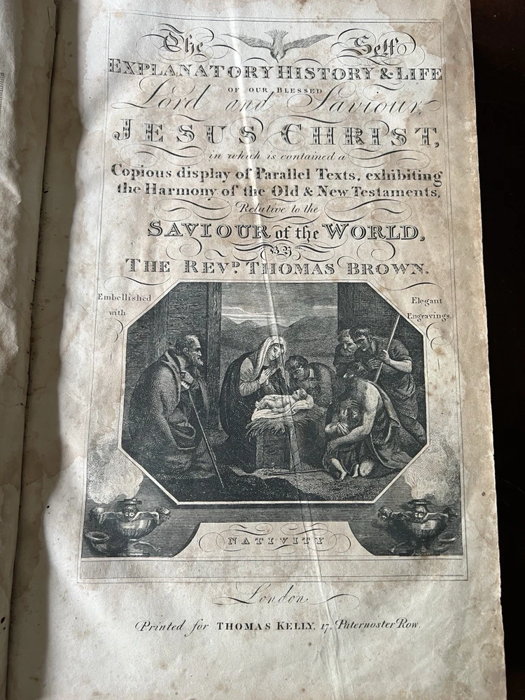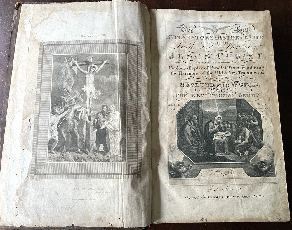 The Self Explanatory History and Life of Our Blessed Lord and Saviour Jesus Christ; In which are Contained Copious Display of Parallel Texts Exhibiting the Harmony of the Old and New Testaments Relative to The Messiah. Fully Illustrating the Incarnation, Obedience, Sufferings, Death, Resurrection and Ascension, of the Saviour of the World. To Which is Added A History of the Lives of the Apostles and Evangelists By Rev. Thomas Brown. Published in 1822 by Thomas Kelly, No. 17 Paternoster Row, London. Printed by J. Haddon, Tabernacle Walk. Folio measures approx. 16” x 10”. 469 pages. Full leather. Covers worn. Previous owners name embossed on front cover (Robert and Isabella Milliken). Spine wear. Good binding. Foxing of pages. Very readable. Many engravings, also with some staining. A few pages with a slight tear. Will be packed well.