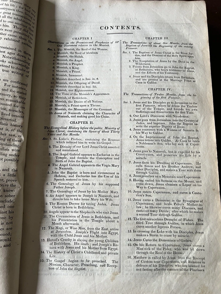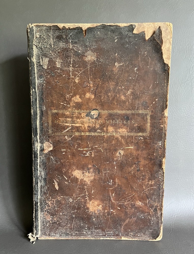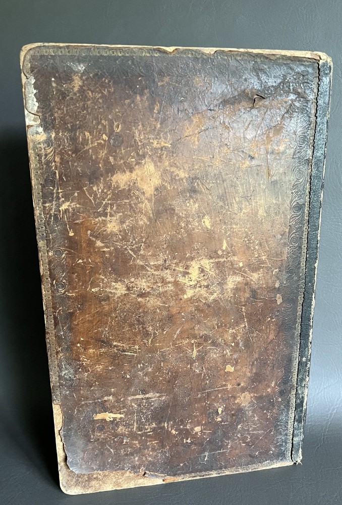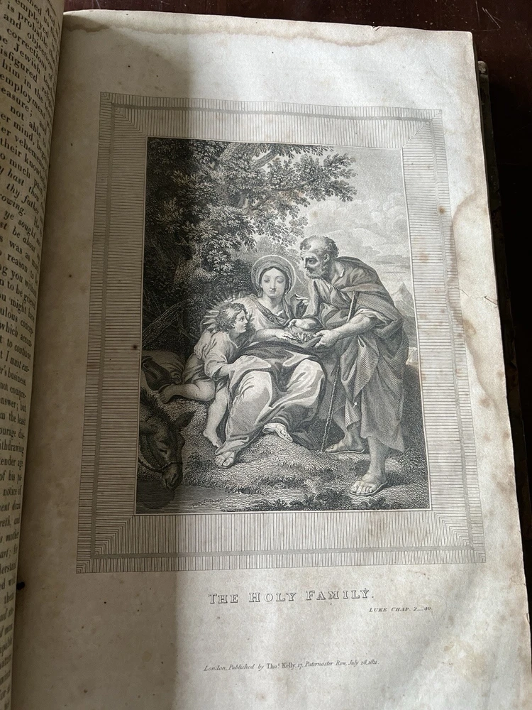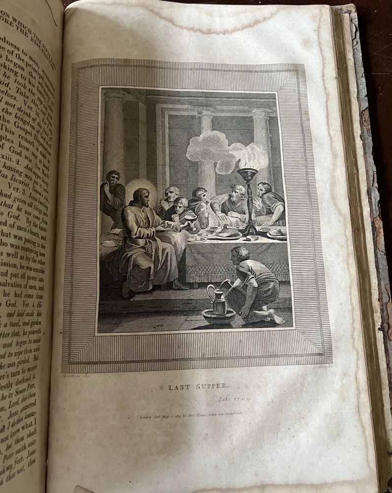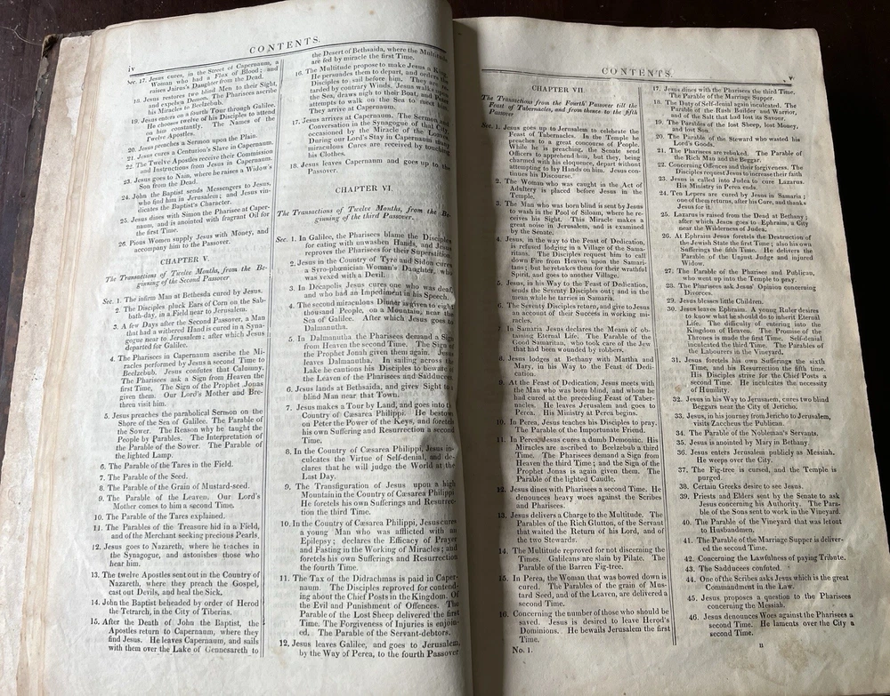 The Self Explanatory History and Life of Our Blessed Lord and Saviour Jesus Christ; In which are Contained Copious Display of Parallel Texts Exhibiting the Harmony of the Old and New Testaments Relative to The Messiah. Fully Illustrating the Incarnation, Obedience, Sufferings, Death, Resurrection and Ascension, of the Saviour of the World. To Which is Added A History of the Lives of the Apostles and Evangelists By Rev. Thomas Brown. Published in 1822 by Thomas Kelly, No. 17 Paternoster Row, London. Printed by J. Haddon, Tabernacle Walk. Folio measures approx. 16” x 10”. 469 pages. Full leather. Covers worn. Previous owners name embossed on front cover (Robert and Isabella Milliken). Spine wear. Good binding. Foxing of pages. Very readable. Many engravings, also with some staining. A few pages with a slight tear. Will be packed well.