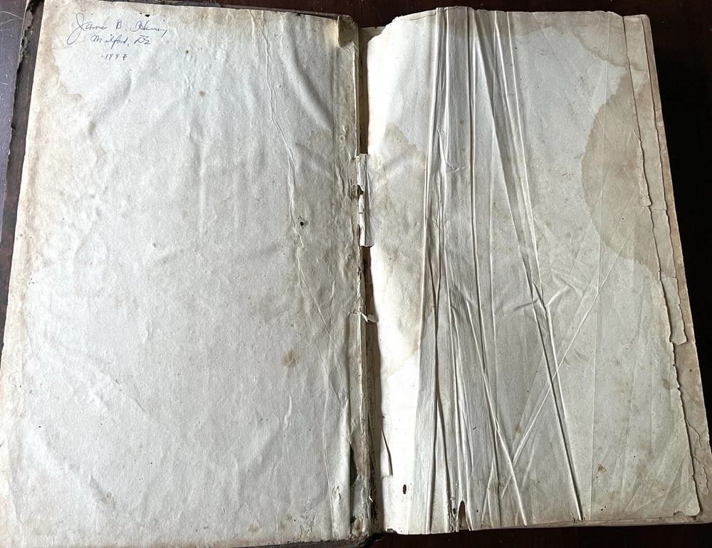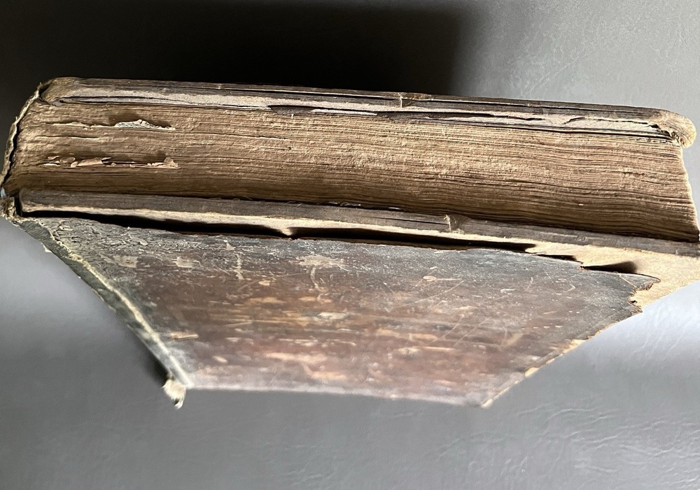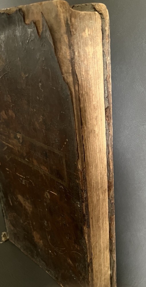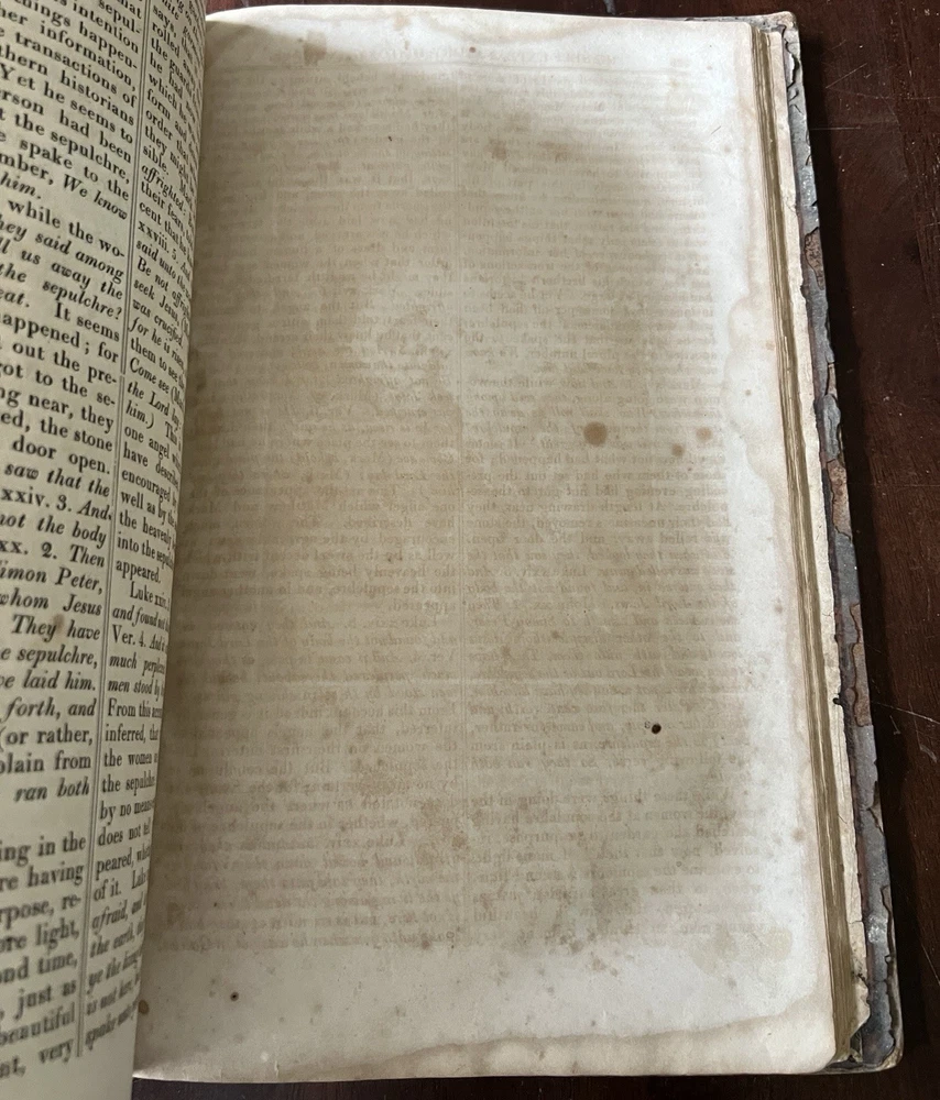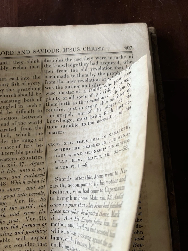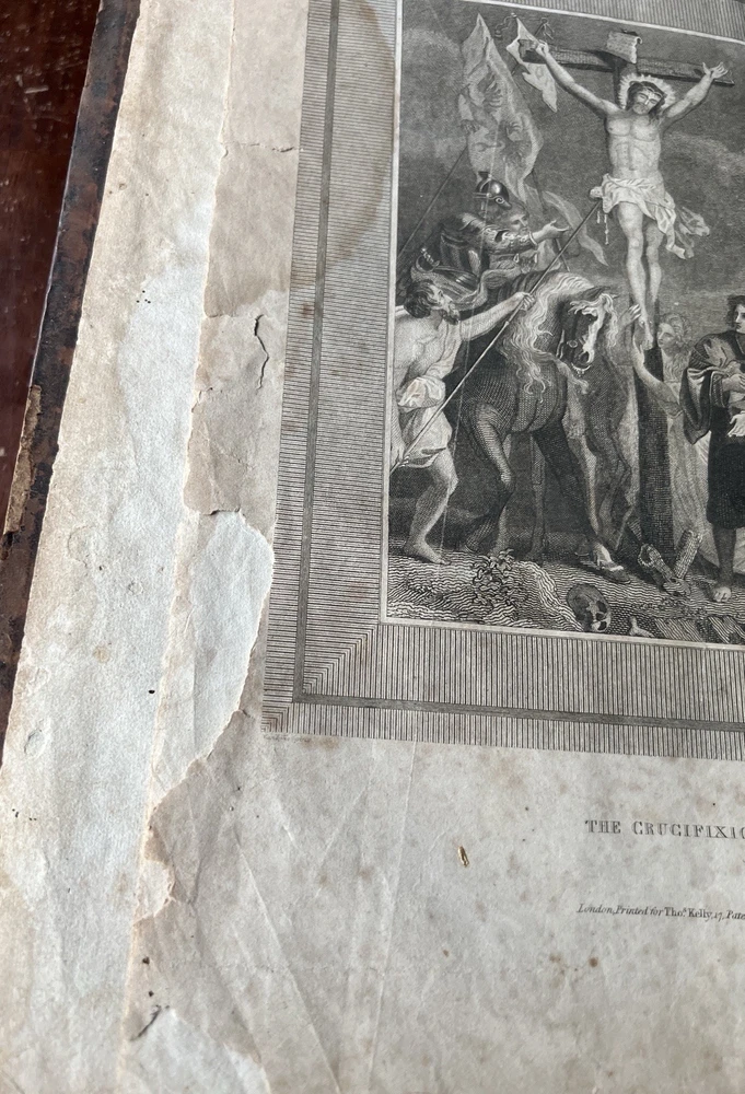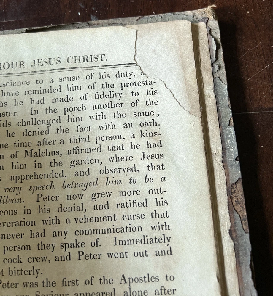 The Self Explanatory History and Life of Our Blessed Lord and Saviour Jesus Christ; In which are Contained Copious Display of Parallel Texts Exhibiting the Harmony of the Old and New Testaments Relative to The Messiah. Fully Illustrating the Incarnation, Obedience, Sufferings, Death, Resurrection and Ascension, of the Saviour of the World. To Which is Added A History of the Lives of the Apostles and Evangelists By Rev. Thomas Brown. Published in 1822 by Thomas Kelly, No. 17 Paternoster Row, London. Printed by J. Haddon, Tabernacle Walk. Folio measures approx. 16” x 10”. 469 pages. Full leather. Covers worn. Previous owners name embossed on front cover (Robert and Isabella Milliken). Spine wear. Good binding. Foxing of pages. Very readable. Many engravings, also with some staining. A few pages with a slight tear. Will be packed well.