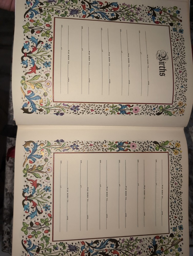 Leather-bound, gilded page King James Version designed by Howard Morris, copyright by Abradale Press, Inc. Incorporates genealogical records (all blank), prayers, reference, and cyclopedia.