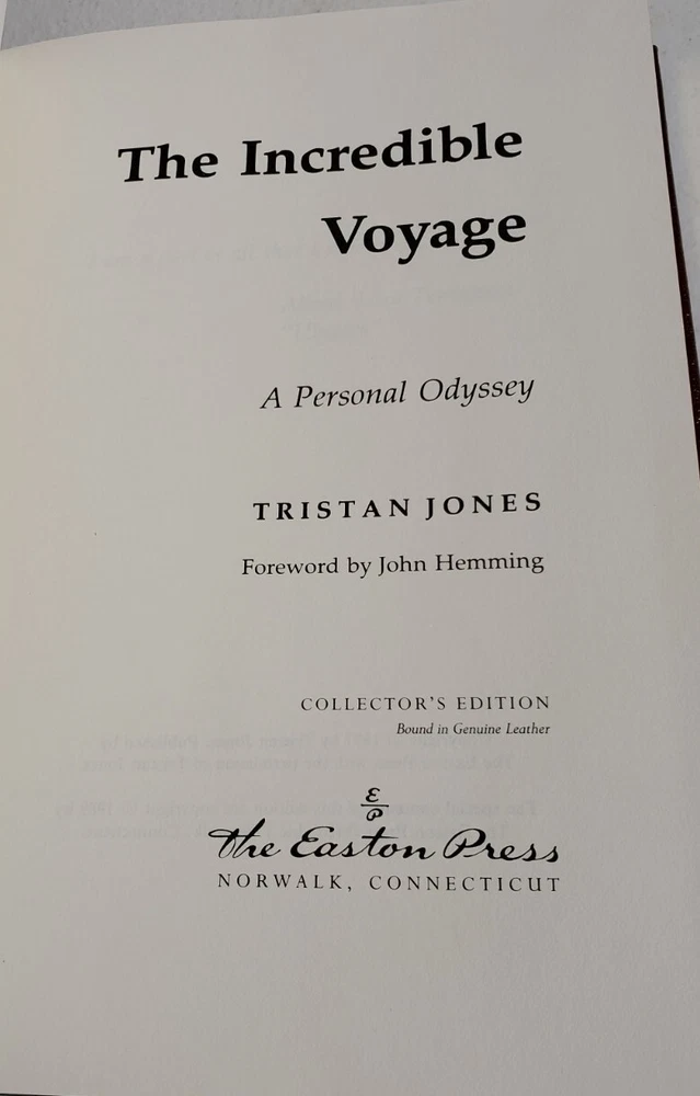 The Incredible Voyage by Tristan Jones Vintage Easton Press Nautical Library. Accented in 22kt gold, printed on archival paper with gilded edges, smyth sewing & concealed muslin joints. Bound In full leather with hubbed spines. A Limited Edition In a salty, slashing style, Tristan Jones unfolds his extraordinary saga— a six-year voyage during which he covered a distance equal to twice the circumference of the world —revealing both a rich sense of history and an insuppressible Welsh wit. Very good condition