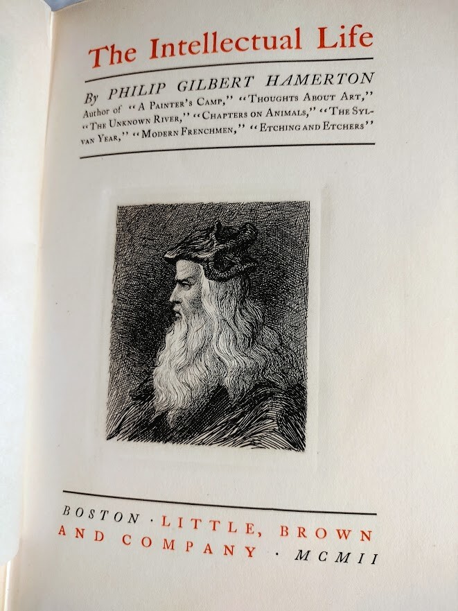 Intellectual Life by Philip Hamerton Hardcover Edition, 1902, Gilt Title, Spine, Top Little, Brown and Co., Boston, 1902. Hardcover edition, blue dark leather, 466 pages, portrait of Philip Hamerton. The book is clean inside, the binding is tight, no damage to the spine, no tears (rare good condition), gilded top edge, gilt-lettered spine and a front board, short gift inscription to the ffep, dated 1902. Additional description is available. *Service 24/7. Your purchase will be appropriately packaged and shipped to ensure a smooth arrival, followed up with an email with a tracking #.