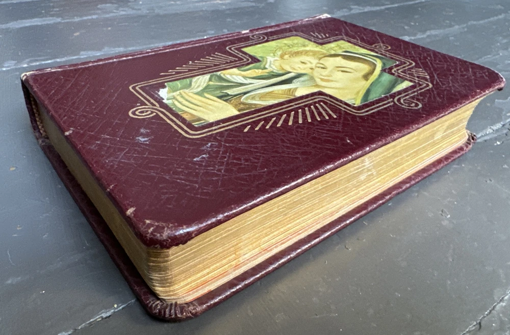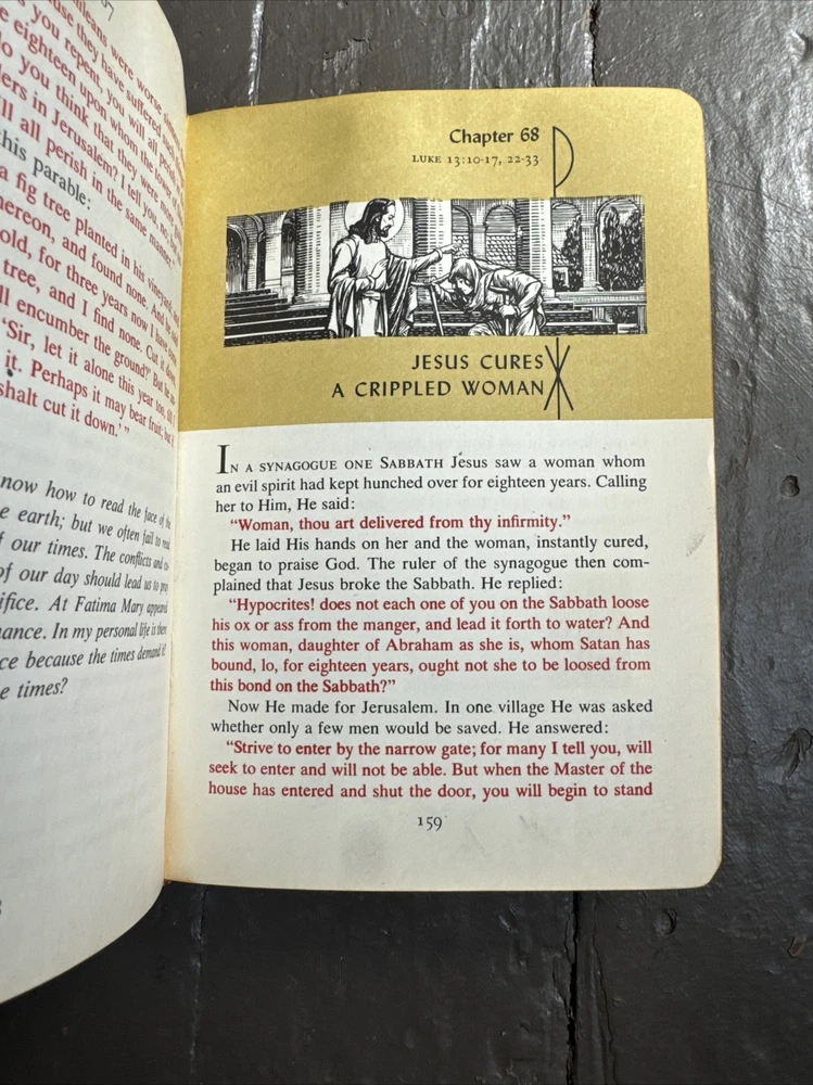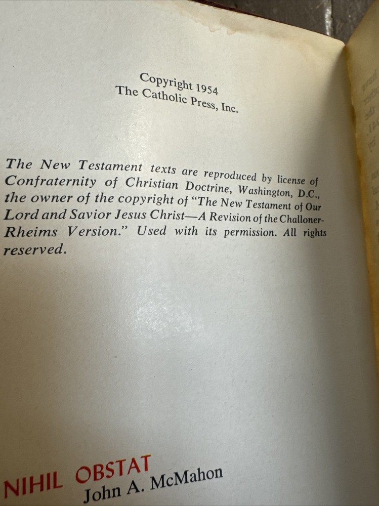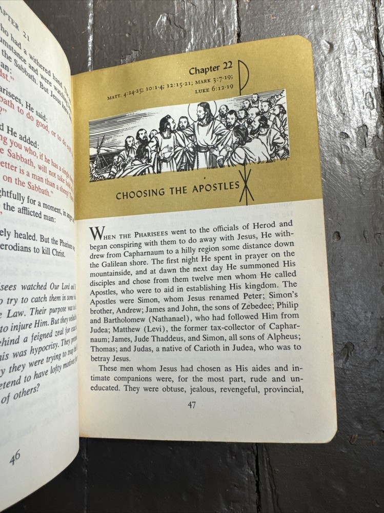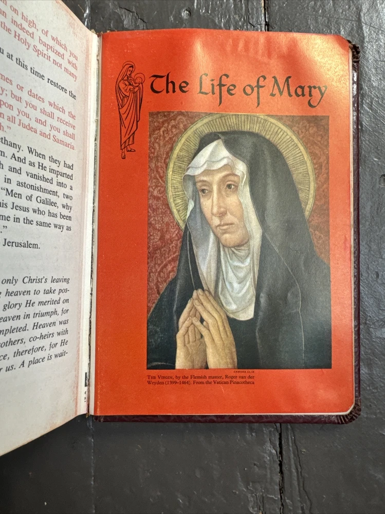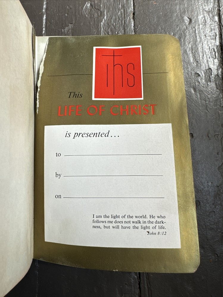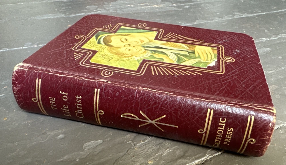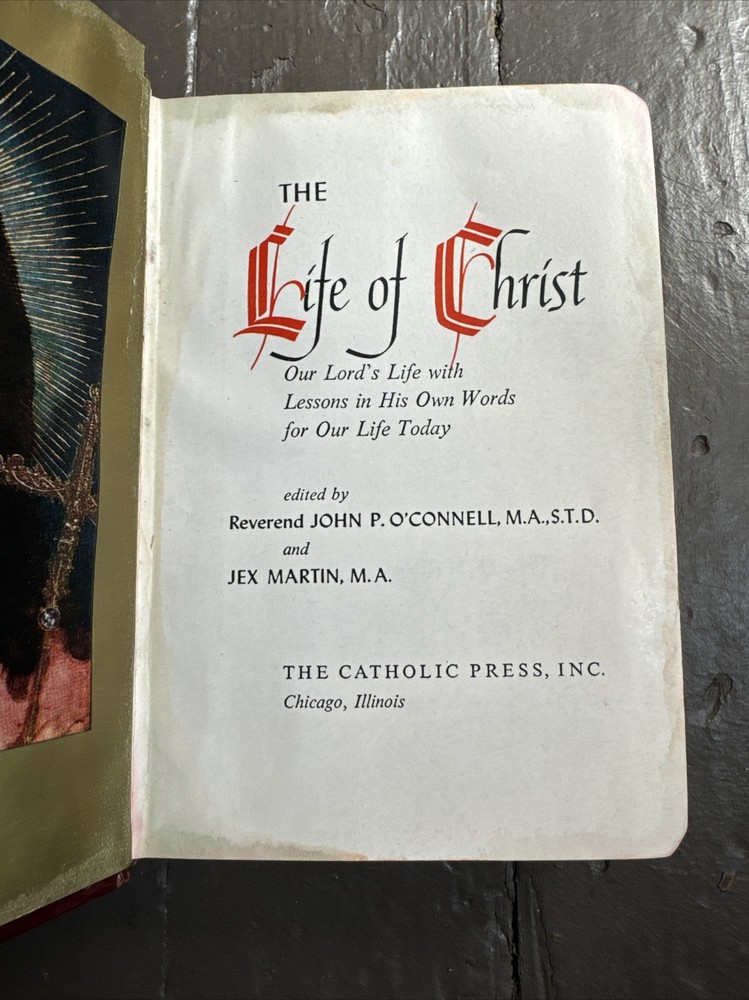 The Life of Christ published by The Catholic Press in 1954 Red leather hardcover. 304 pages + Life of Mary section. Many full color illustrations. Condition: some age and shelf wear. Tear to dedication page. Pages remain crisp overall. See pictures. Shipped for FREE with USPS Media Mail.