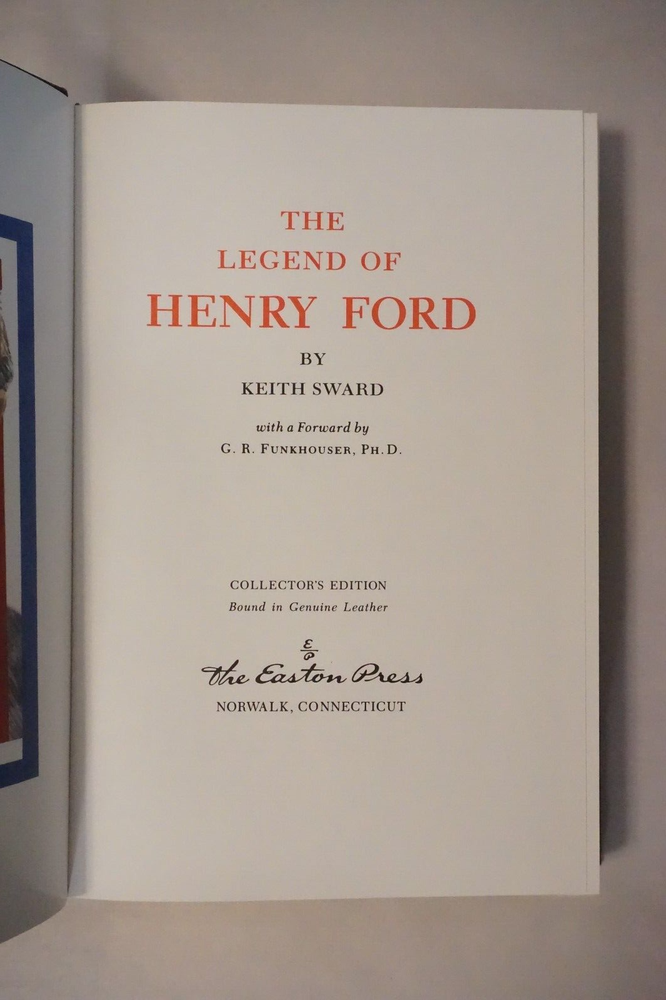 Wonderful copy of The Legend of Henry Ford by Keith Sward. Published in 1989 by Easton Press of Norwalk, Connecticut. The leatherbound book is in very good condition for its age, with minimal wear to the cover and edges. Great find at a great price! Please note the S&H charges, which include USPS postage, materials, and handling. Pictured bookends are not included in the sale. View our other eBay listings at Weiss Lane Books! https://www.ebay.com/str/Weiss-Lane-Books