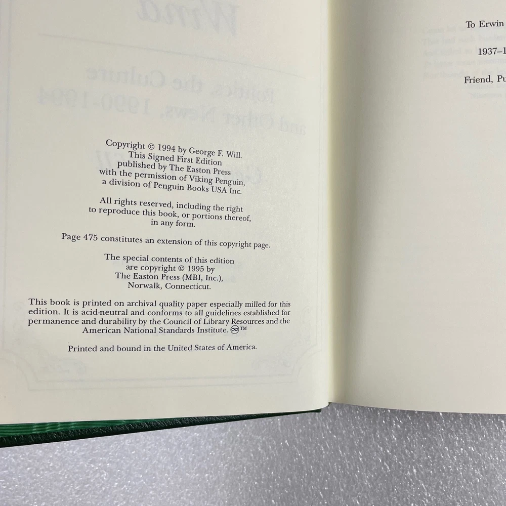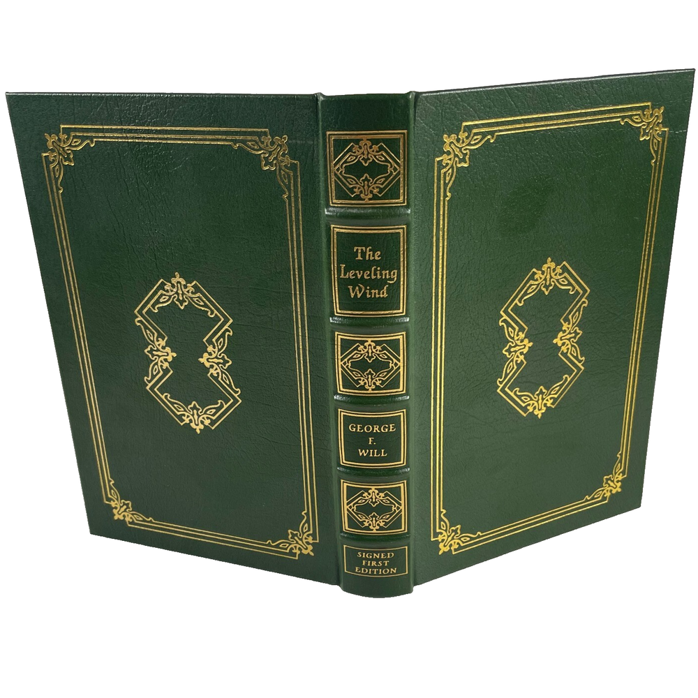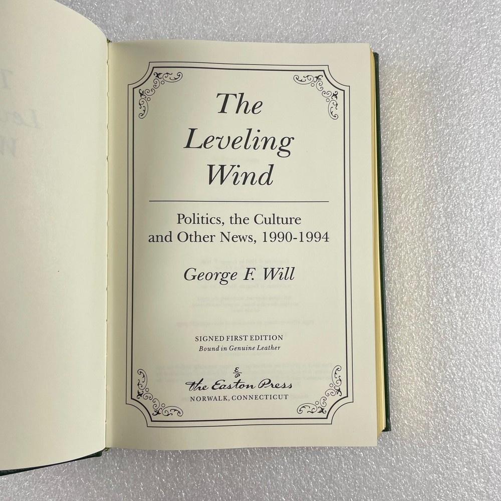 The Leveling Wind by George F Will ; Easton Press ; Signed by the author ; 1st Edition ; Gold gilded genuine leather bound. “The Leveling Wind” is the fifth collection of columns, speeches, and reviews by George F. Will, a nationally syndicated conservative columnist and political commentator. The collection was published in 1995. It likely covers a range of political and social commentary reflecting Will's conservative perspective during that period. Packaged with care. Shipped in box or wrapped in cardboard and shipped in mailer. We want your package to get to you in the same condition in that we mailed it.