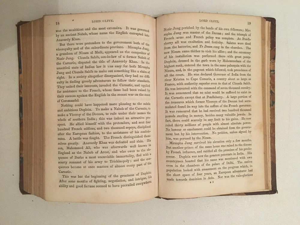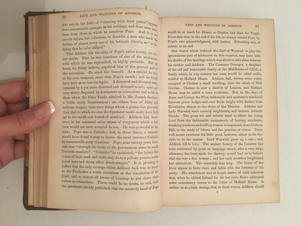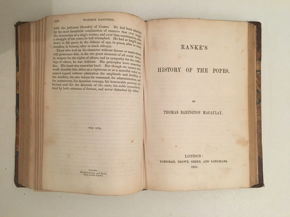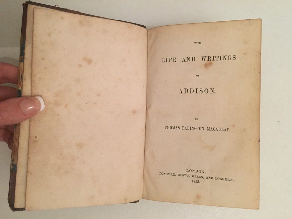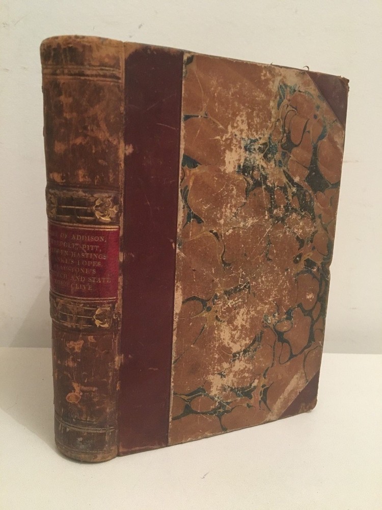 By Thomas Babington Macaulay - London, Longman, Brown, Green, and Longmans - 1851-52. * The Life and Writings of Addison by Thomas Babington Macaulay. - 1852. * Horace Walpole by Thomas Babington Macaulay. - 1852. * William Pitt , Earl of Chatham by Thomas Babington Macaulay. - 1851. * Warren Hastings by Thomas Babington Macaulay - 1851. * Ranke's History Of the popes by Thomas Babington Macaulay. - 1851. * Gladstone On Church and State by Thomas Babington Macaulay. - 1851. * Lord Clive by Thomas Babington Macaulay. - 1851. Corner leather binding, red title piece. 12 x 18 cm Title for each, 90 pp. ; 45 pp. ; 149 pp. ; 106 pp. ; 47 pp. ; 70 pp. 94 pp. text in English. In good condition: solid binding, few freckles. Blunt corners. By Thomas Babington Macaulay - London, Longman, Brown, Green, and Longmans - 1851-52. * The Life and Writings of Addison by Thomas Babington Macaulay. - 1852. * Horace Walpole by Thomas Babington Macaulay. - 1852. * William Pitt, Earl of Chatham by Thomas Babington Macaulay. - 1851. * Warren Hastings by Thomas Babington Macaulay - 1851. * Ranke's History Of the popes by Thomas Babington Macaulay. - 1851. * Gladstone On Church and State by Thomas Babington Macaulay. - 1851. * Lord Clive by Thomas Babington Macaulay. - 1851. Corner leather binding, red title piece. 12 x 18 cm Title for each, 90 pp. ; 45 pp. ; 149 pp. ; 106 pp. ; 47 pp. ; 70 pp. 94 pp. text in English. In good condition: solid binding, few freckles. Blunt corners.
