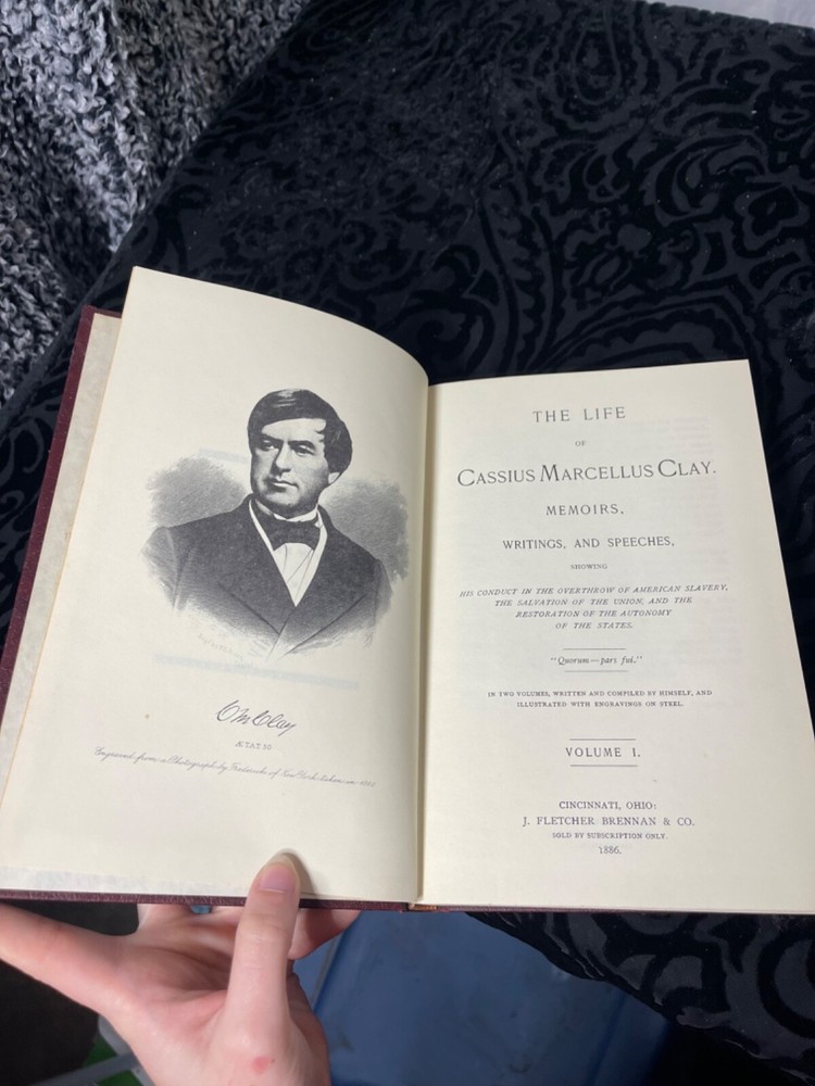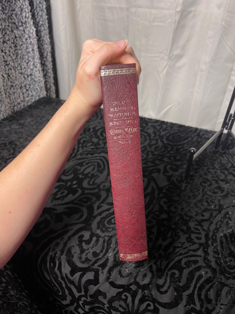 This is a rare and vintage book titled "The Life Of Cassius Marcellus Clay Memoirs, Writings, And Speech Volume 1". It is a genuine goat leather bound book with manual embossing and gold leaf printing. The book has 609 pages and is a reprint deluxe edition published in 1886. The intended audience is adult and the book is written in English. The book measures 5.75 x 9 inches and has a natural shade acid-free paper with a uniform colored bookmark embedded stone. The binding is manual binding and the book is designed with manual designing. The author is Cassius Marcellus Clay and the book falls under the history genre with topics like memoir and books. Personalization is available with nominal extra charges.