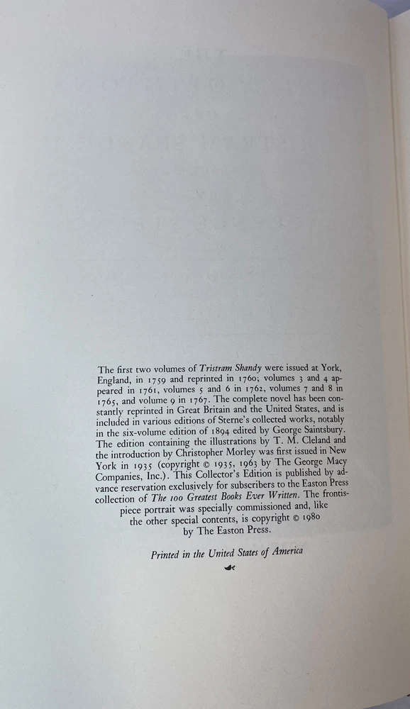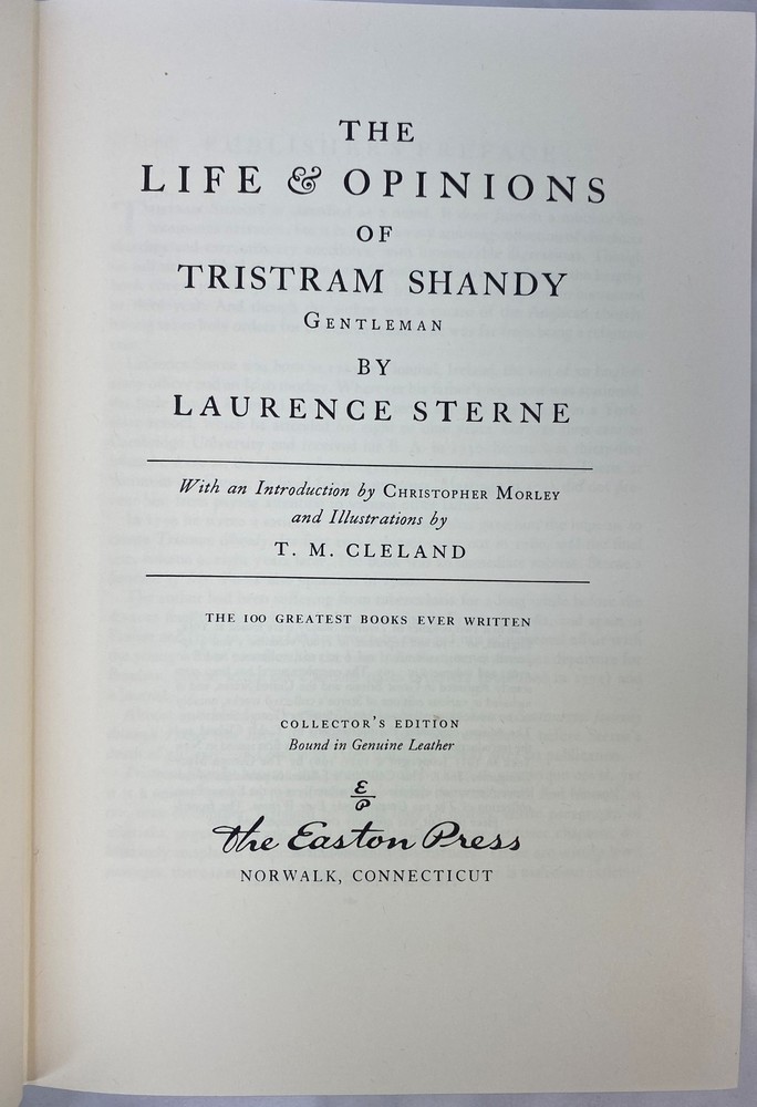 The Life & Opinions of Tristram Shandy, Gentleman by Laurence Sterne Part of the 100 GREATEST BOOKS collection of The Easton Press, Norwalk, Connecticut, 1980. This book is in very good, unread condition. There are scratches on all three gilded page ends. The satin ribbon is slightly sunned. The Easton Press books are bound in genuine leather binding, with 22kt gold accents and hubbed spines, gilded page ends, acid-neutral paper, Moire fabric endsheets, and evocative illustrations and decorations. We will be happy to combine shipping, wherever possible. Some items cannot be combined because of their size, weight or because they are fragile. Please ask if you have any questions. Your order will ship by the next business day after receiving payment. All items are from a smoke-free environment. Thank you, and Happy Reading!
