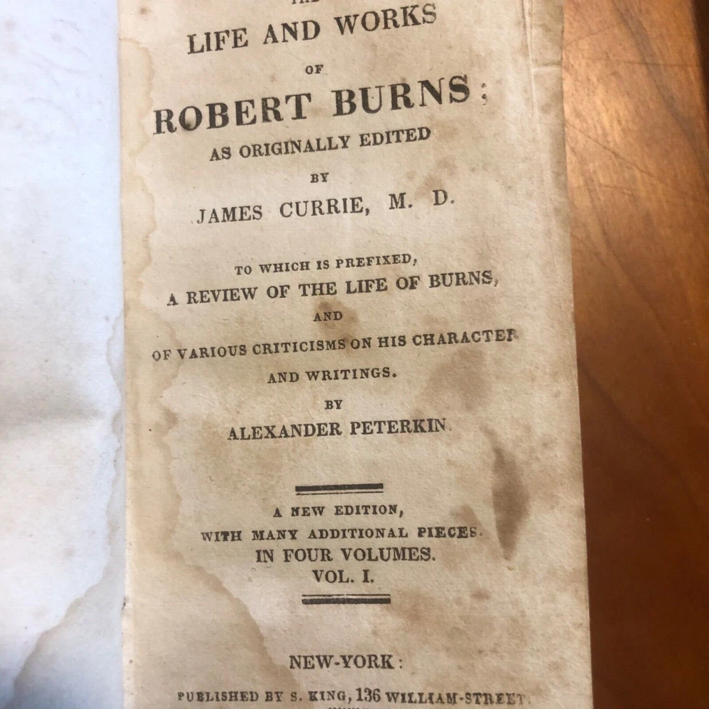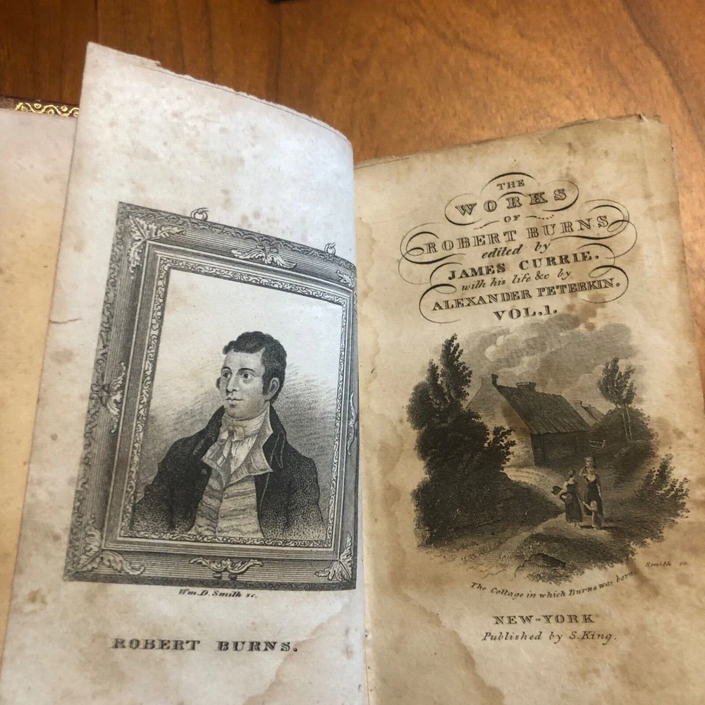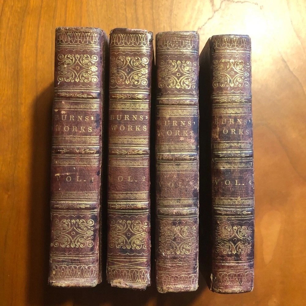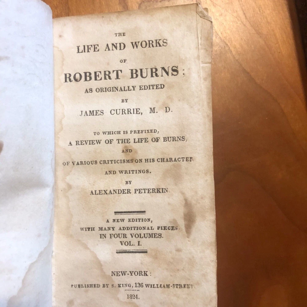 The Life & Works of Robert Burns, ed James Currie MD, to which is prefixed a review of the life of burns, of various criticisms on his character and writings by Alexander Peterkin, new edition published 1824, S. King NY 4 leather bound volumes, 5 1/2 x 3 inches, Some damage to the bindings esp vol 2 and 4 - some fraying and fading, pages discolored with age but generally in decent condition