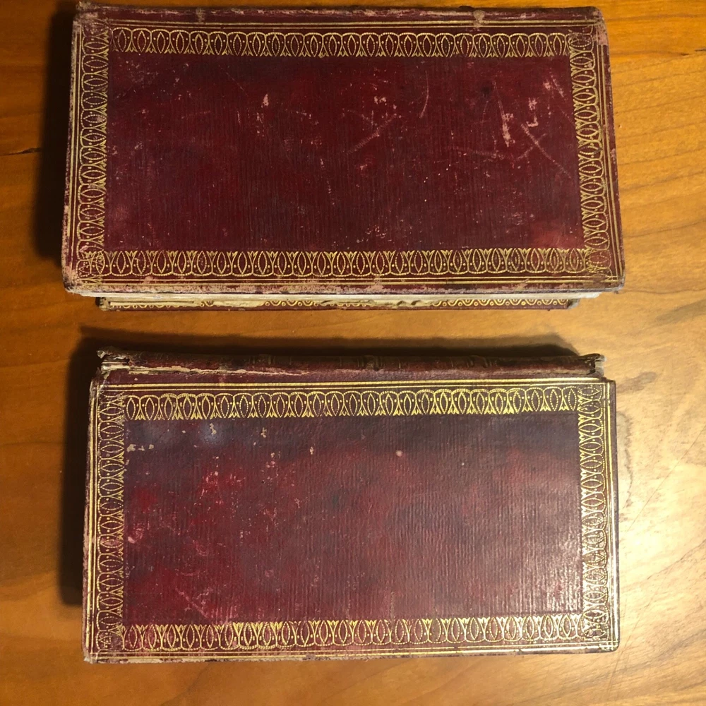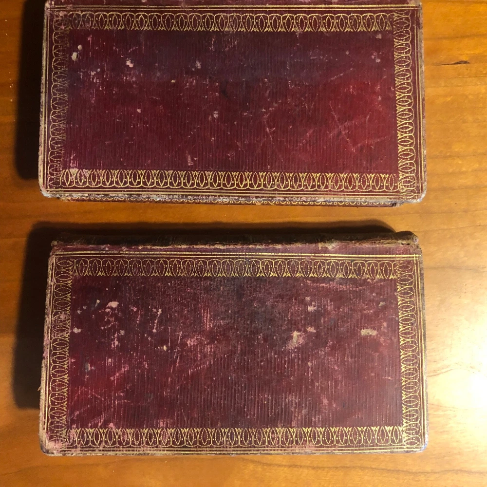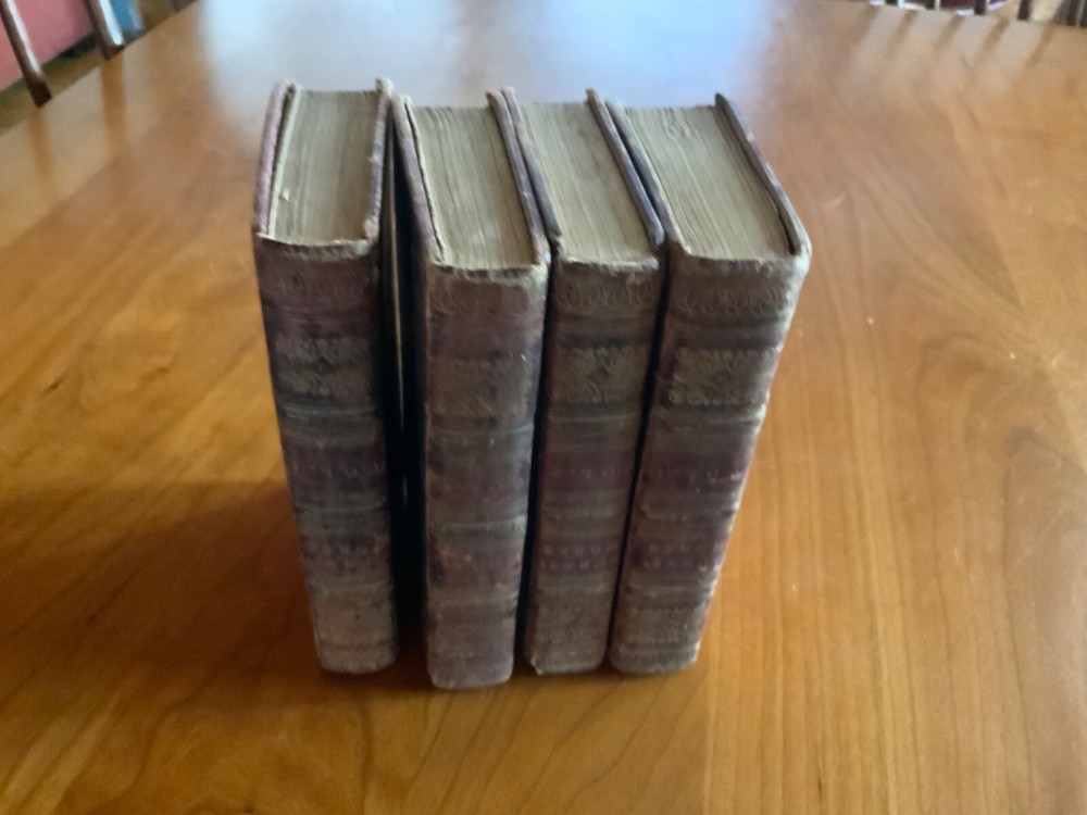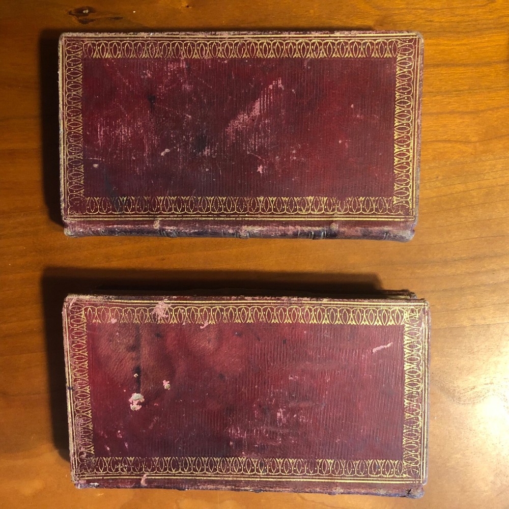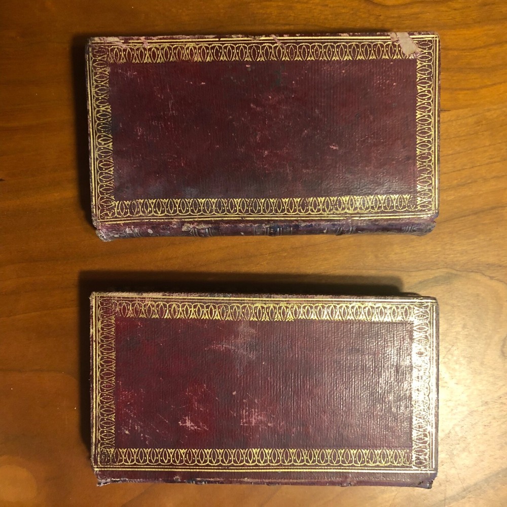 The Life & Works of Robert Burns, ed James Currie MD, to which is prefixed a review of the life of burns, of various criticisms on his character and writings by Alexander Peterkin, new edition published 1824, S. King NY 4 leather bound volumes, 5 1/2 x 3 inches, Some damage to the bindings esp vol 2 and 4 - some fraying and fading, pages discolored with age but generally in decent condition
