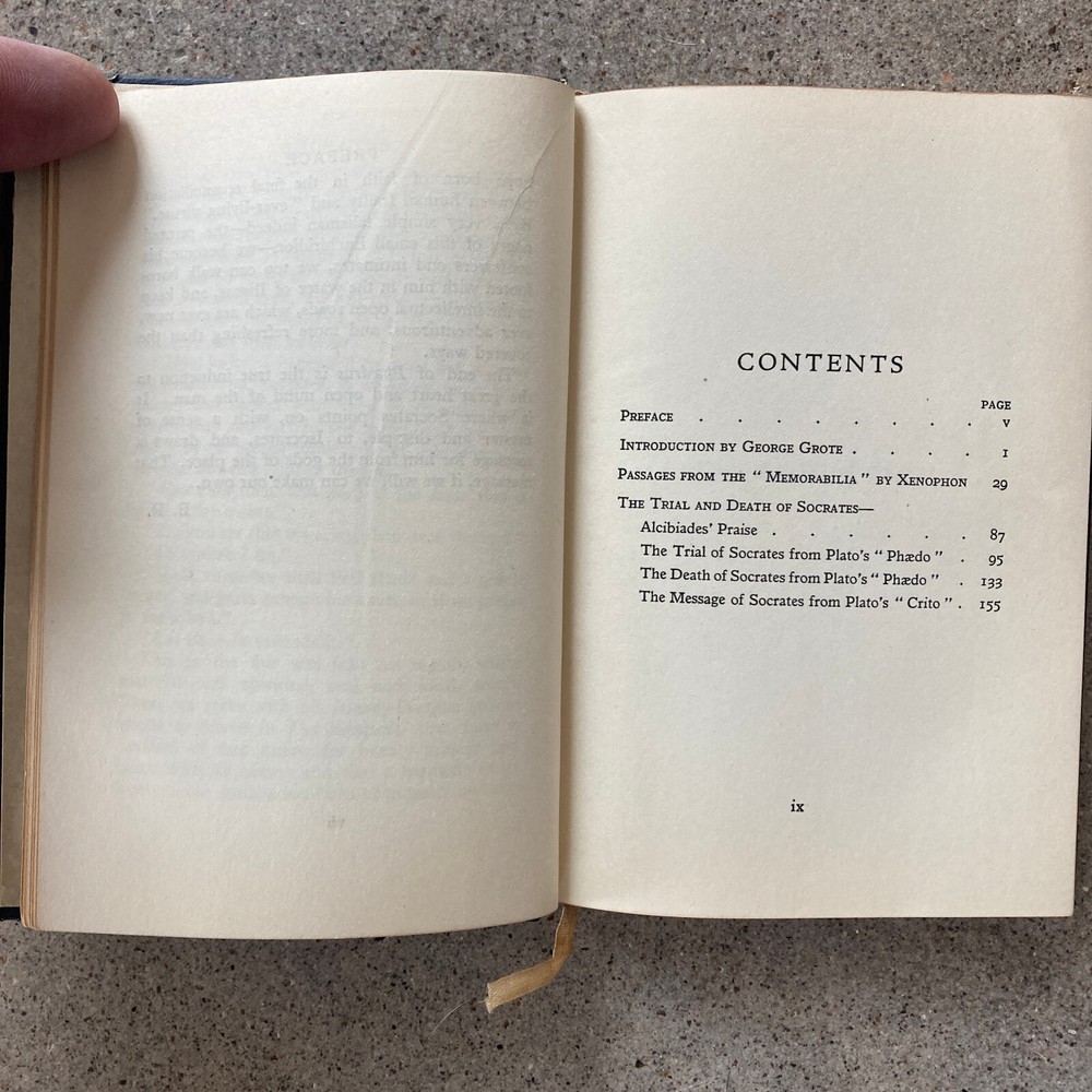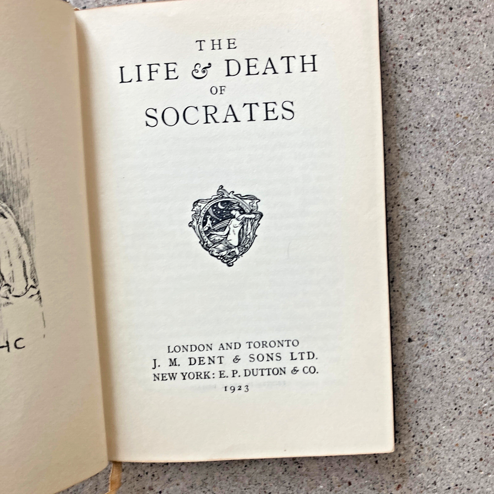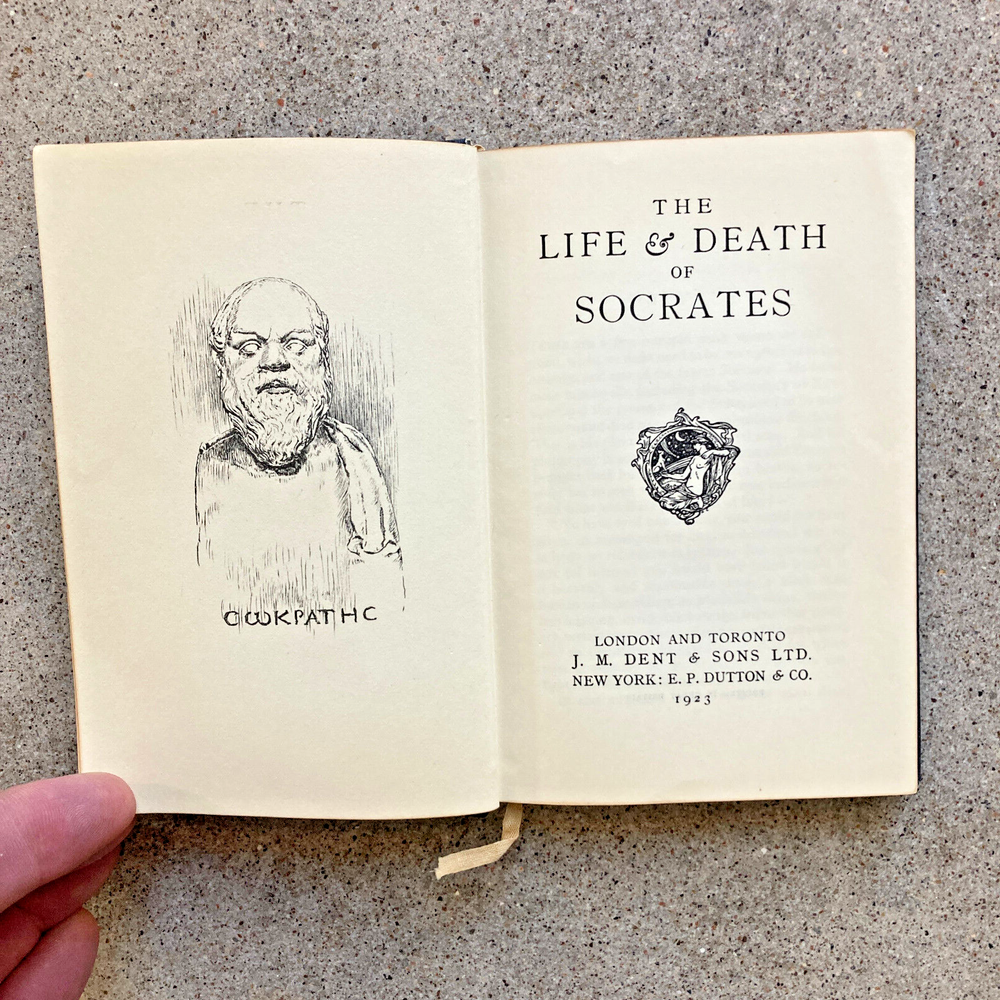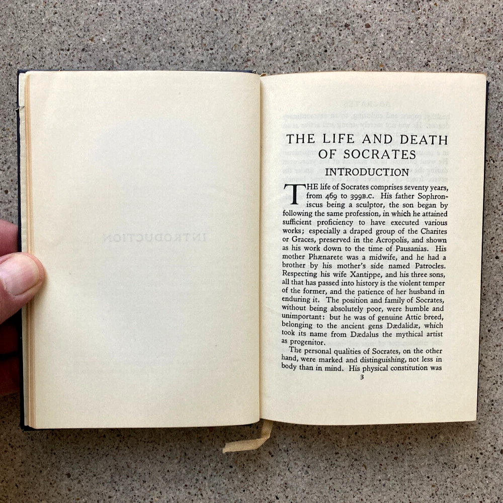 The Life and Death of Socrates, 1923. In bonded navy leather. 178 pp., 6.25 x 4.25", Published by J.M. Dent; E.P. Dutton. from the Bedside Series. Good/Very Good Condition. Please see all photos to ascertain exact condition. Please note cracked upper corner on front fixed endpaper. (Does not affect exterior leather).