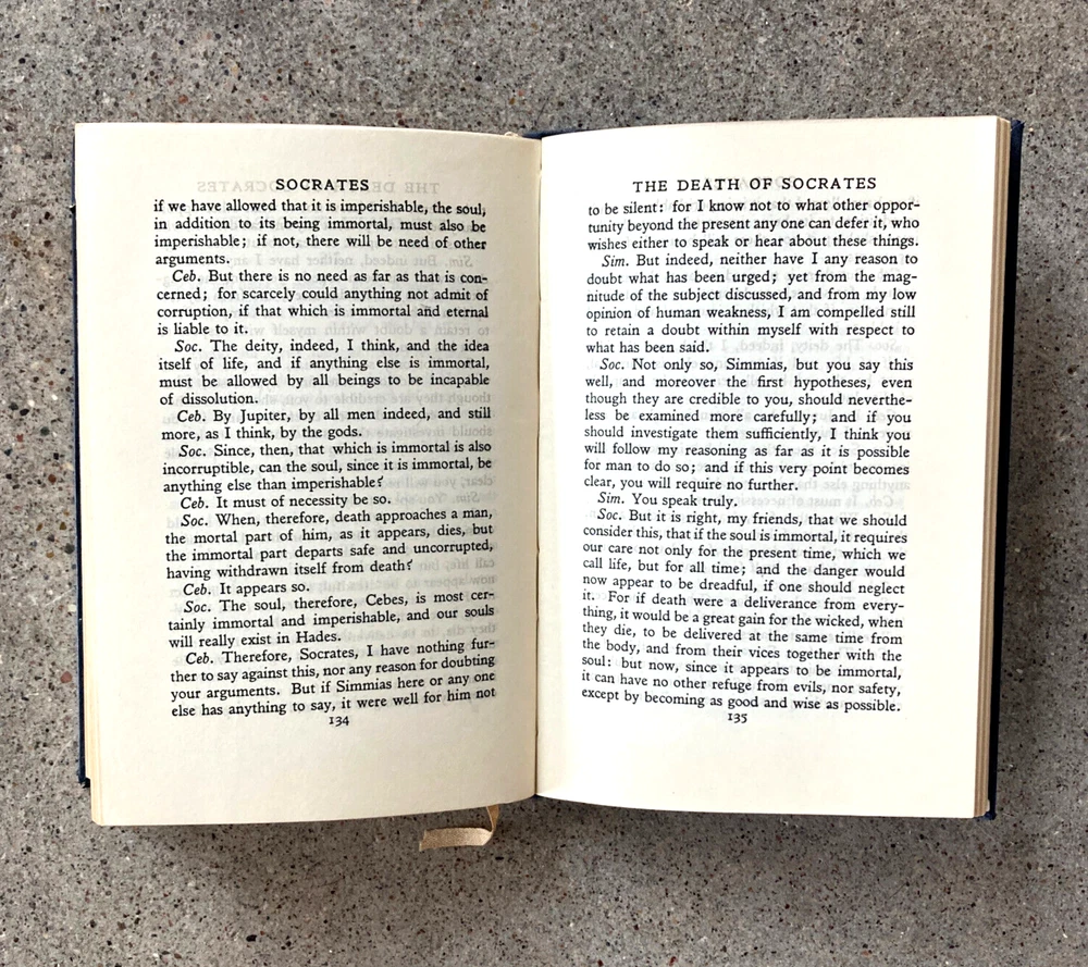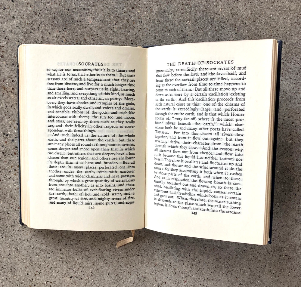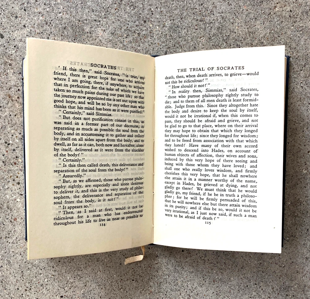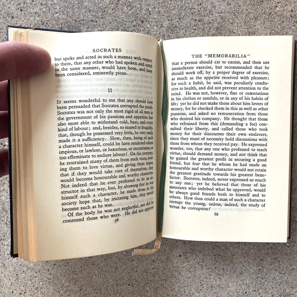 The Life and Death of Socrates, 1923. In bonded navy leather. 178 pp., 6.25 x 4.25", Published by J.M. Dent; E.P. Dutton. from the Bedside Series. Good/Very Good Condition. Please see all photos to ascertain exact condition. Please note cracked upper corner on front fixed endpaper. (Does not affect exterior leather).
