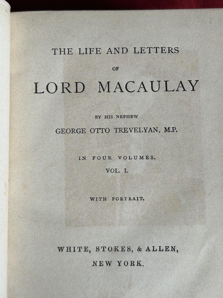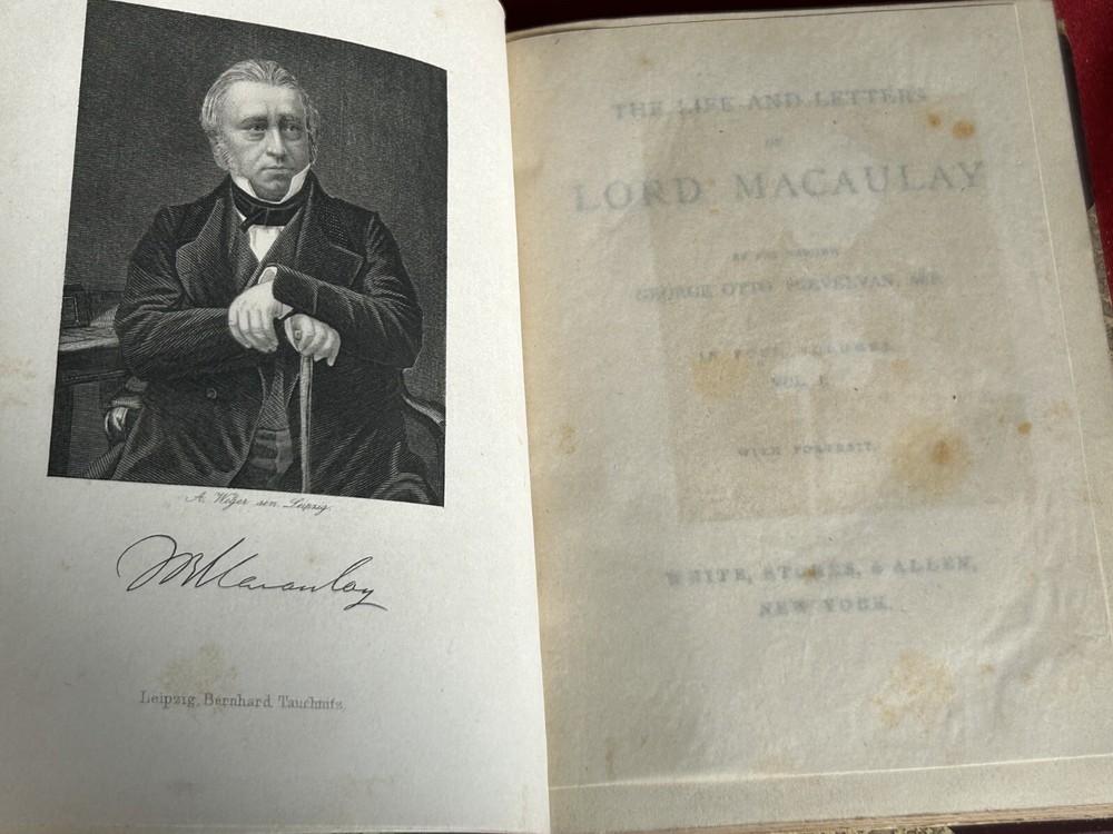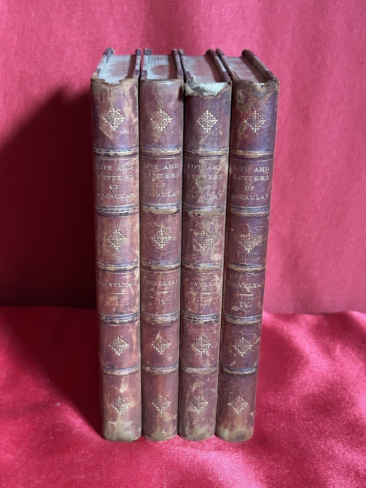 Delve into the captivating world of politics and personalities with "The Life and Letters of Lord MaCaulAy" by George Otto Trevelyan, presented in a luxurious four-volume leather-bound set. Published by White, Stokes, & Allen in New York, this treasure offers an in-depth exploration of biography and autobiography, showcasing the intricate tapestry of one of Britain's most influential figures. Each volume is a testament to the author's meticulous research and narrative skill, printed in English and originating from the United States. The set is an original edition, making it a prized addition to any collection focused on historical figures and their legacies. Indulge in the rich history and scholarly work that is sure to adorn the shelves of any bibliophile's haven. They measure 6.5"x5".