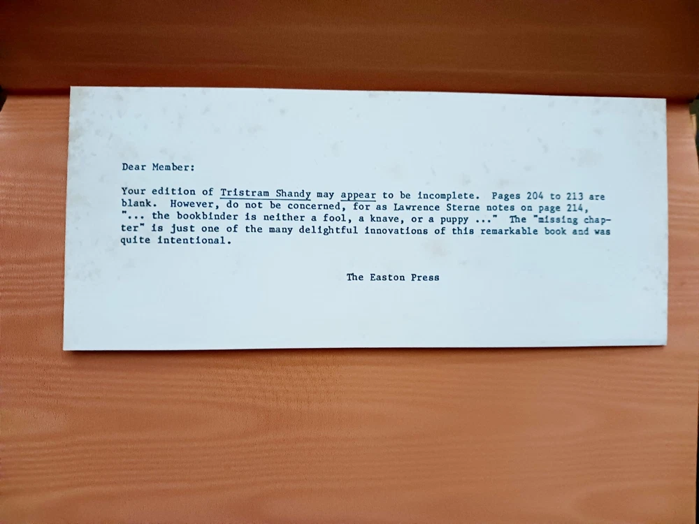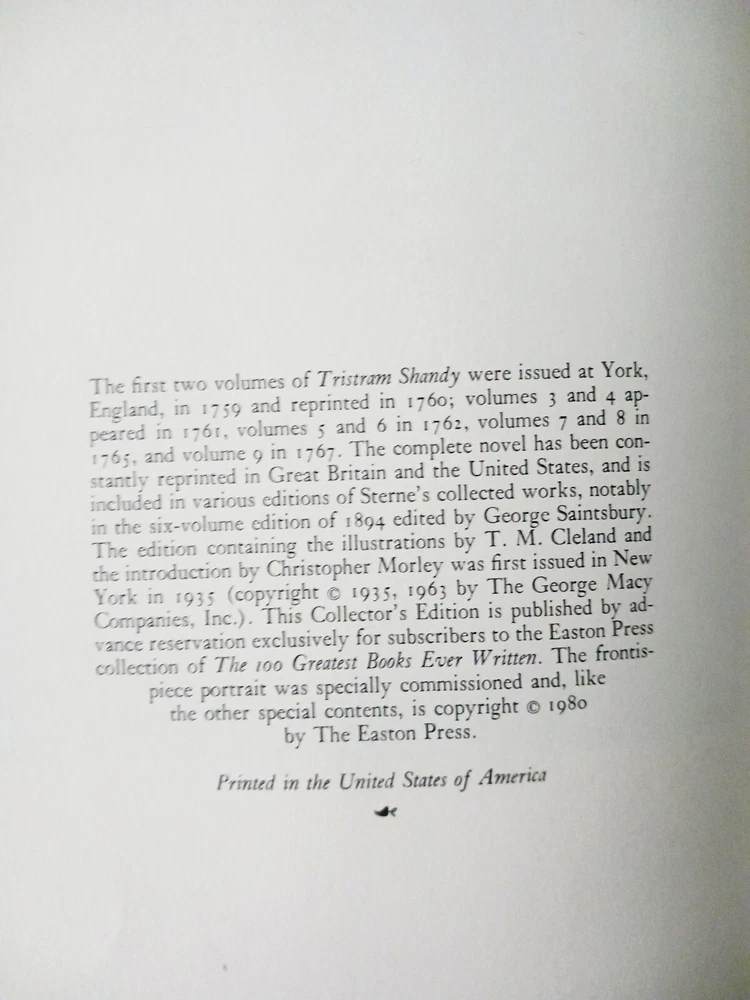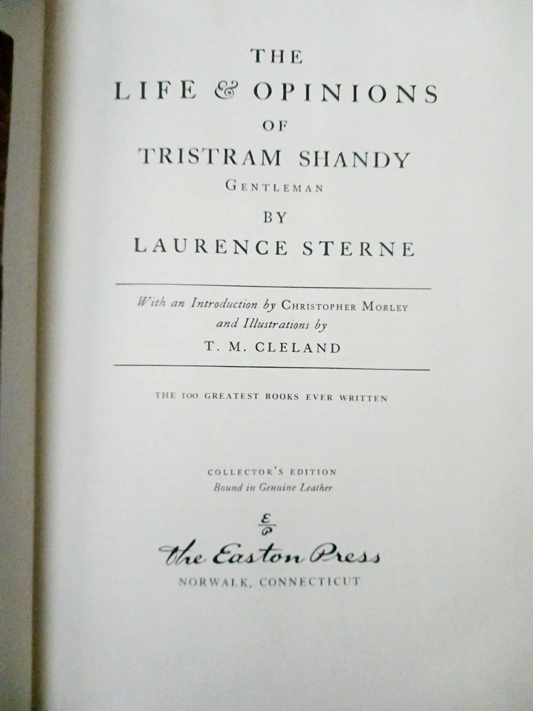 The Life and Opinions of Tristram Shandy, Gentleman ~ The Easton Press 1980 In very nice condition and fully functional This beautifully illustrated collector's edition of "The Life and Opinions of Tristram Shandy, Gentleman" is a must-have for any book lover. Published in 1980 by The Easton Press, this limited edition book is bound in genuine leather and features the stunning artwork of T.M. Cleland. The content of this book, written by Laurence Sterne, is sure to captivate readers with its wit and humor. It has been chosen as one of the "100 Greatest Books Ever Written" and is a true treasure for any fan of literature and fiction. Don't miss your chance to own this rare and exquisite piece of North American publishing history.