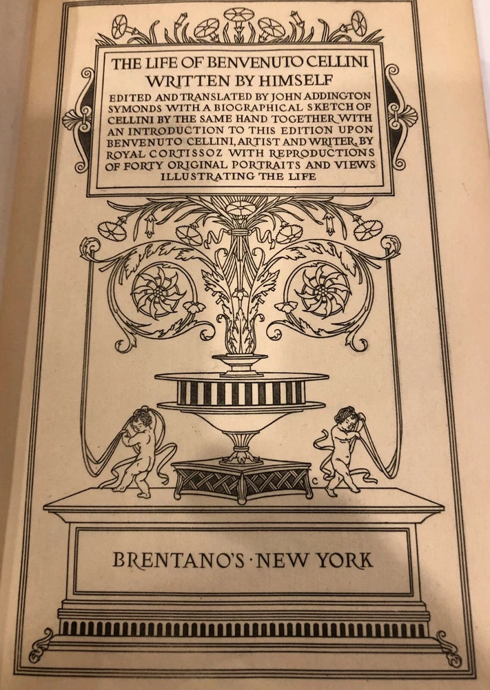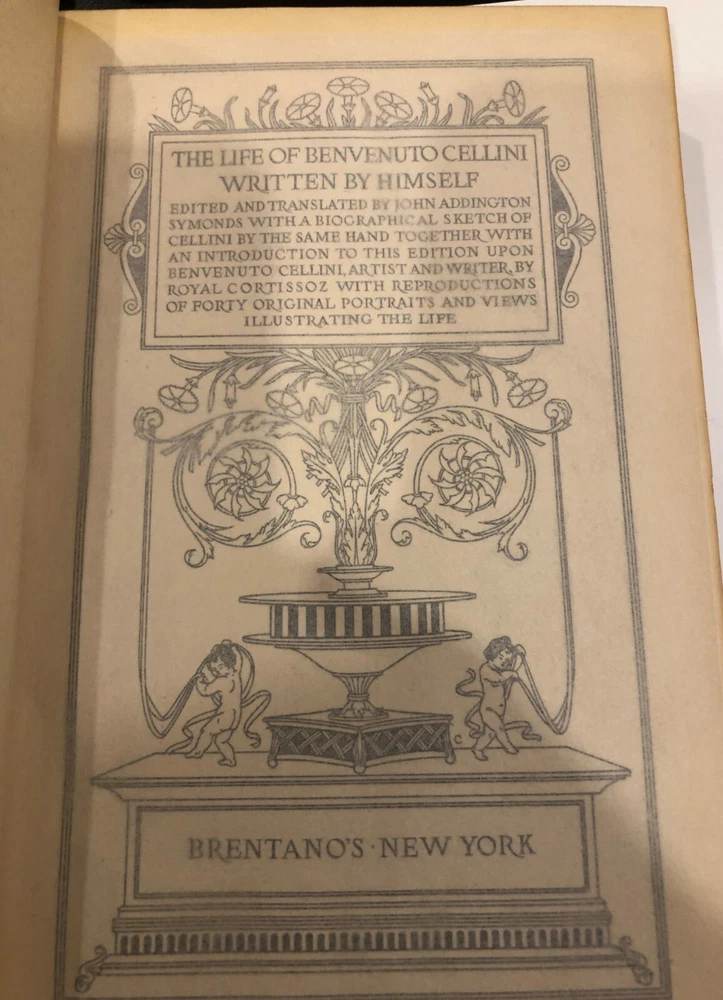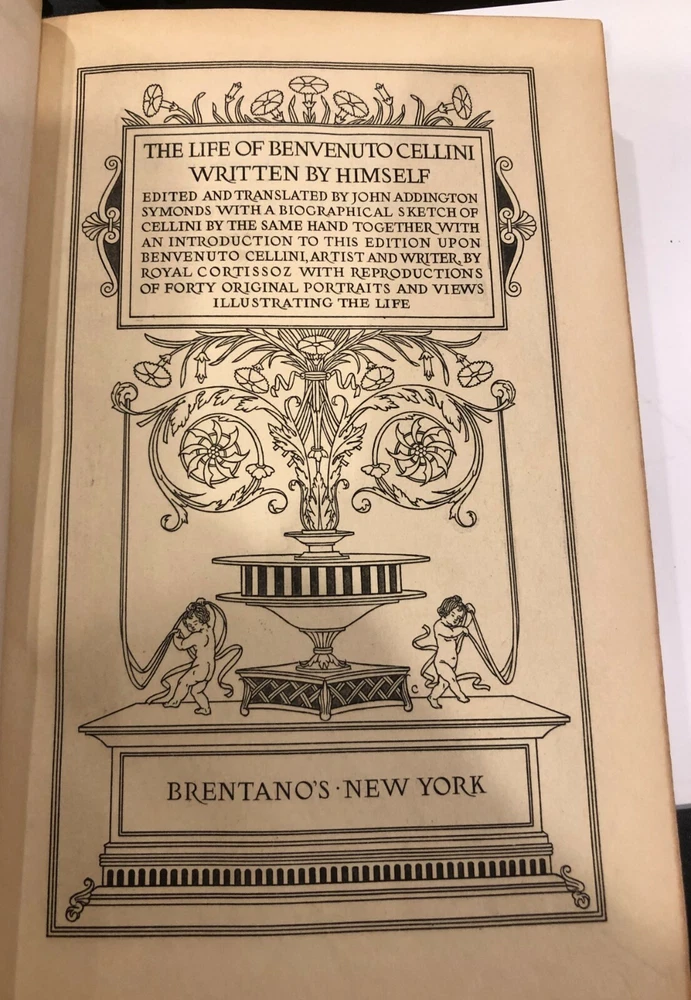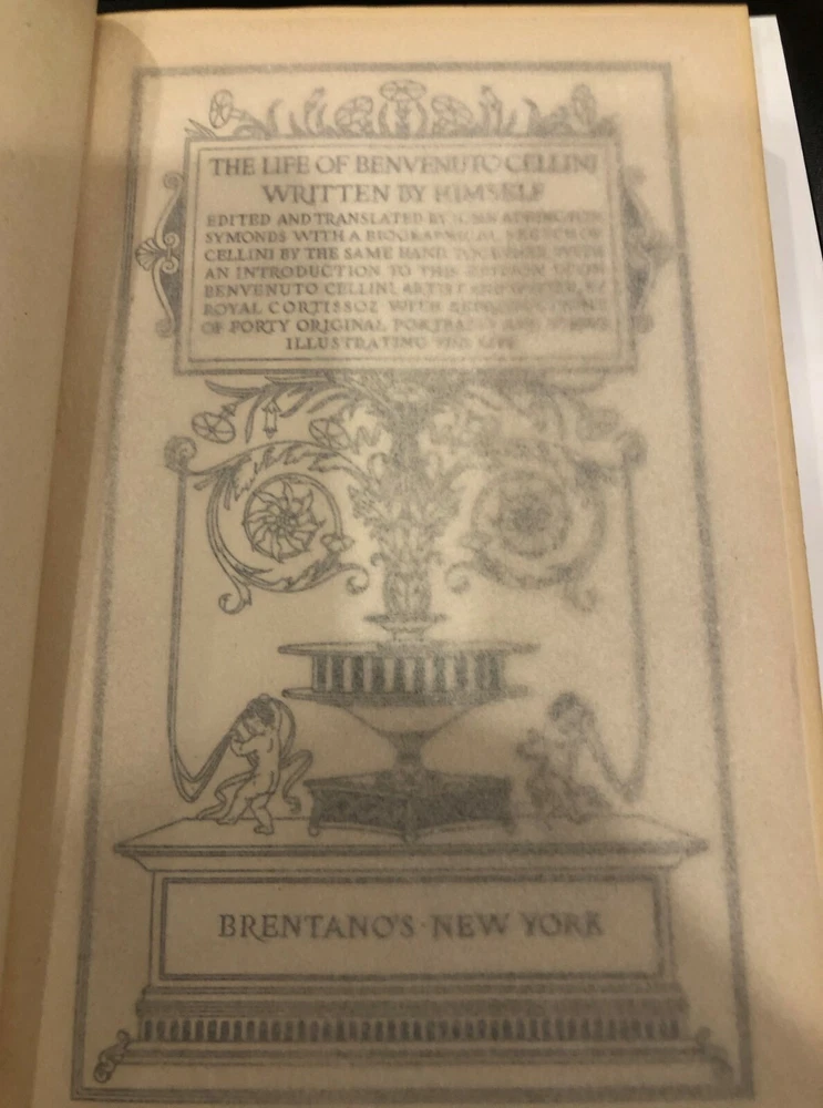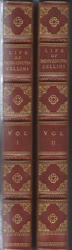 The Life of Benvenuto Cellini Written By Himself – 2 Volumes Beautiful Leather in Very Good plus to Near Fine condition! Leather boards with marbled end papers (see photos); gilt borders and lettering; Illustrated with forty tissue-protected photogravure reproductions. Includes Notes, Pedigree of Cellini, and detailed Index Volume I and Volume II First Edition, thus Copyright 1906 Published by Brentano’s – New York Both books in Very Good plus to Near Fine condition – not ex-library; no stamps, markings, etc. other than a very light pencil mark on first blank page (noting a shelf location of a former owner); covers clean and writing on spine clear and bold (see photo); tissue guard paper present in both volumes with no tears or folds Beautiful collectible, gift-worthy copies!!