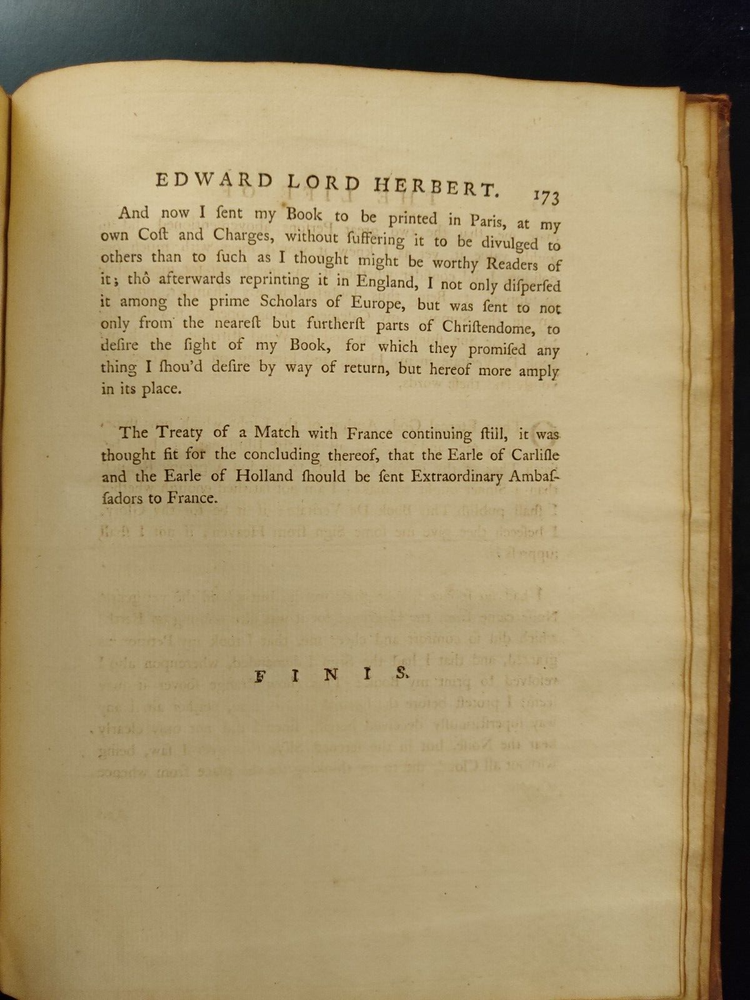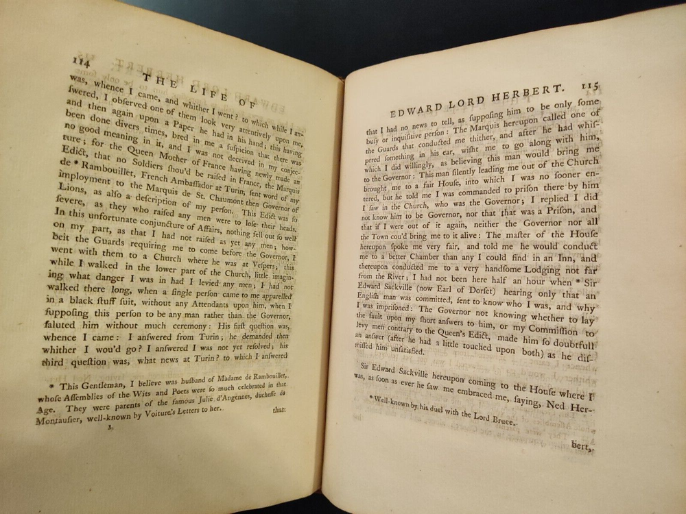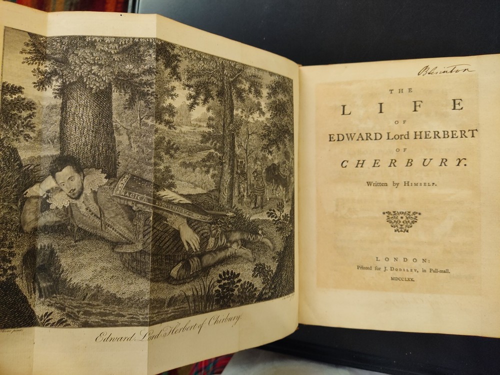 This auction is for a Second Edition volume of "The Life of Edward, Lord Herbert of Cherbury, Written By Himself." Published in 1770. With a fold-out frontispiece depicting Lord Herbert by Anthony Walker. Period calf, spine with raised bands. Faults listed above, otherwise clean pages and good binding. Purchased at auction. Feel free to ask any questions. Good luck and thanks for bidding! . You can bid with confidence. I have been an eBay member in good standing since the 1990's, and continue to receive terrific feedback both as a buyer and a seller. I am not a professional dealer; just a regular guy who buys and sells stuff on eBay when I have something to sell or find something to buy. If you need more photos of an item please just ask.