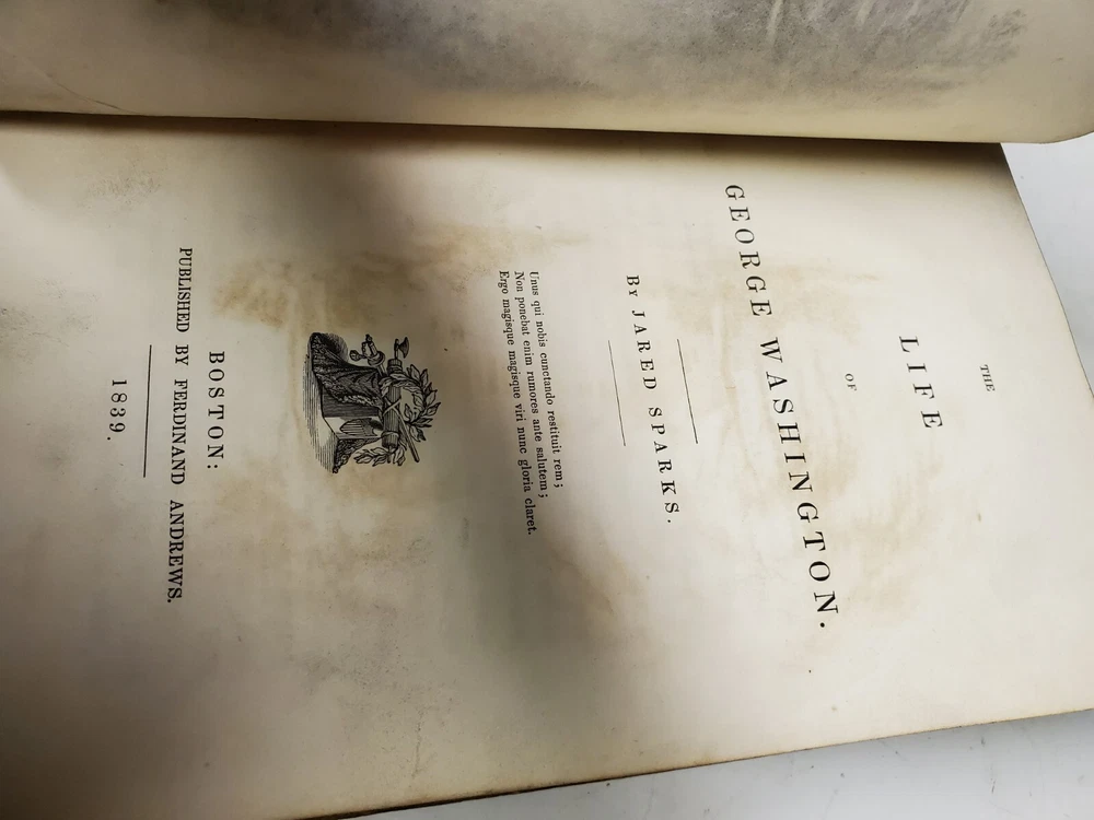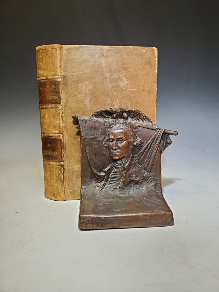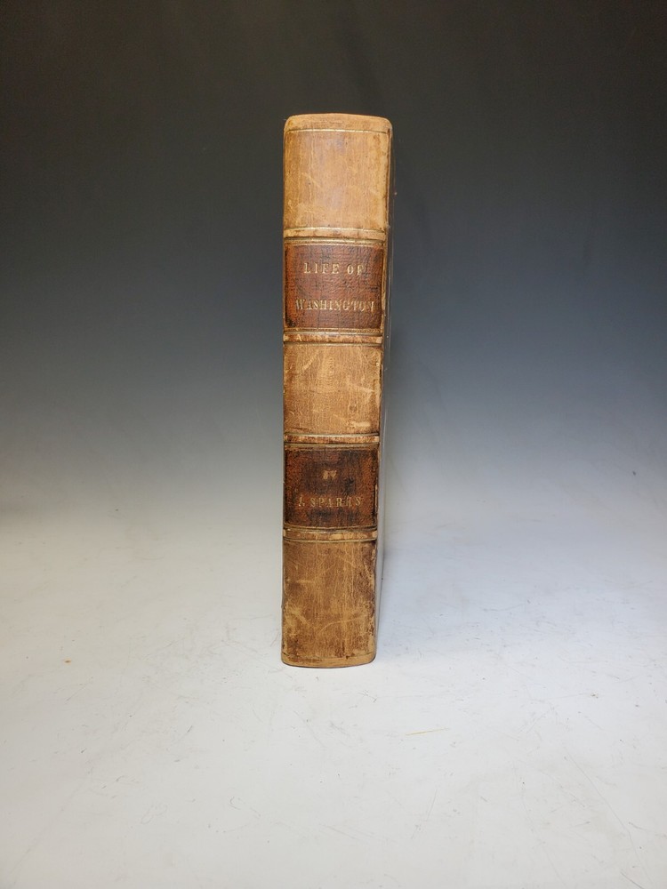 1. SPARKS, Jared. The Life of George Washington. Boston: Jared Sparks, 1839. Full leather binding. Illustrated with engravings of portraits and maps and buildings used in Washington's life. Some overall wear and soiling to full leather bindings. Some damage to paper pages here and there, but overall a very nice copy, and it comes with a Washington bookend. 2. Metal George Washington Bookend. Just one bookend. With some damage to rear. Wear and soiling appropriate to age.