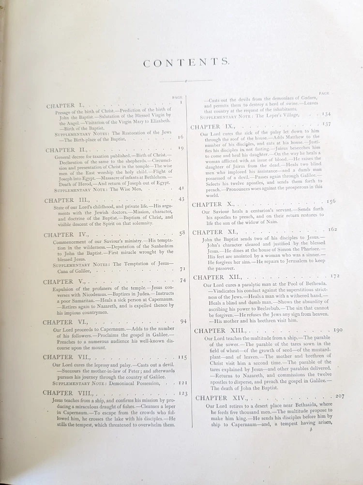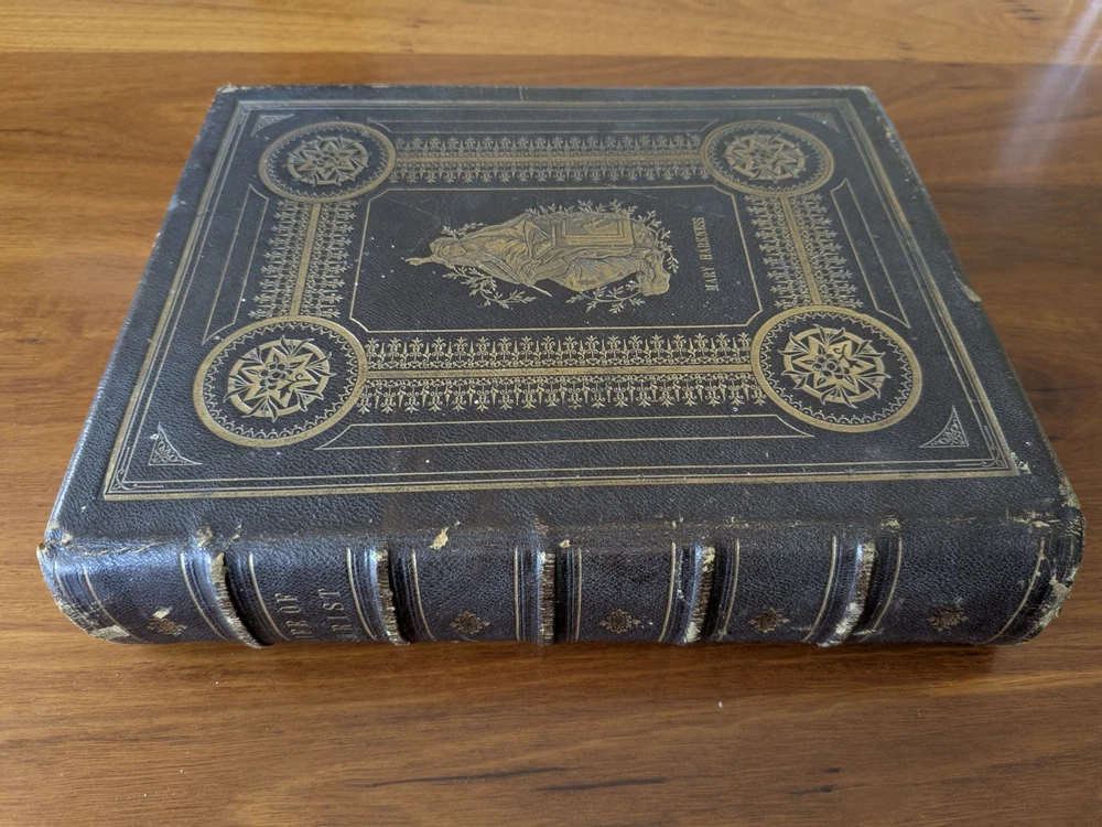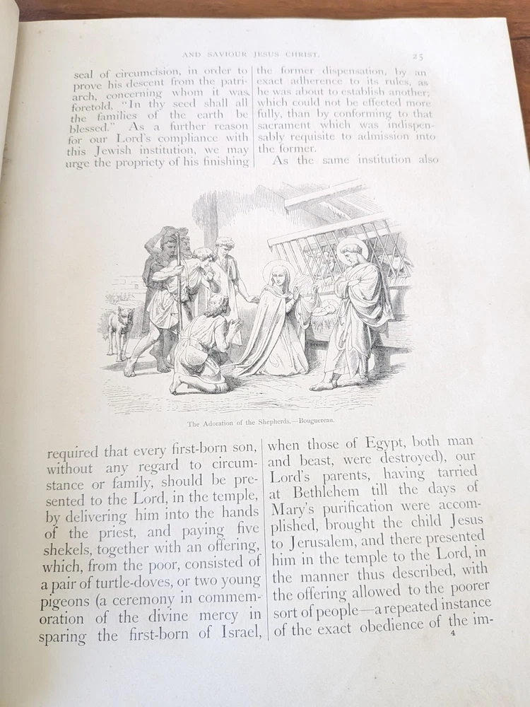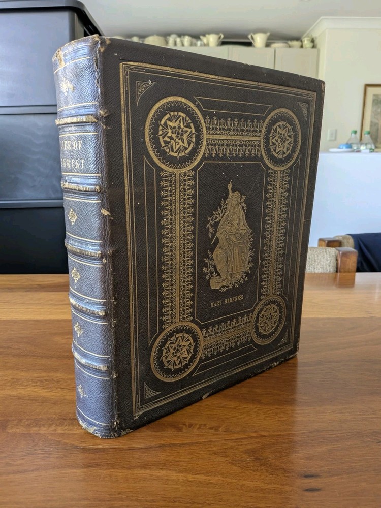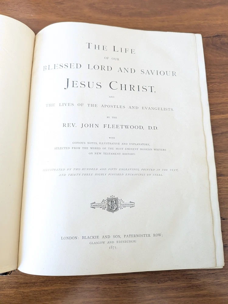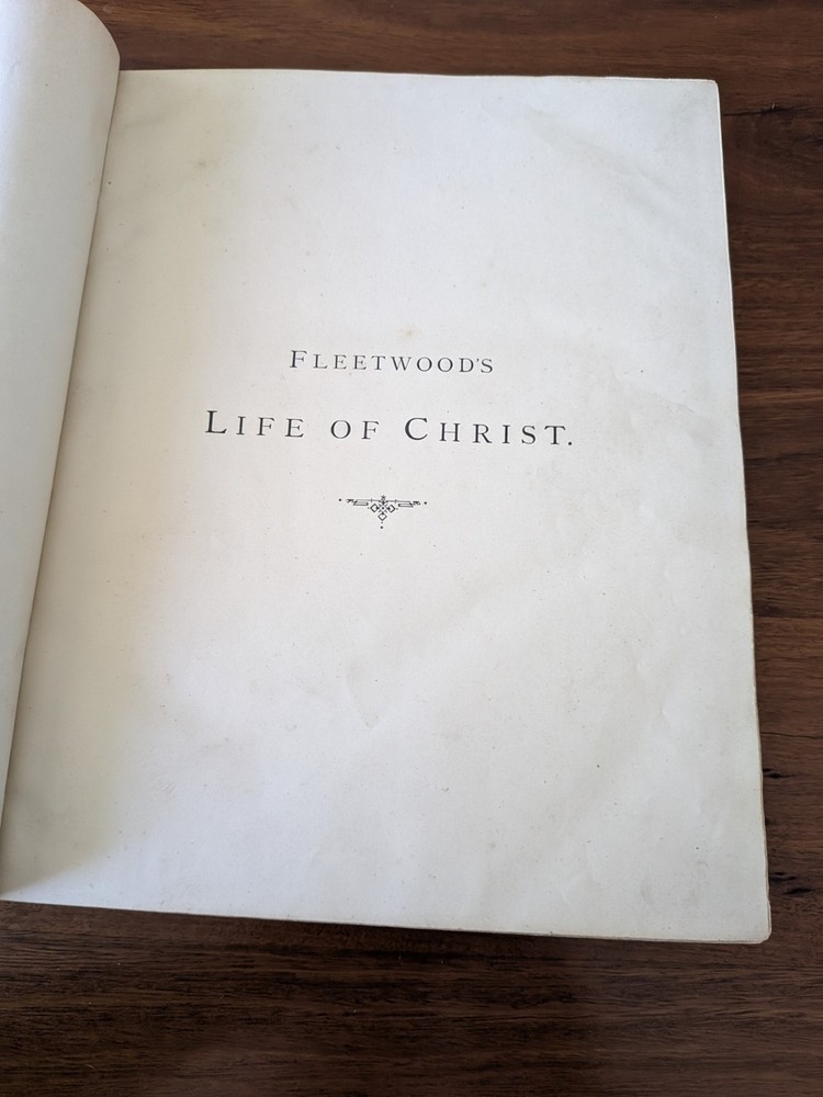 This is a fantastic early 19 th century example of John Fleetwood’s famous book on the life of Jesus. This book uses biblical passages as a basis for this ‘biography’ of the life of Jesus Christ. Fleetwood covers the birth of Jesus, the angelic visitation to Mary, decree of taxation and the massacre of infants, Jesus’s baptism, first miracles, temptation in the desert, calling of disciples, Jesus curing leprosy and palsy, and the trial, crucifixion, and resurrection. Other important topics include: Establishment and differences in sects of the Jews Demolition of Temple of Jerusalem Leprosy found in Samaria Details of the Jewish Council, Sanhedrin Short biographies / lives of the Apostles of Jesus This rare book from 1871 features 250 beautiful engravings, printed in the test and 33 highly finished engravings on steel. It's bound beautifully and embossed with gilt to the front and back cover and the spine. 764 pages.