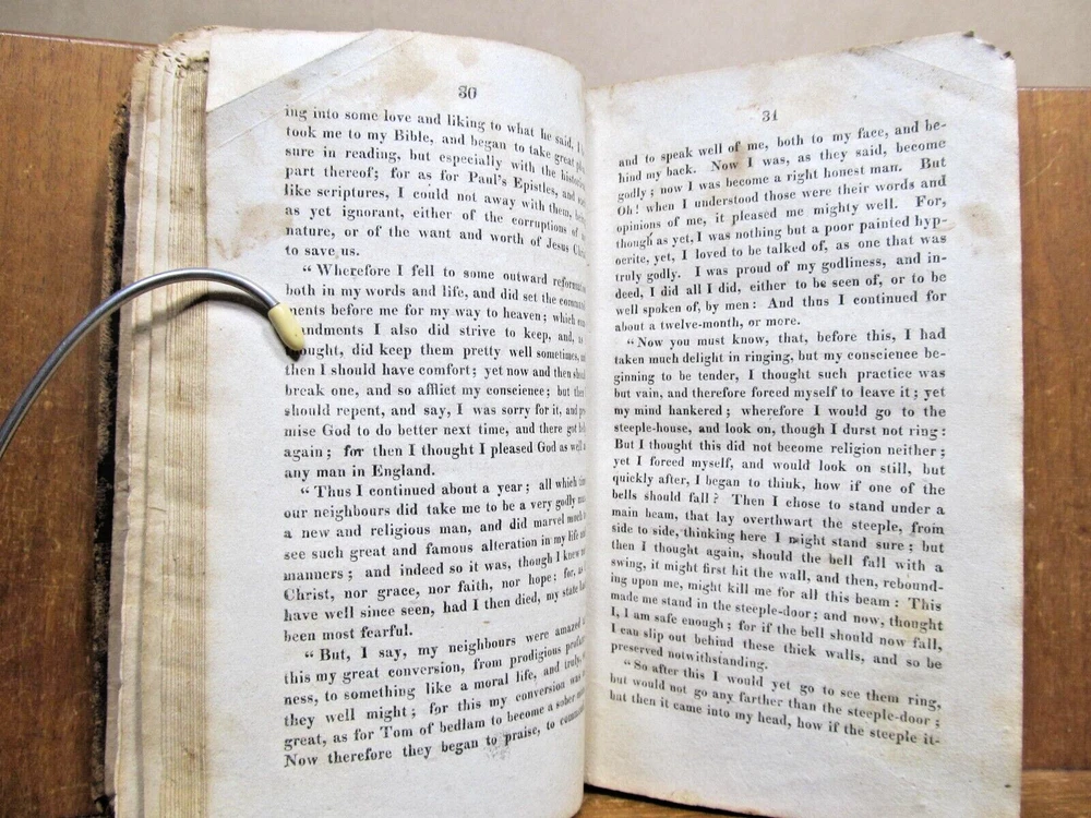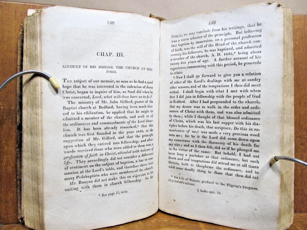 THE LIFE OH JOHN BUNYAN, Author of the "Pilgrim's Progress" in which is exemplified the Power of Evangelical Principles by JOSEPH IVIMEY, First American Edition, Boston, 1814. Description: Full leather covers with gilt title on spine. Engraving illustrated frontis. Condition: Fair. Covers show wear and rubbing, but are securely attached to spine. Top right corner has been nibbled by a hungry rodent. Staining, foxing and age toning throughout, but pges are tight to the spine. (see photos) Pages: 307 Size: 4.5" x 7" Weight: 10 ozs Joseph Ivimey (1773-1834) was an English Particular Baptist minister and historian. John Bunyan (1628-1688) was an English writer and Puritan preacher. He is best remembered as the author of the Christian allegory The Pilgrim's Progress, which also became an influential literary model. In addition to The Pilgrim's Progress, Bunyan wrote nearly sixty titles, many of them expanded sermons. Wikipedia Check out my other current book listings. I will combine shipping for the best rate. Ask if you have questions. No reserve. You bid, it sells! Notice: This book will be shipped book rate. It is slower, but cheaper. Be patient!