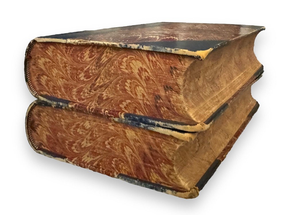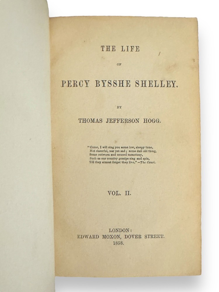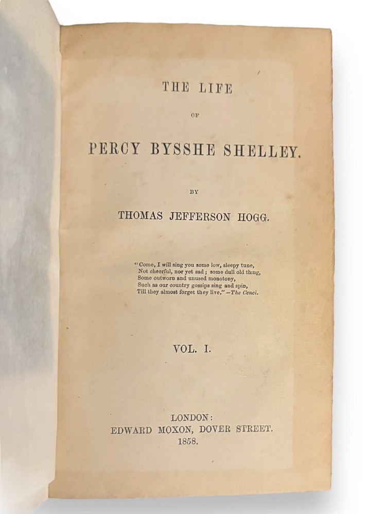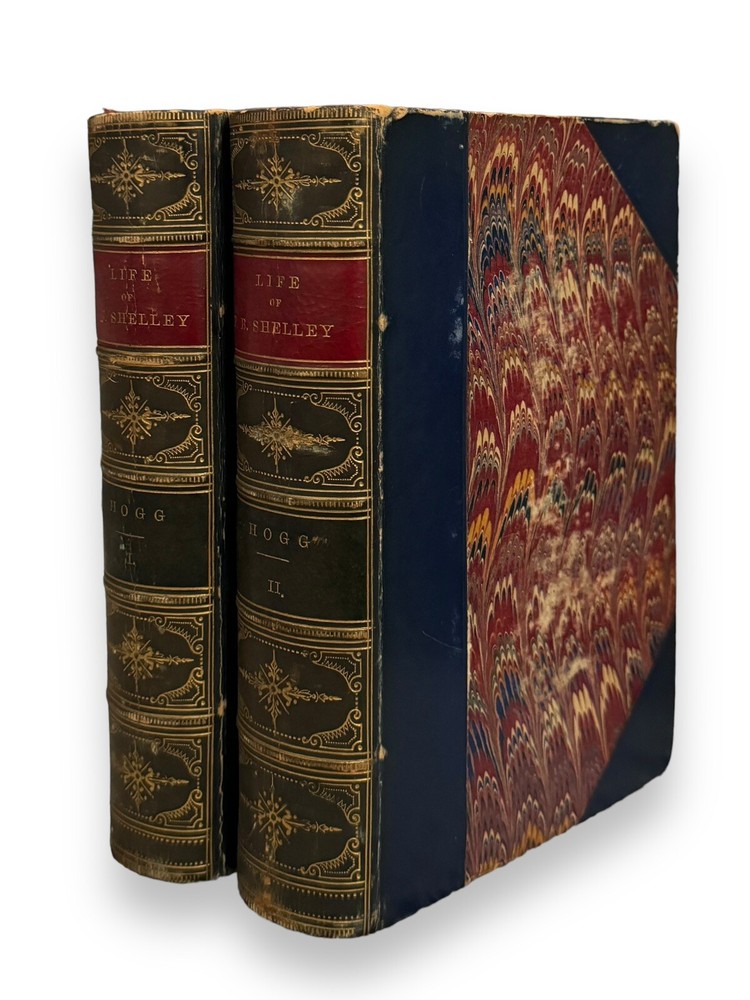Hogg, Thomas Jefferson. The Life of Percy Bysshe Shelley. London: Edward Moxon, 1858. 2 volumes. Beautifully bound in contemporary three-quarter blue Moroccan over marbled boards, spine gilt with titling over red. Marbled endpapers, all edges marbled. Each volume is illustrated with an in-text etching to the rear of the text, volume one contains a frontispiece. Collated complete. These two volumes were all that were published of the author's project to detail the full life of Percy Bysshe Shelley in a four volume set. Volume three was never finished and volume four was never written as the author died before completion. They are now considered a scarce set. The life of Percy Bysshe Shelley, an English Romantic poet known as radical in his poetry as well as in his political and social views. Written by Thomas Jefferson Hogg, a British barrister and writer best known for his friendship with Percy Bysshe Shelley and their collaboration on several literary projects during their time at University College, Oxford. A quite handsome set with some rubbing to leather and bumping to the extremities. Internally, firmly bound. Pages are very bright and clean with the odd spot.