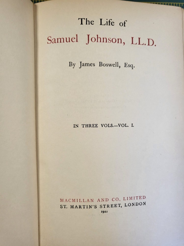 HGG Books presents ... The Life of Samuel Johnson 3 volume leather set complete Author: Boswell, James Publisher: MacMillan Release Date: 1922 Seller Category: Biography Qty Available: 1 Condition: Collectible: Good Sku: johnson3volume Notes: The Life of Samuel Johnson by James Boswell in 3 volumes complete. Part of the Library of English Classics published by MacMillan in 1922. Set is bound in original 3/4 leather and marble boards.Clean pages, tight binding, 3/4 leather boards show heavy wear at the hinges, drying to leather, and light bumping Don't forget to check out other great deals in our eBay Store!!