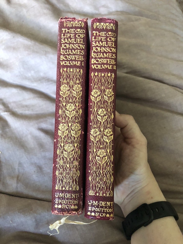 Vintage 1904 everyman’s library leather bound volumes 1 and2 of Boswell’s Life Of Johnson.first few pages of volume 1 have wear because they we’re still stuck together. Spine ends have a little wear. See photos