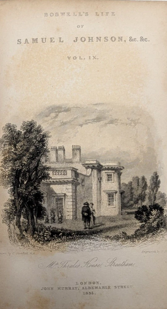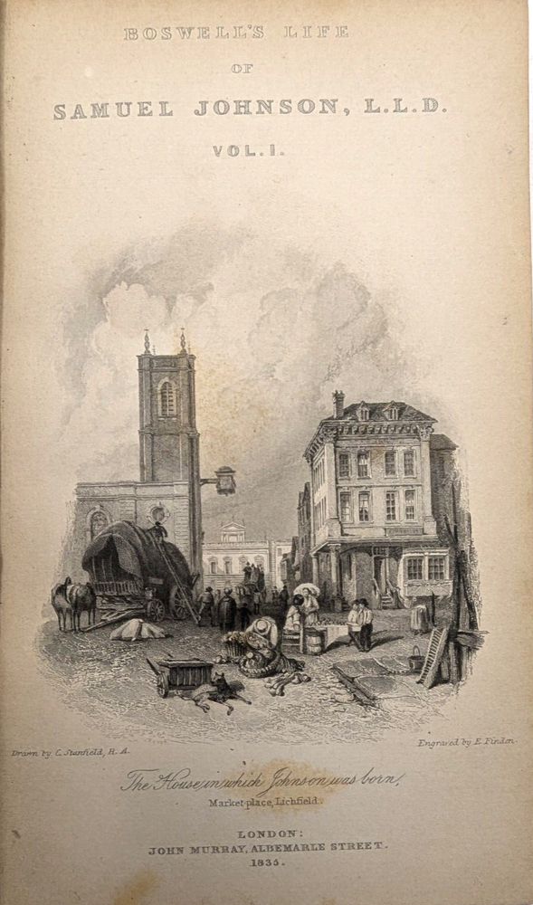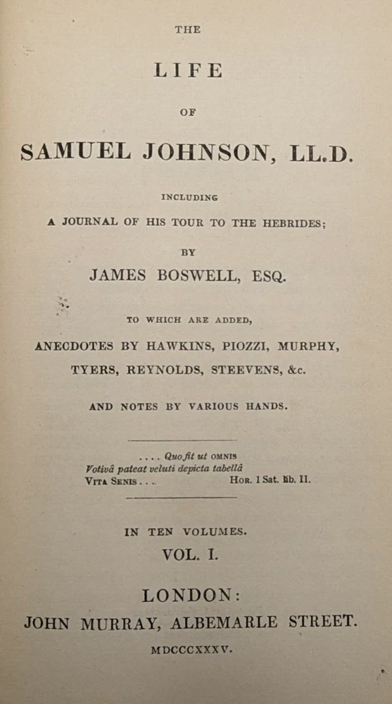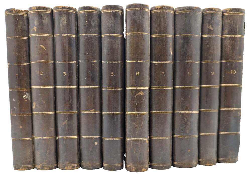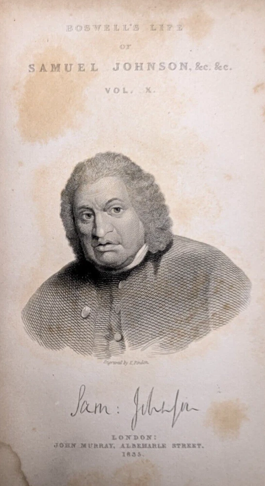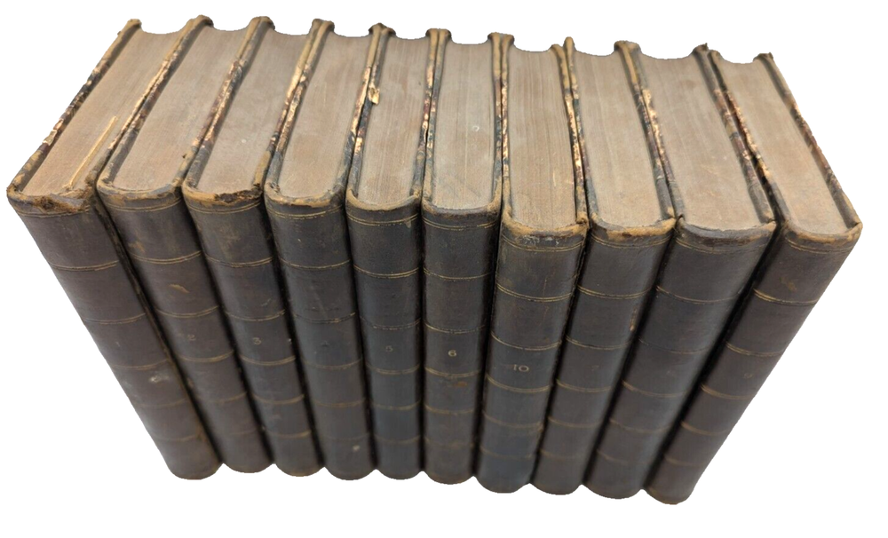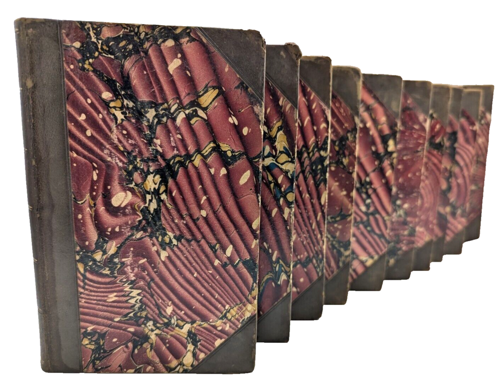 For your consideration is a wonderful, scarce set: "Boswell's Life of Samuel Johnson" 1835 printing from John Murray Publishing in London. Complete, rare, 10 volume leather-bound set. Overall solid condition, though some of the covers have been repaired/reinforced in the hinges as shown in photos 7 and 8, and on volume 10 the reinforcement is slightly visible on the exterior of the hinge.. Otherwise the bindings are in good, solid condition with no loose or missing pages. A great, scarce set approaching 2 centuries old with aged leather you can't buy in Barnes and Noble. Each book if 6.5: x 4.5" and collectively take up about 10" of shelfspace in length. FREE shipping to the USA and we're happy to ship internationally at cost. Thanks for looking!
