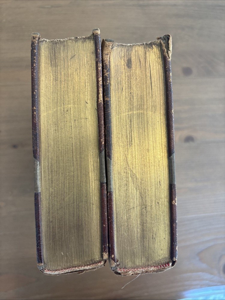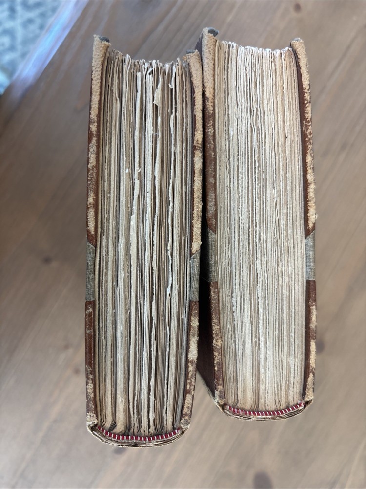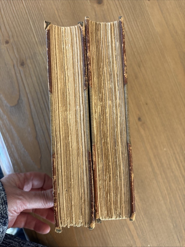 This two volume set is in age-appropriate condition. Some wear, especially along the top and bottom of the spine. There are no markings on the text and it is clean and clear. There is some pencil markings on the top left corner of the first page. See pictures