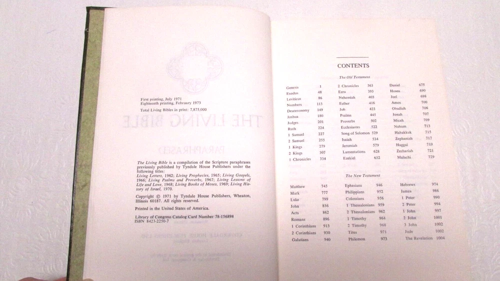 DESCRIPTION: You are purchasing a The Living Bible Paraphrased TYNDALE Hardcover Green Leather Red Letter 1973. ISBN:842322507 ***written dedication on inside front page, no other writing, no tears, corner and edge bumped and minimal wear, please see pictures*** This comes from a smoke free home! I will combine shipping on multiple purchases! (book 54) SHIPPING INFO: Buyer to pay shipping costs. Items sold as is! Item to be sent via USPS. BIDDING and PAYMENT INFO: Winning bidder must make payment within 3 days of close of auction or item will be re-listed. ***BEFORE BIDDING*** * Please see pictures for more detailed information and condition of item; pictures are part of description. * Descriptions are to the best of my ability, remember what might be excellent or good condition to me may not be excellent or good to you. Please inquire with any questions. * Please see pictures for more detailed information and condition of item; pictures are part of description. * Most items are used & are sold "As is" unless noted differently in the description. You will get what is pictured. Multiple pictures with different views are taken to show condition. * Due to the item's age do not expect items to be in perfect condition and I may not describe every little scratch or spot. * Please note 'used' or 'previously owned' items will to some degree show some signs of normal use such as scuffs, scratches, chips, creases, small dings/dents, rust, spots, stains, dirt, dust, signs of installation/removal, previous owners name/initials and may have wear that you would not expect from purchasing a new item and any more noteworthy condition issues than such will be mentioned above. Item may need cleaning. * I have no control over shipping costs. It is what it is. All items are sold as is, where is. I will only accept returns if you find that I have misrepresented myself. Most of my items are vintage and will naturally show wear from age and use. This is an auction, and the sale of this item will be considered final. I have endeavored to photograph and accurately describe every item as to its condition and authenticity to the best of my ability. I am happy to answer any questions during the auction! PAYMENT: Payment must be received within 3 days of the closing date of the auction. Email me if you have any questions about payment. Your order will be shipped to the address registered with Ebay. If you want the item shipped to a different address, you must email me and receive a confirmation of your request. Otherwise, the item will be shipped to the registered address.
