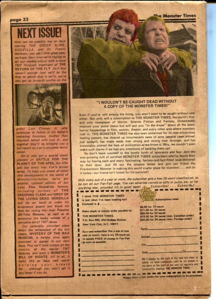 Monster Times Issue: 22 / Year: May 1973 Condition: VG Monster magazine in newspaper format. Godzilla, EC comics, Green Slime, Robert Kline portfolio review, more. Lots of horror film photos & info. Publisher: Sku: U14-16-075 Over 100,000 mail orders processed! Buy with confidence.